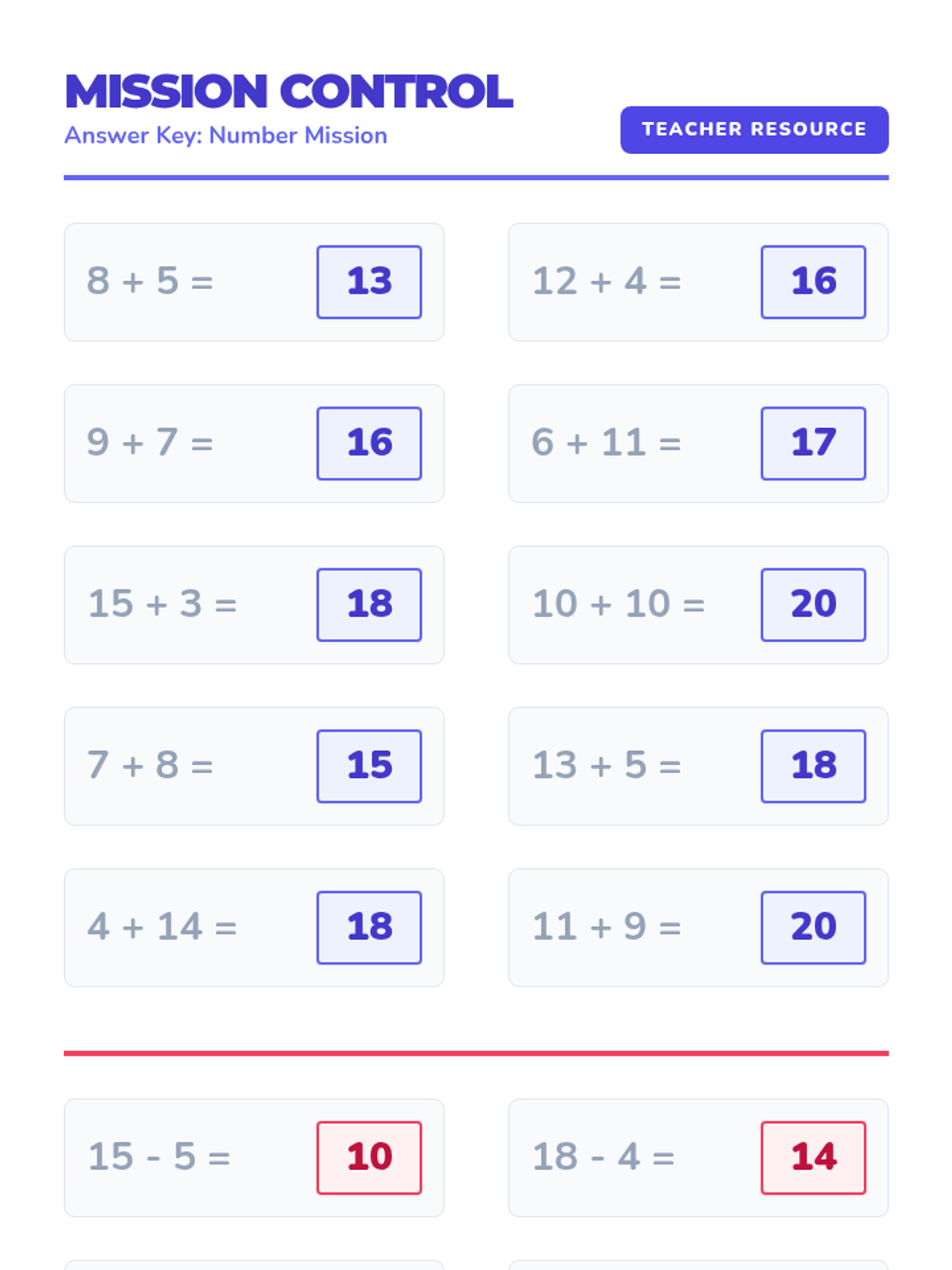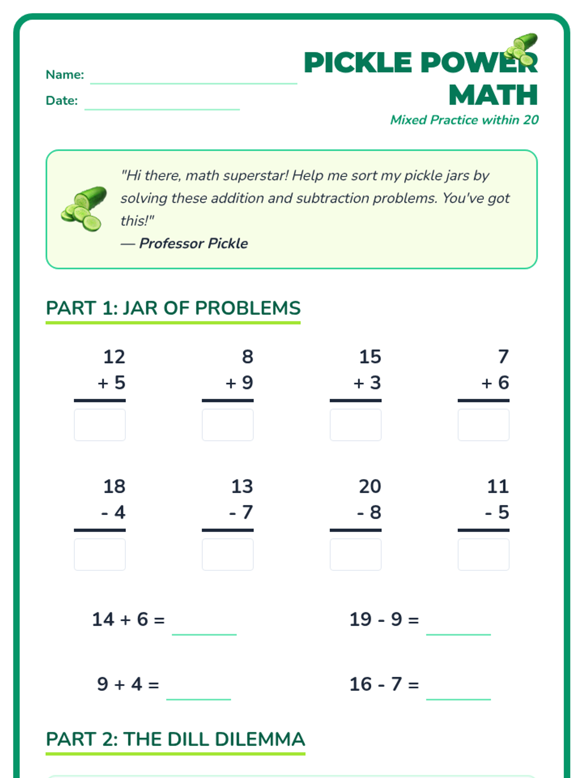 Add and Subtract Within 20Addition and subtraction strategies for numbers up to 20, including regrouping and word problem applications. Strengthens mental math skills and builds fluency with basic facts.
