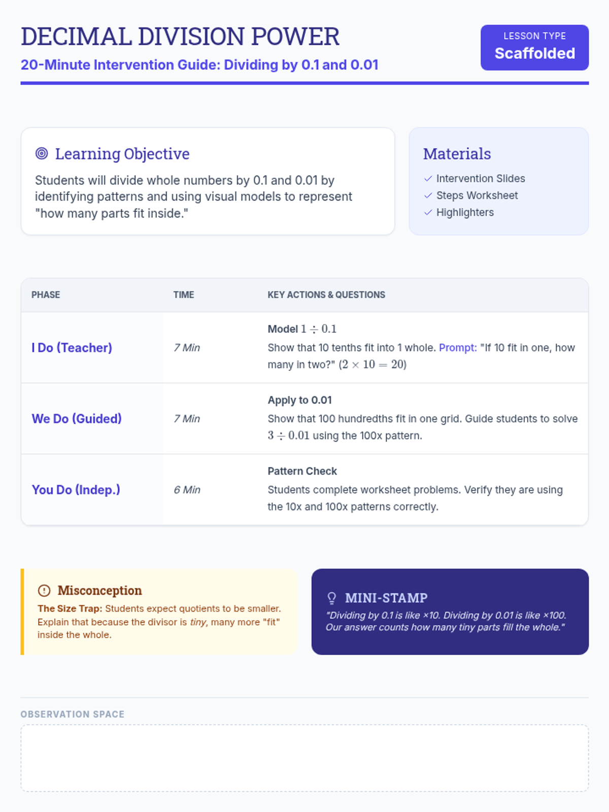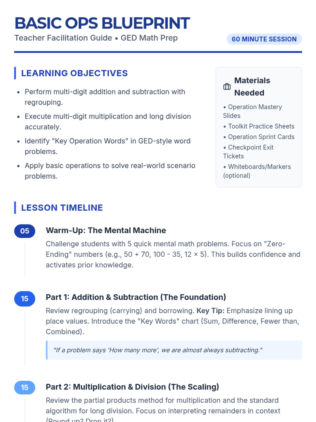 A comprehensive 60-minute introductory lesson on basic arithmetic operations (addition, subtraction, multiplication, and division) tailored for GED preparation, focusing on both computation and word problem translation.