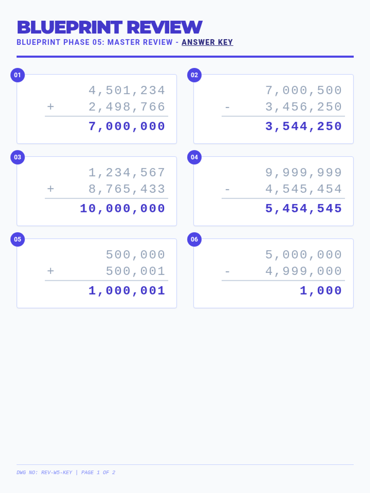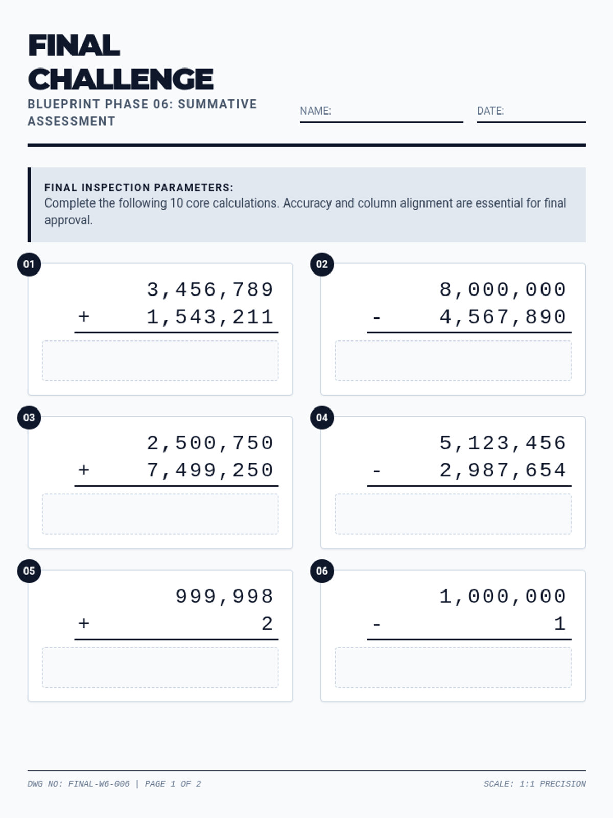 A summative assessment covering 6+ digit addition and subtraction with various levels of complexity.
