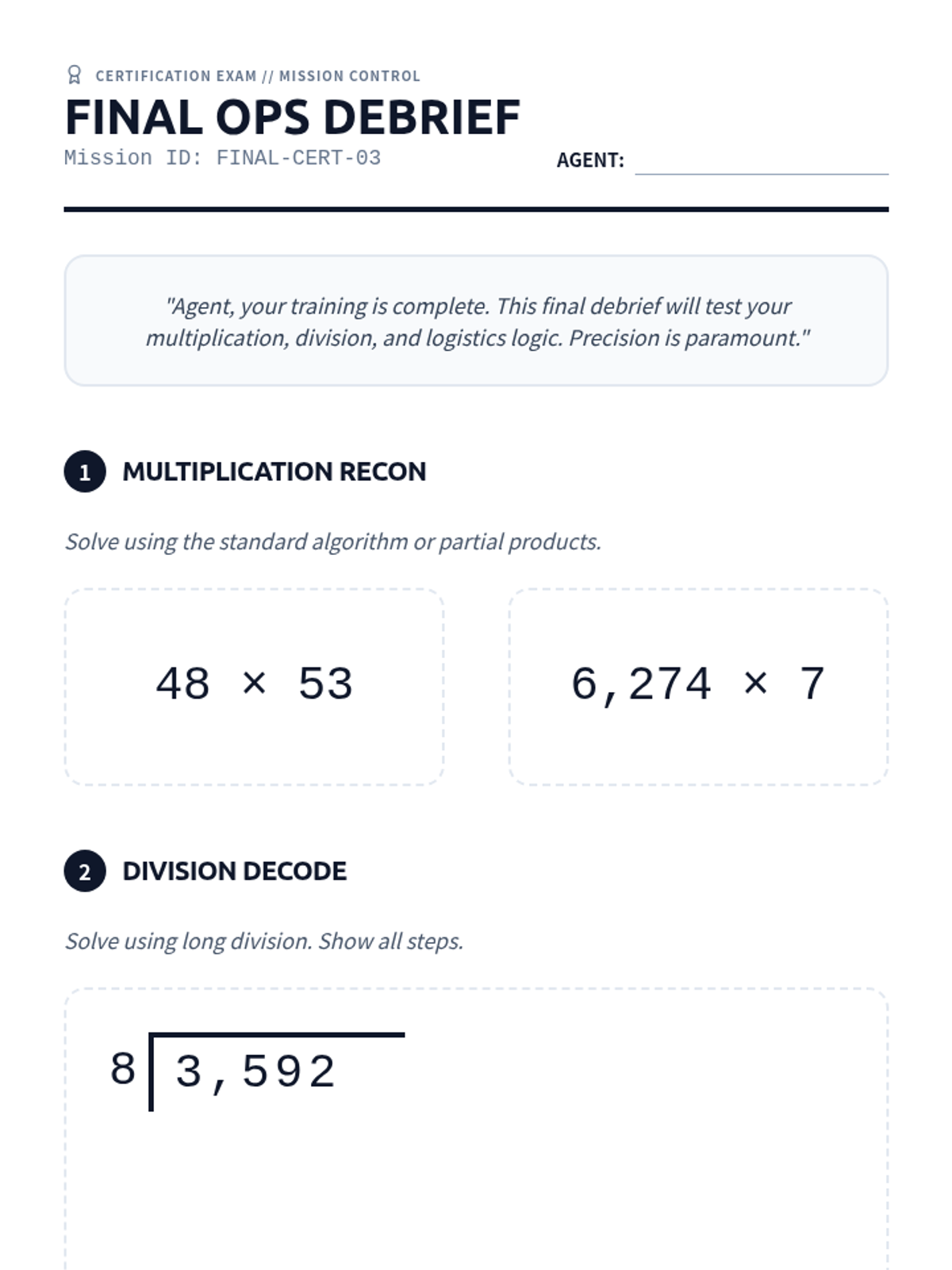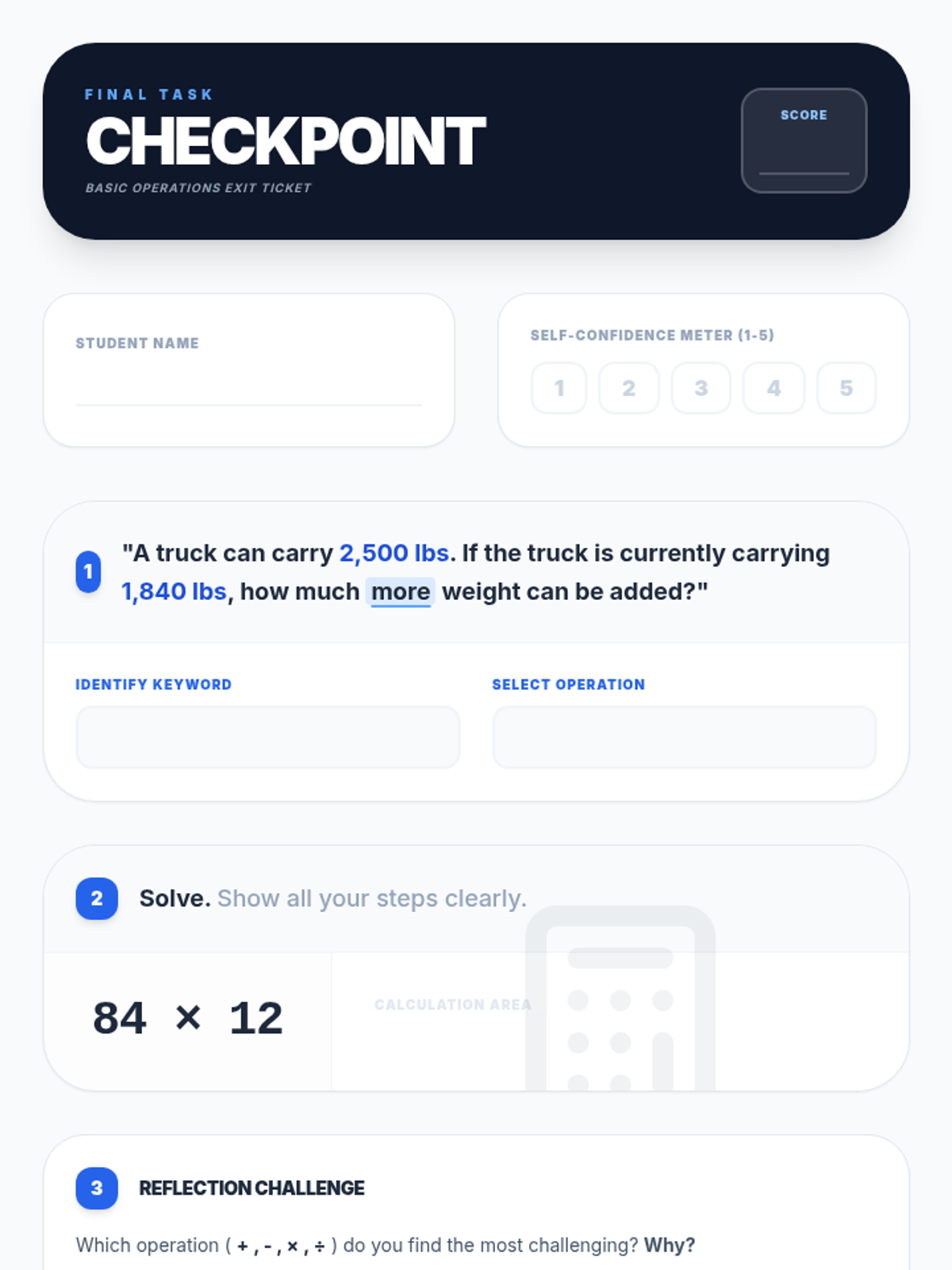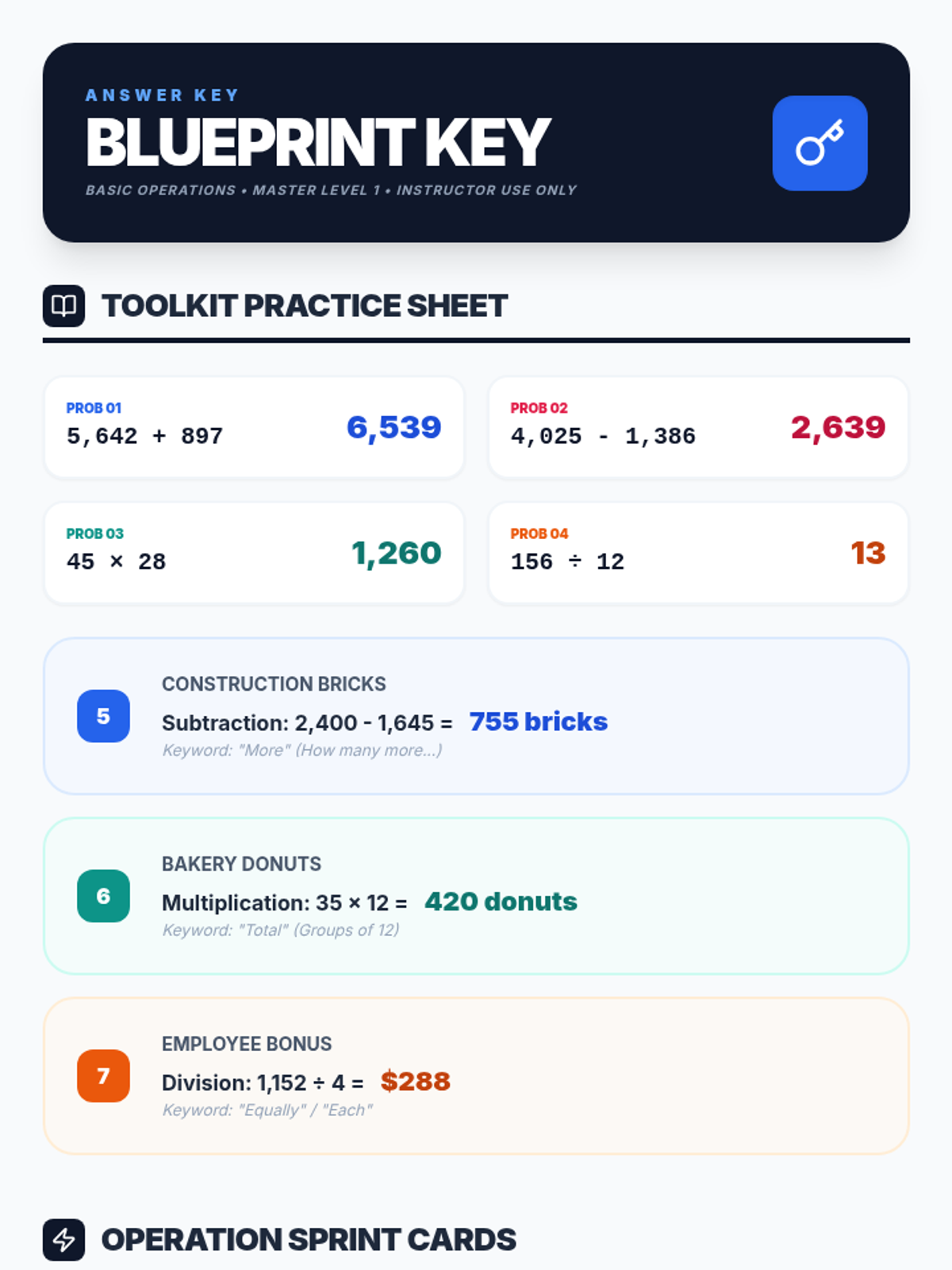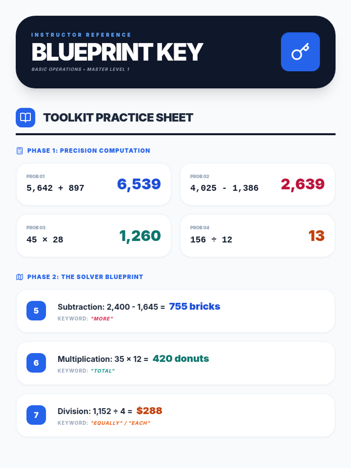 Four Operations Problem SolvingAddition, subtraction, multiplication, and division applications within complex word problems. Strengthens the ability to translate scenarios into mathematical equations and execute multi-step solutions.