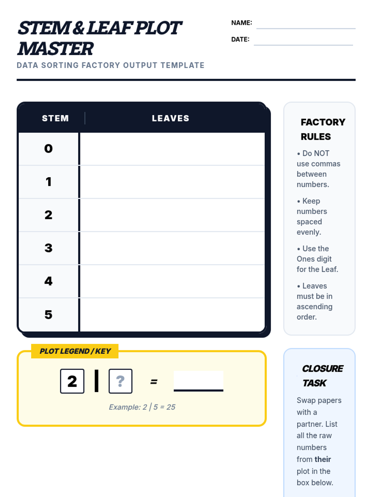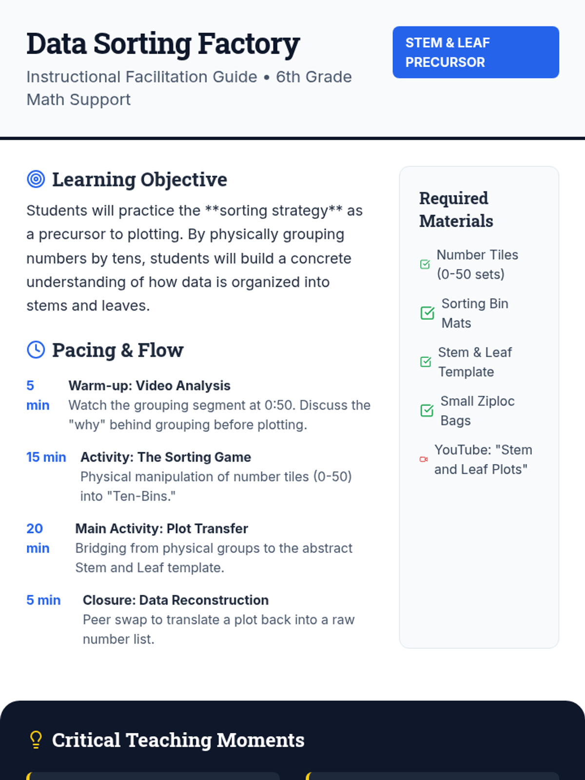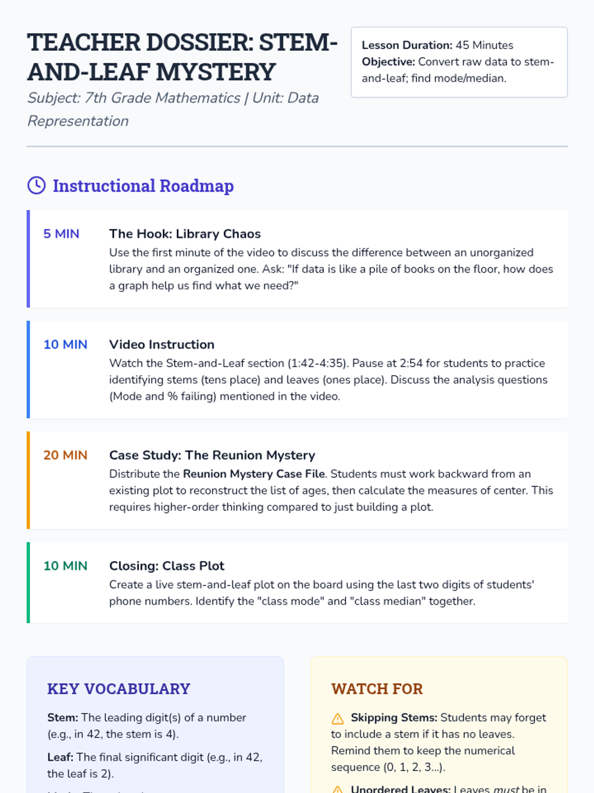 This lesson helps students transition from a concrete list of numbers to an organized stem and leaf plot using a physical sorting strategy. It includes a video warm-up, a hands-on 'Number Tile' sorting game, and a guided template for creating the final plot.