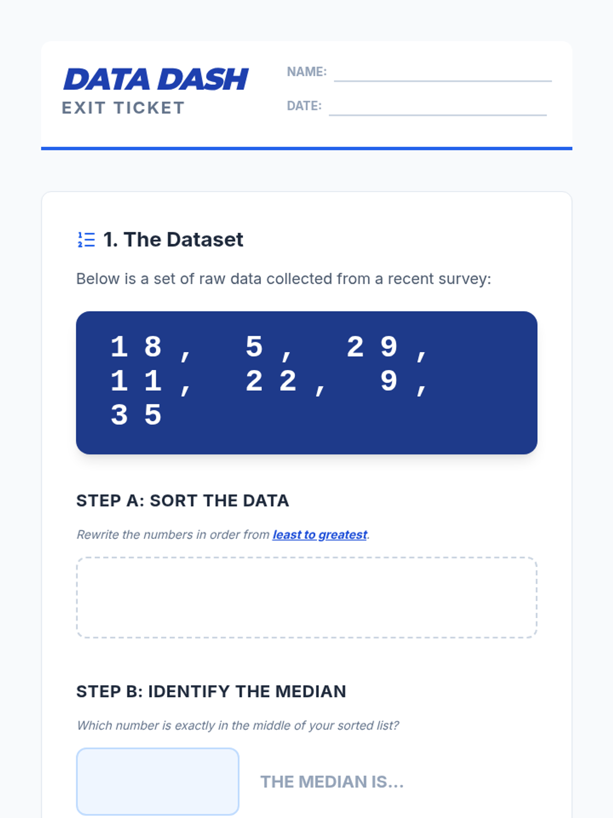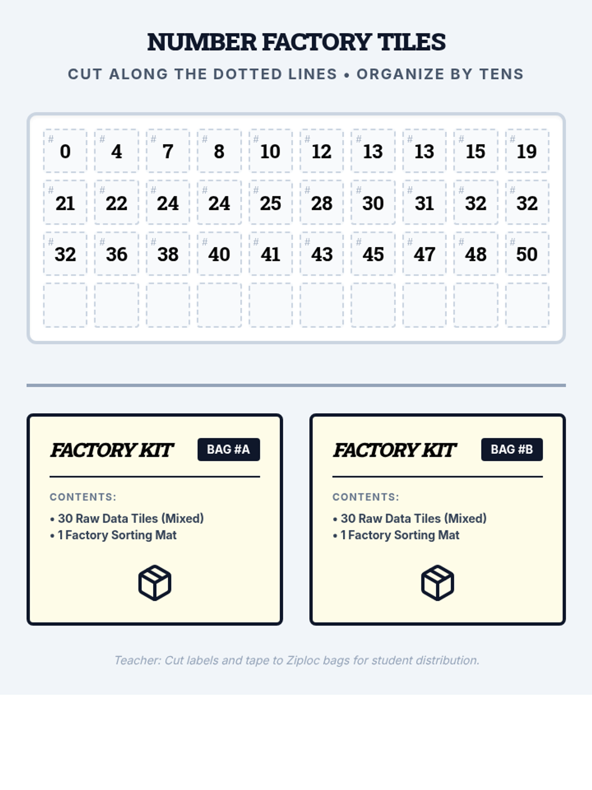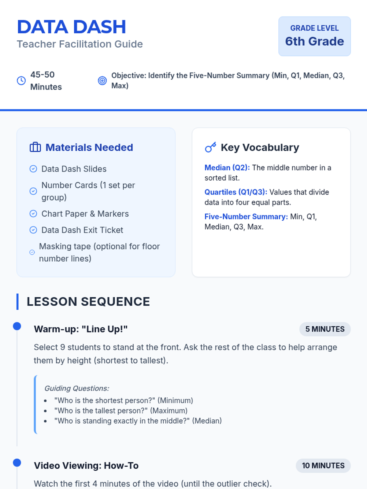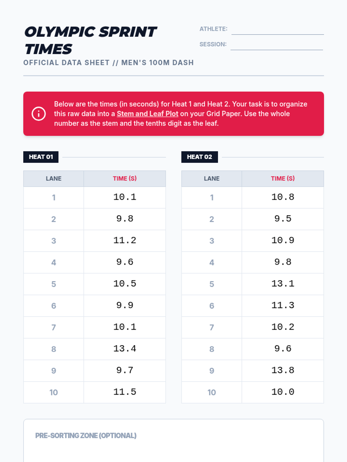 This lesson helps students transition from a concrete list of numbers to an organized stem and leaf plot using a physical sorting strategy. It includes a video warm-up, a hands-on 'Number Tile' sorting game, and a guided template for creating the final plot.