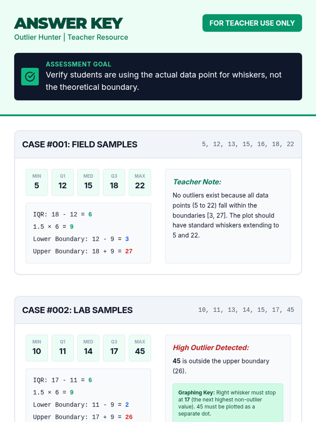 A mathematics lesson where students learn to identify outliers using the 1.5xIQR rule and graph them accurately on box and whisker plots.