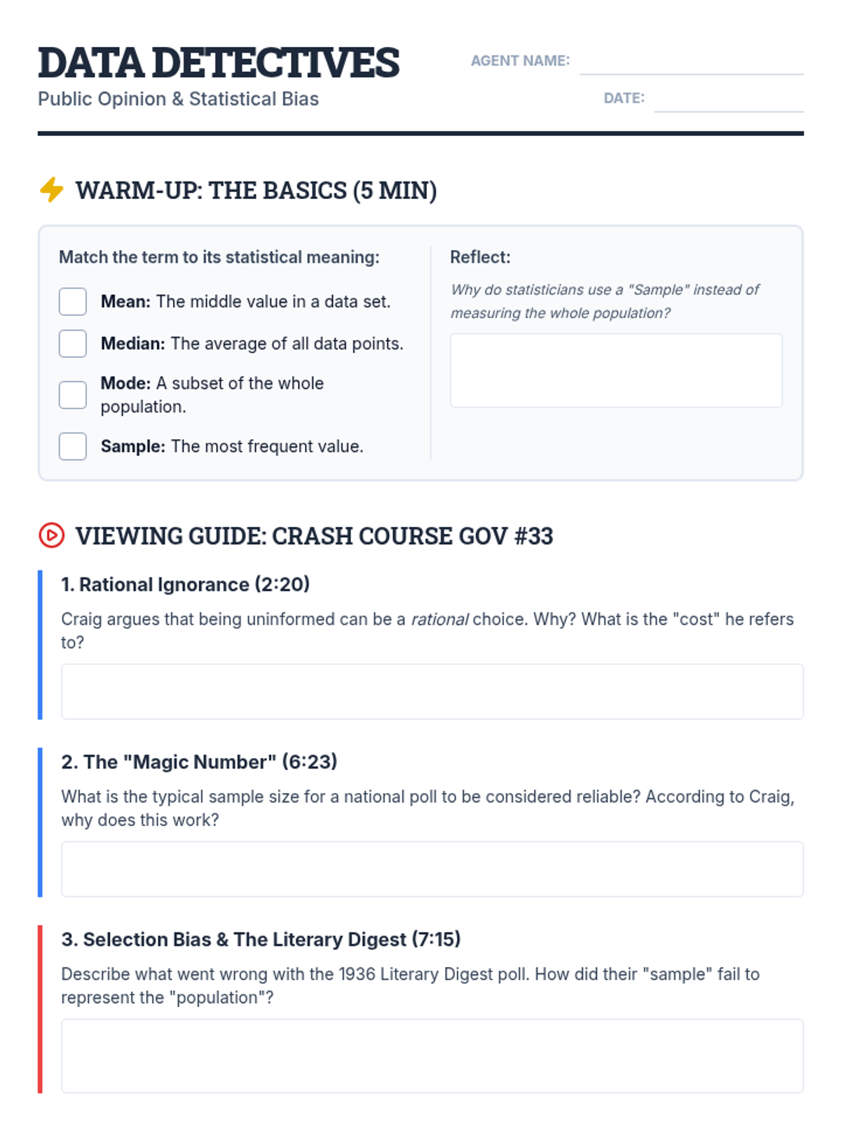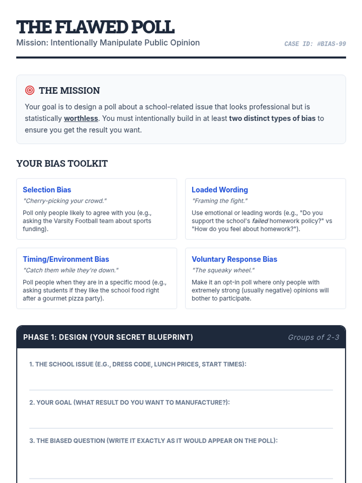 A high school statistics lesson focused on identifying and creating biased polls to understand sampling error and selection bias in political contexts.