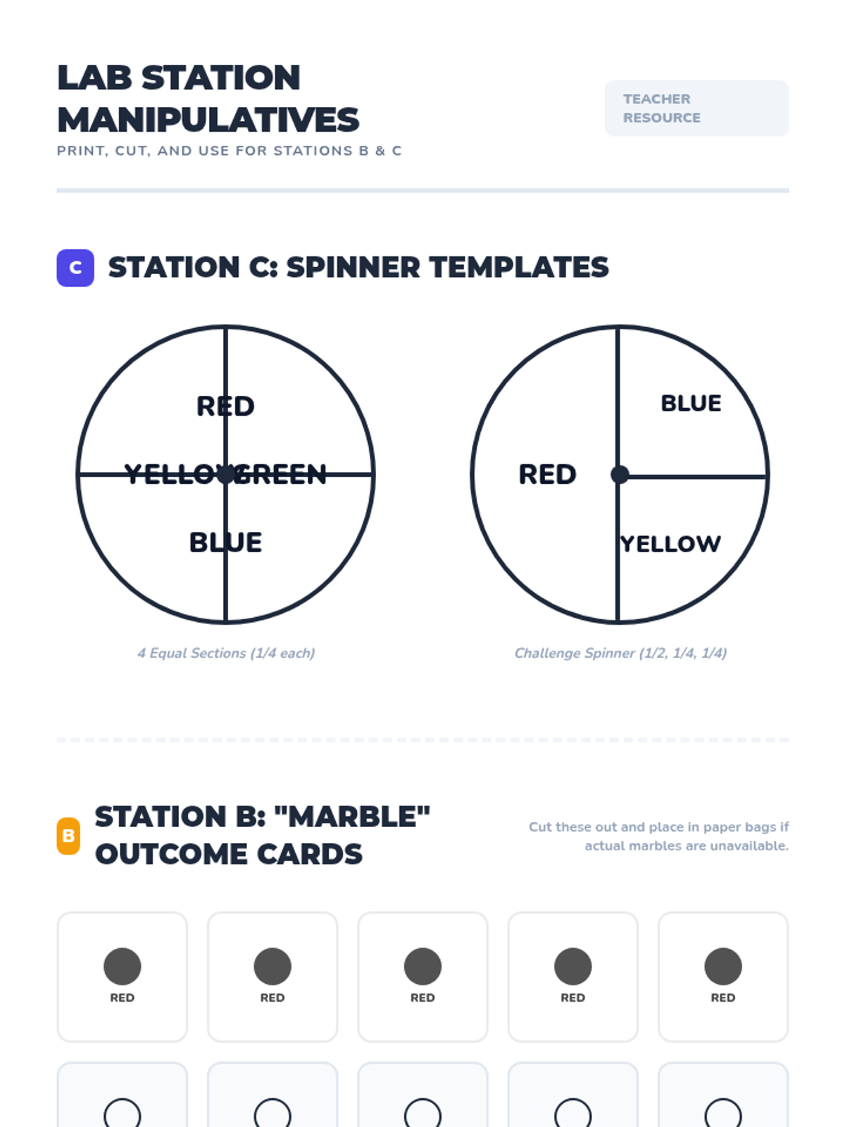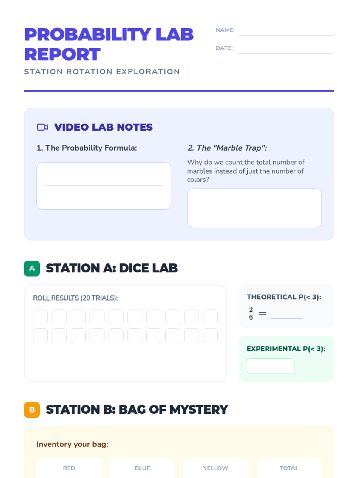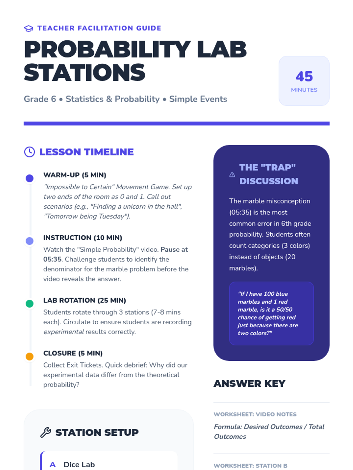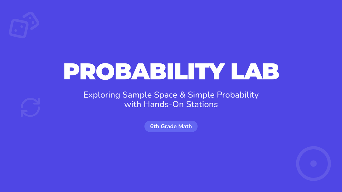Students explore simple probability and sample space through a station-based lab, using dice, marbles, and spinners to calculate P(event) while addressing common misconceptions.