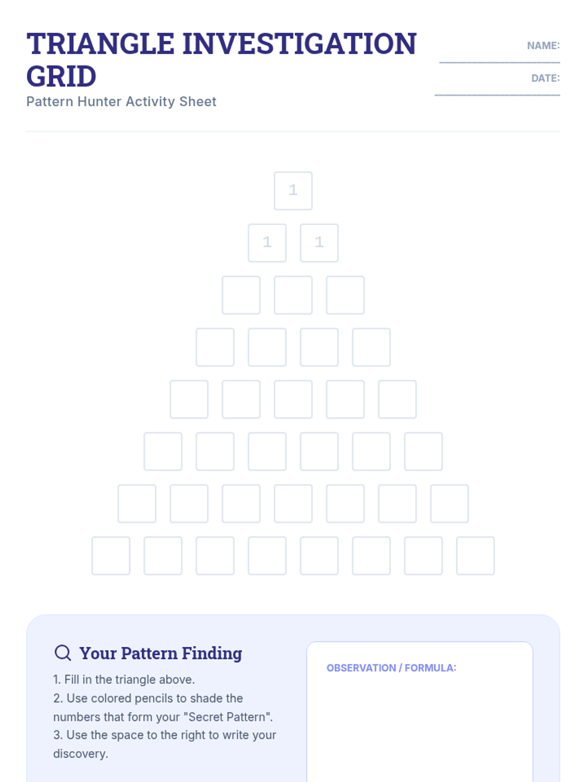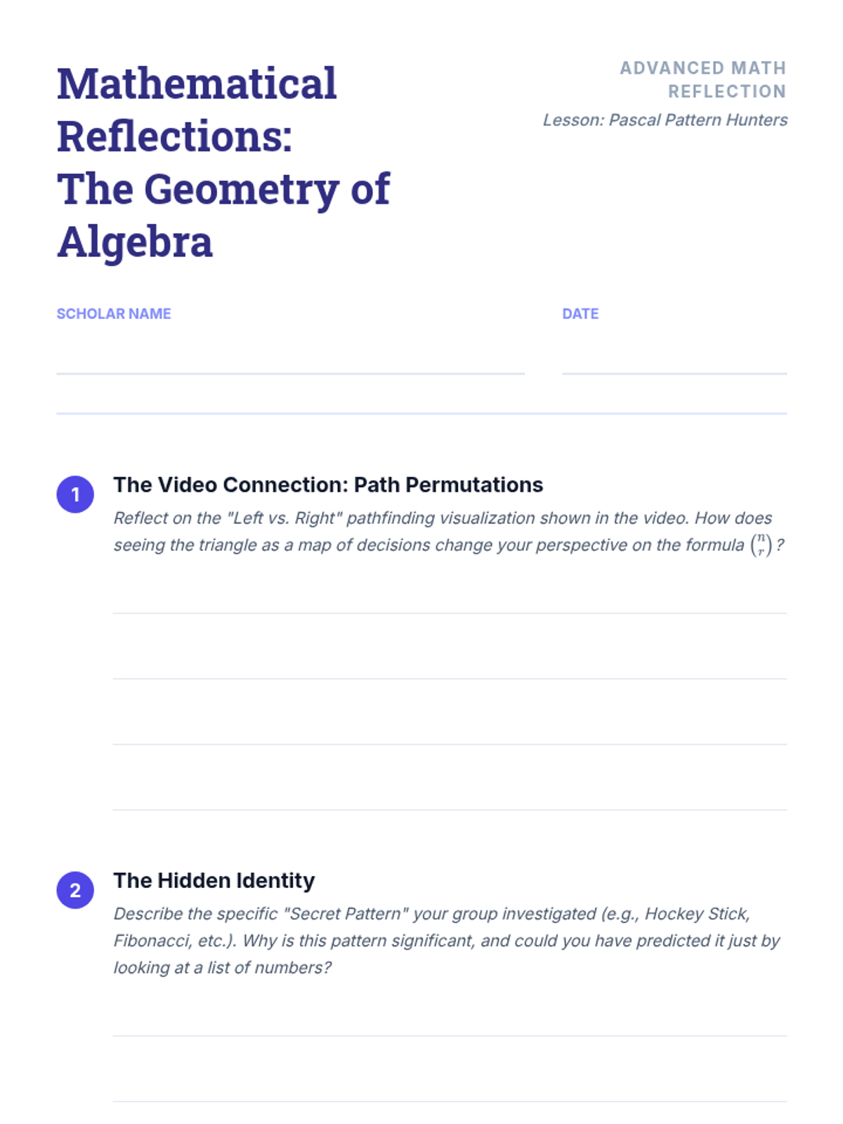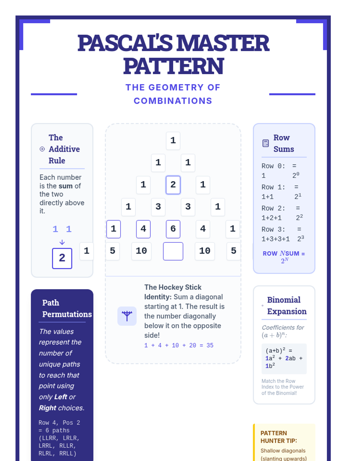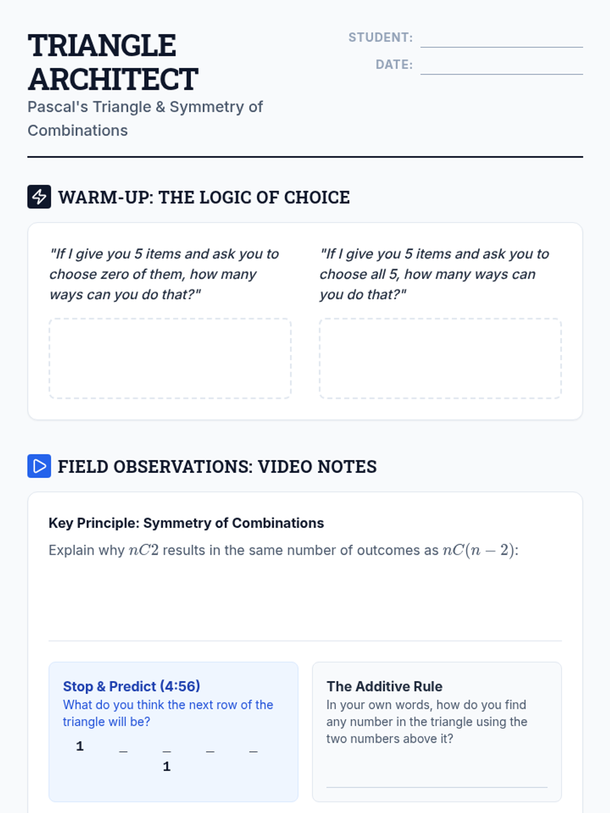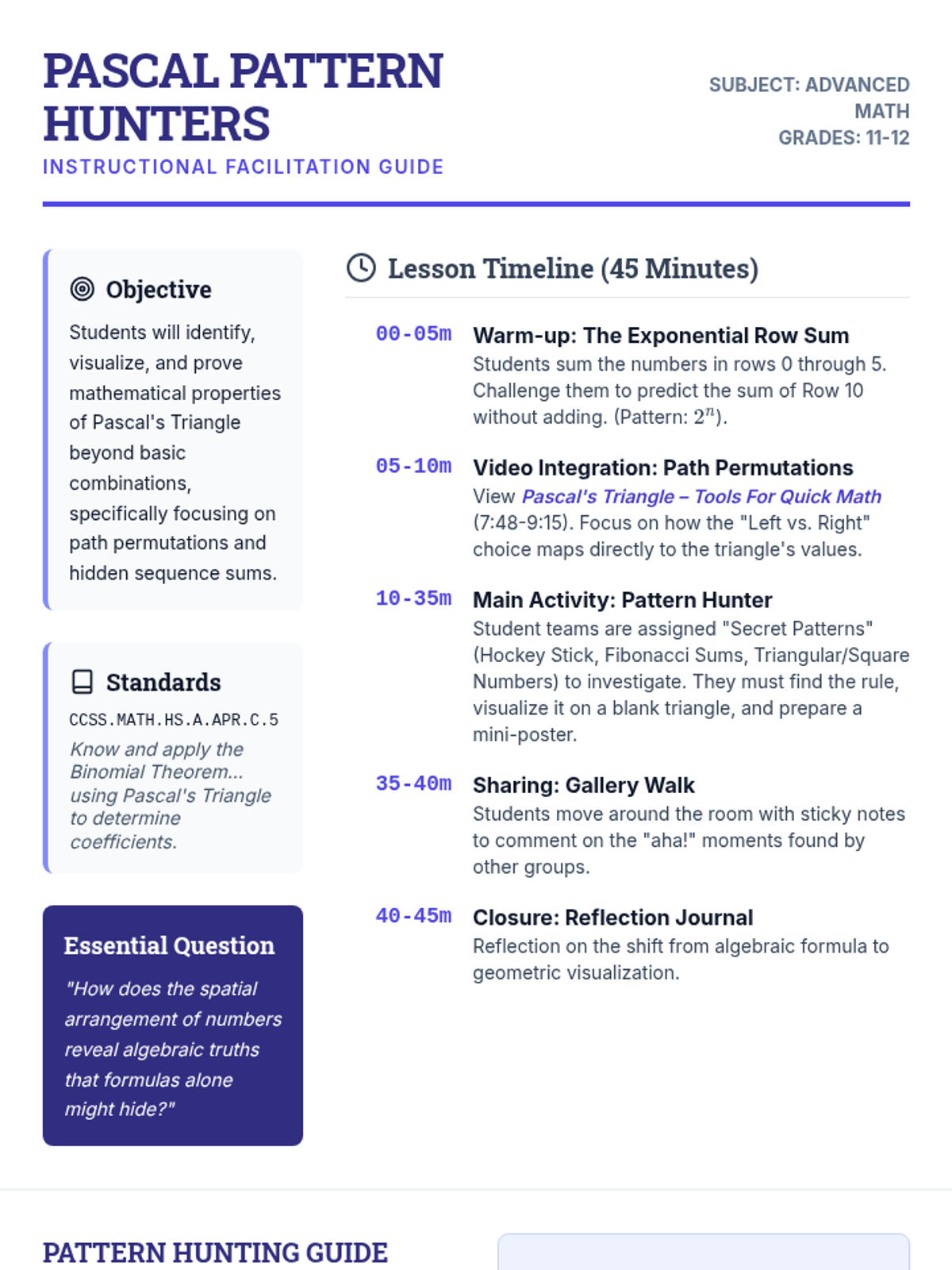 This lesson guides students through the discovery of advanced patterns within Pascal's Triangle, moving from basic combinations to complex identities like the Hockey Stick and Fibonacci sums. Students transition from procedural calculation to visual mathematical investigation.
