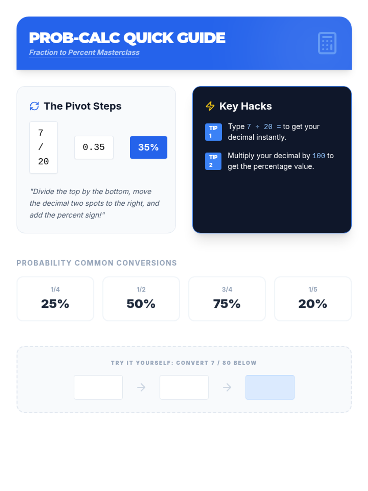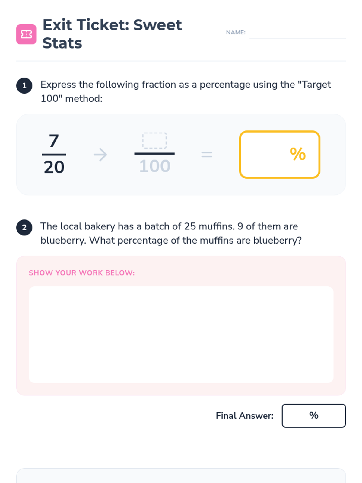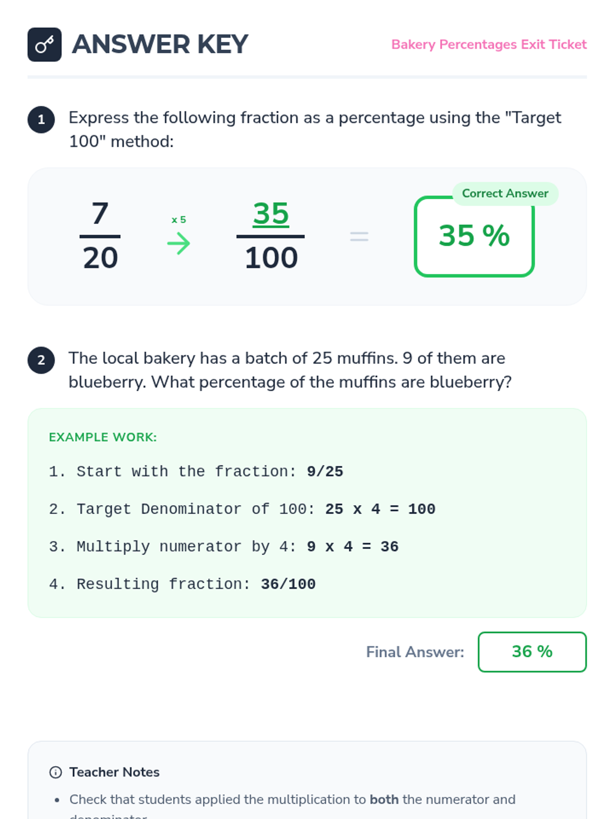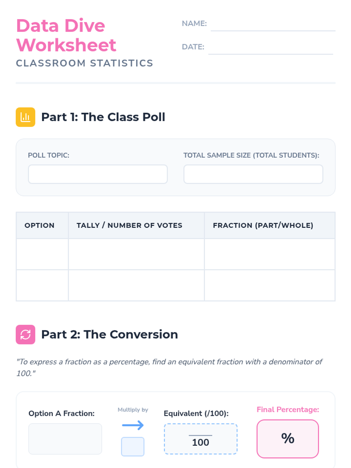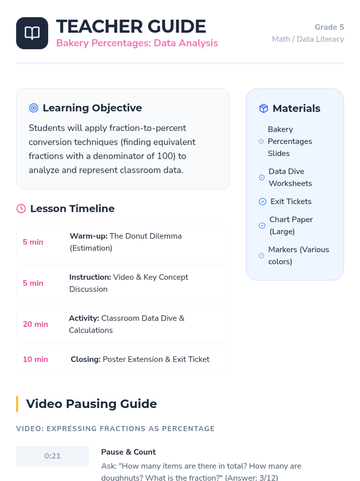 Students learn to convert fractions to percentages by finding equivalent fractions with a denominator of 100, starting with a bakery-themed scenario and concluding with a classroom data analysis project.
