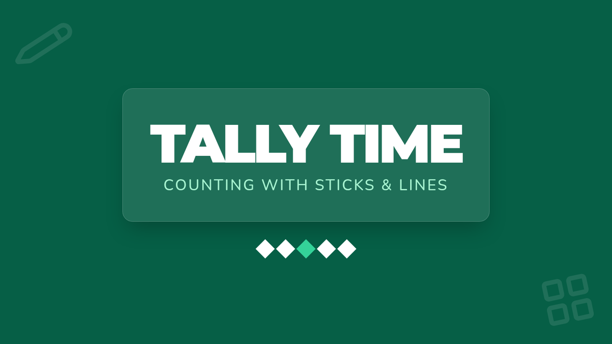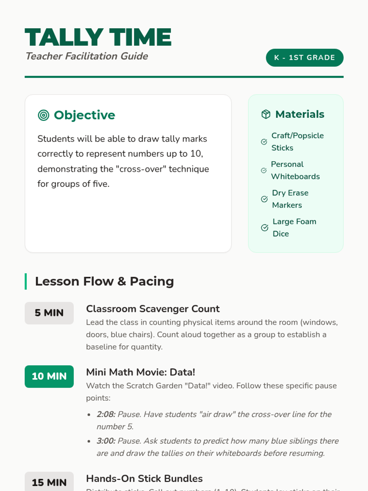 A Kindergarten to 1st Grade introduction to tally marks, focusing on the concept of bundling groups of five to count data efficiently. The lesson includes a video-guided observation activity, hands-on stick bundling, and a dice-rolling tally game.