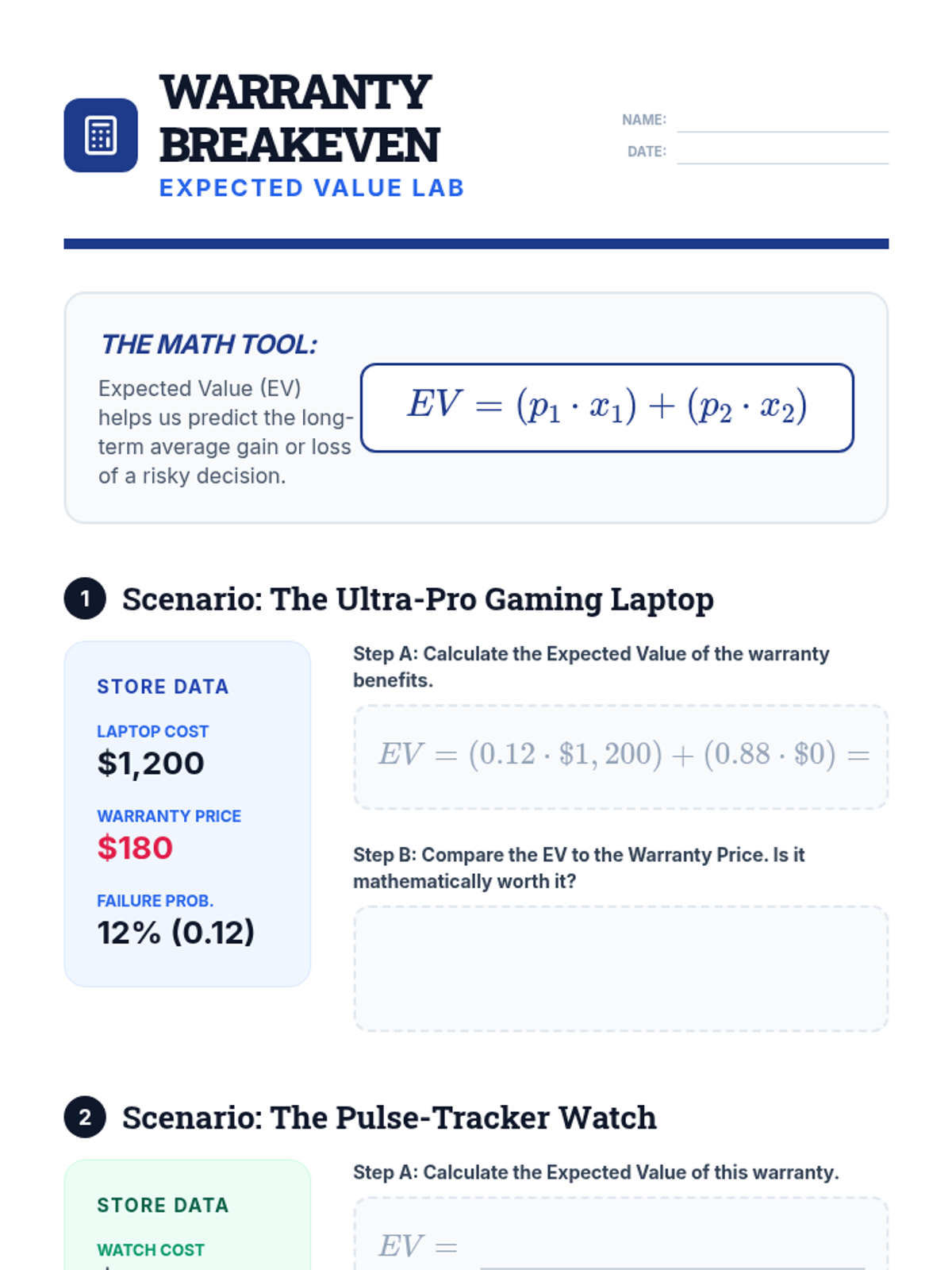 Students use expected value to analyze the financial viability of extended warranties on consumer electronics, determining when protection plans are mathematically sound.