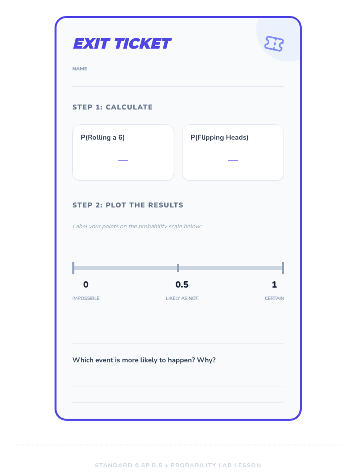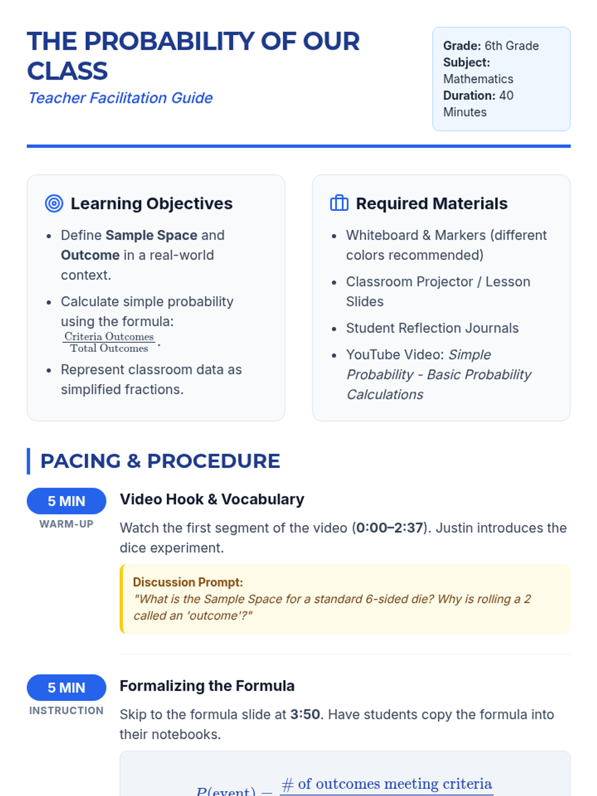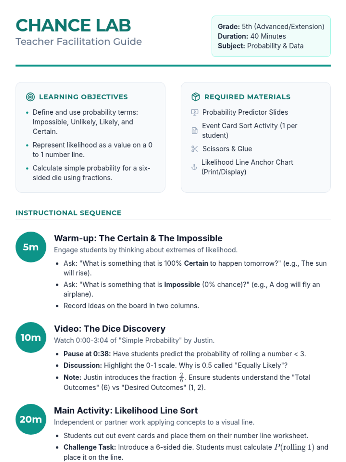 This lesson introduces 5th-grade students to the concept of probability using a 0 to 1 number line. Students explore likelihood vocabulary, analyze a dice-rolling experiment through video, and apply their learning by placing real-world and mathematical events on a probability spectrum.