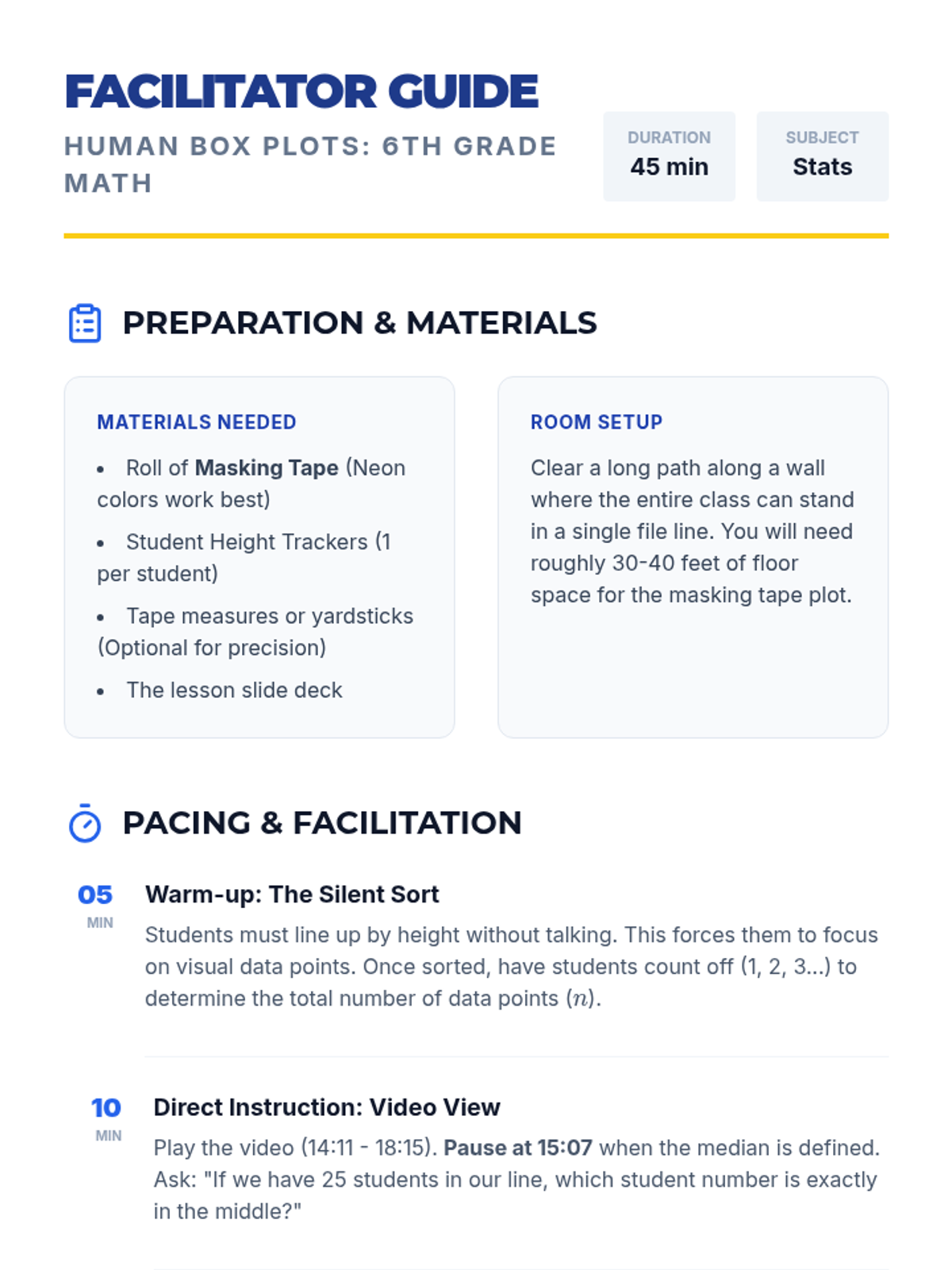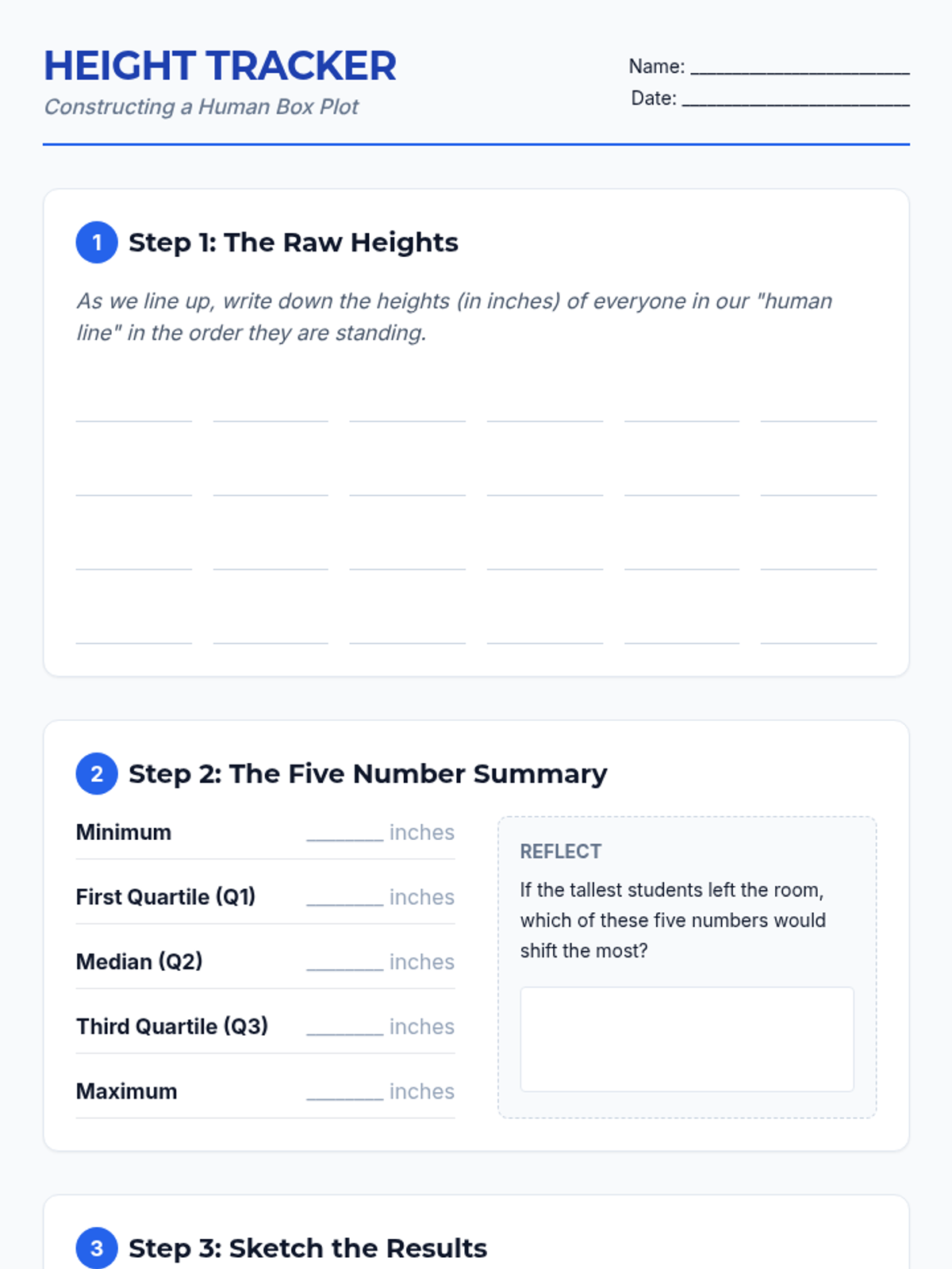 A hands-on math lesson where 6th grade students become the data points, physically constructing a box-and-whisker plot using their own heights to understand the five-number summary.
