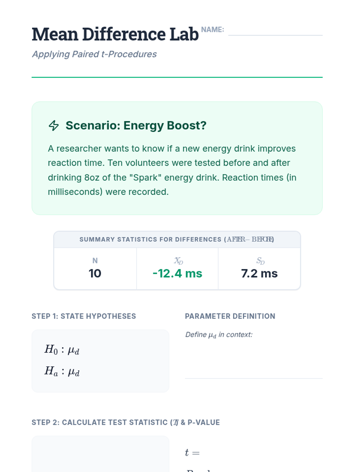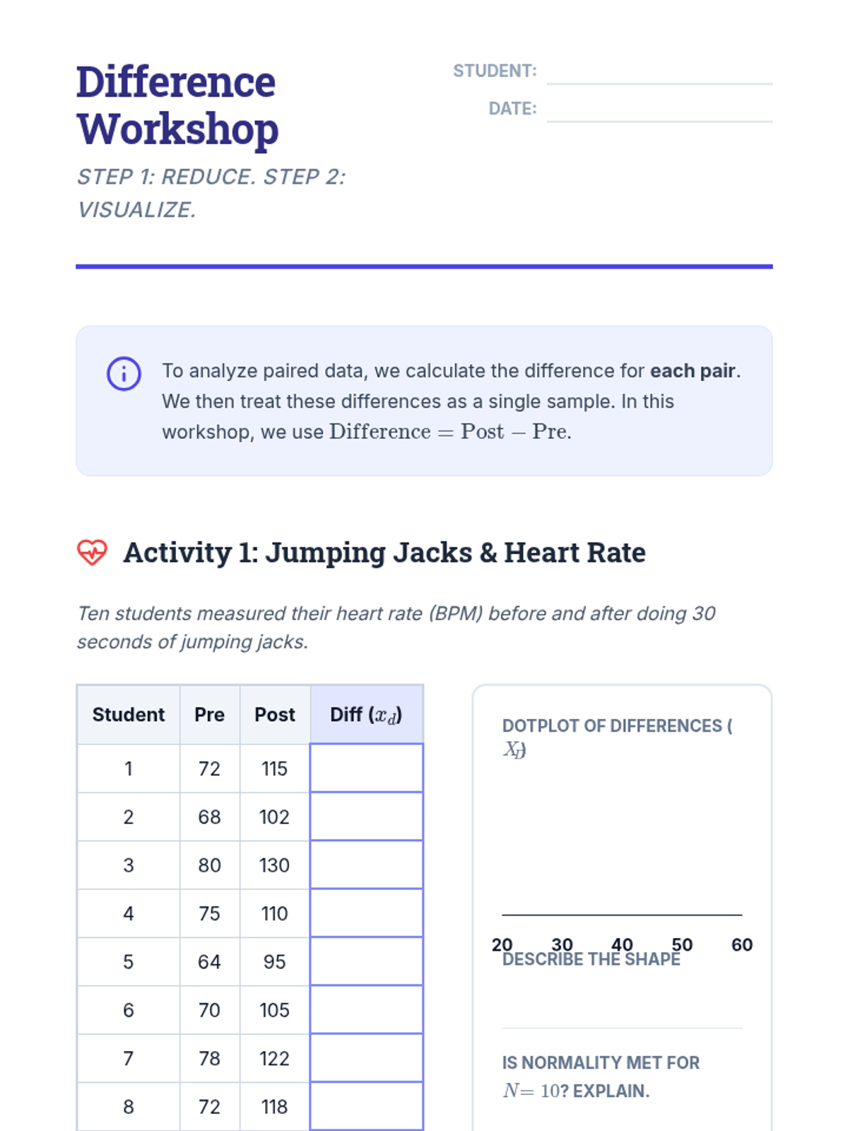 Students focus on the mechanics of calculating differences for matched pairs and visualizing these differences to check for normality before inference.