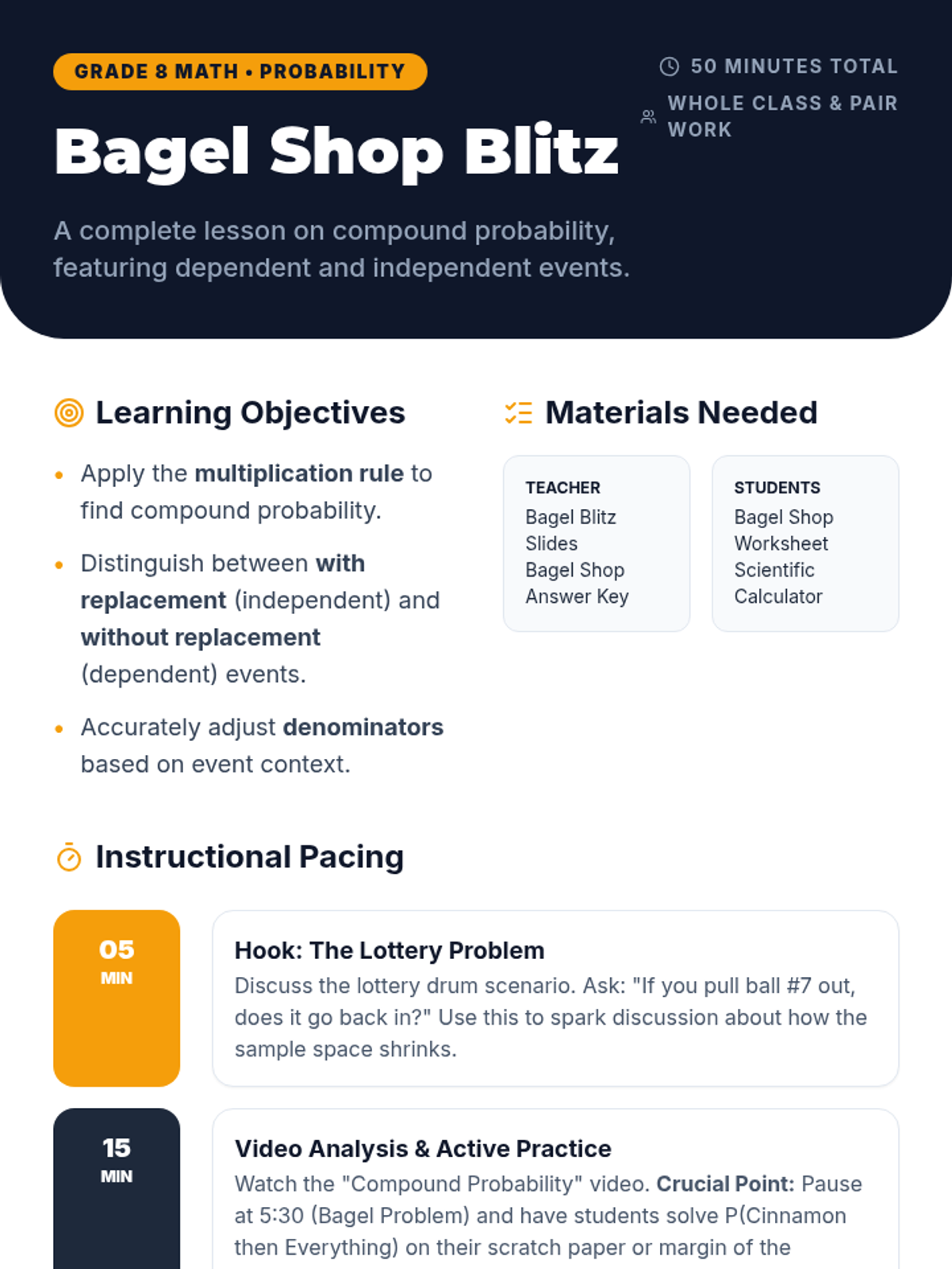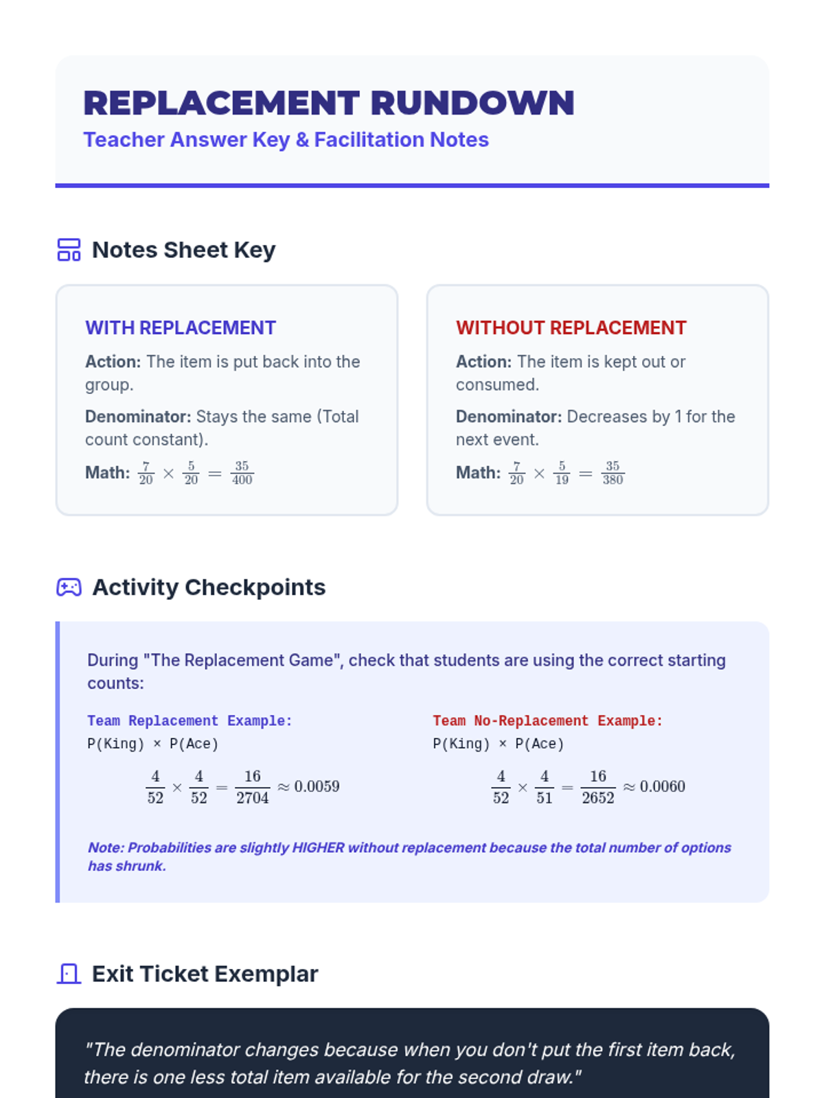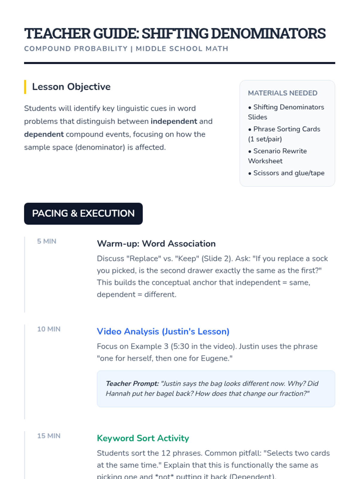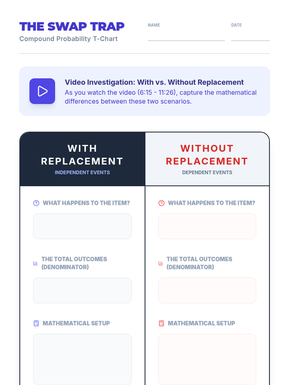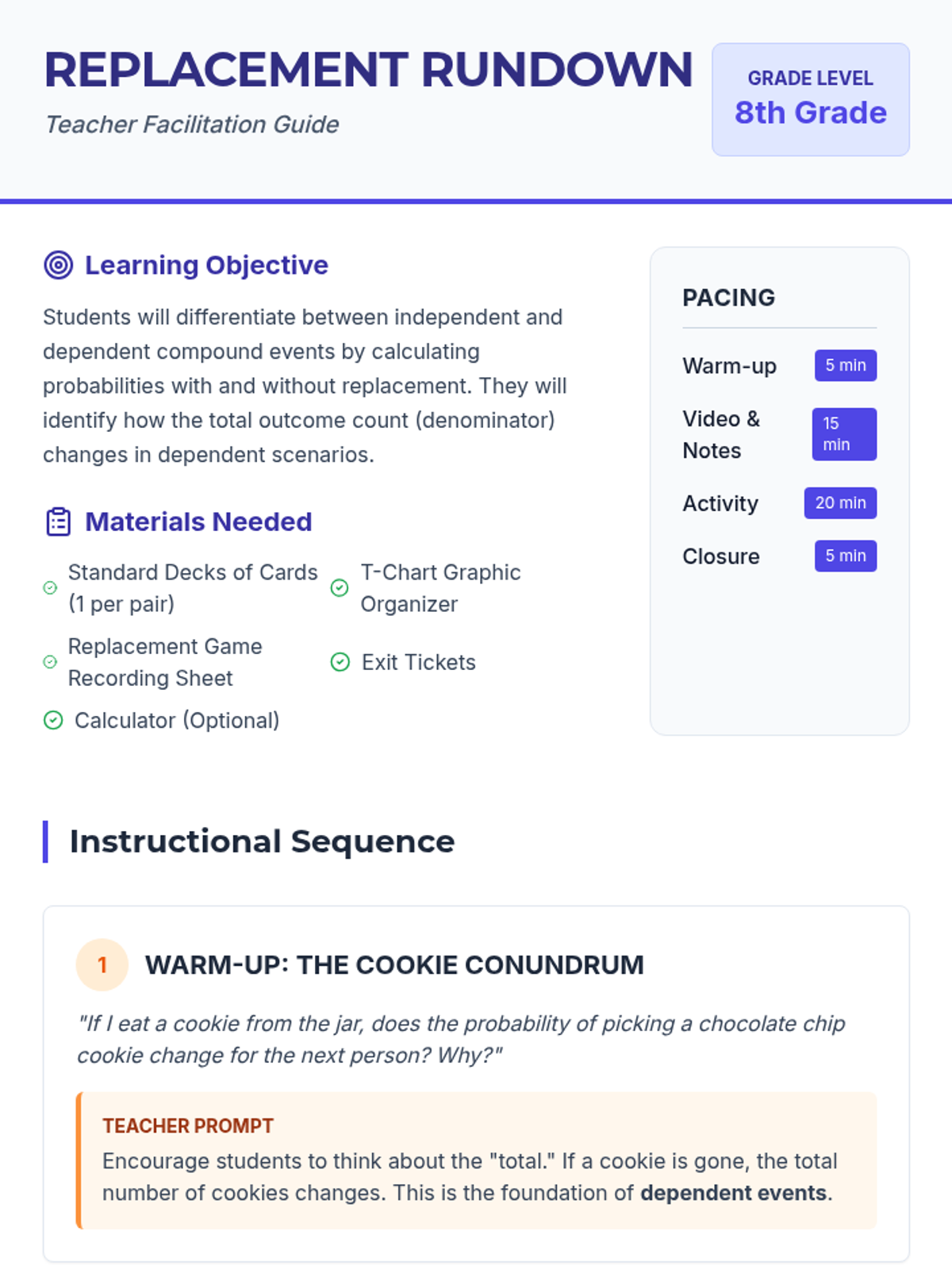 An 8th-grade math lesson focusing on the distinction between independent and dependent events through the lens of replacement. Students explore how the presence or absence of replacement affects probability calculations through video analysis and a hands-on card activity.