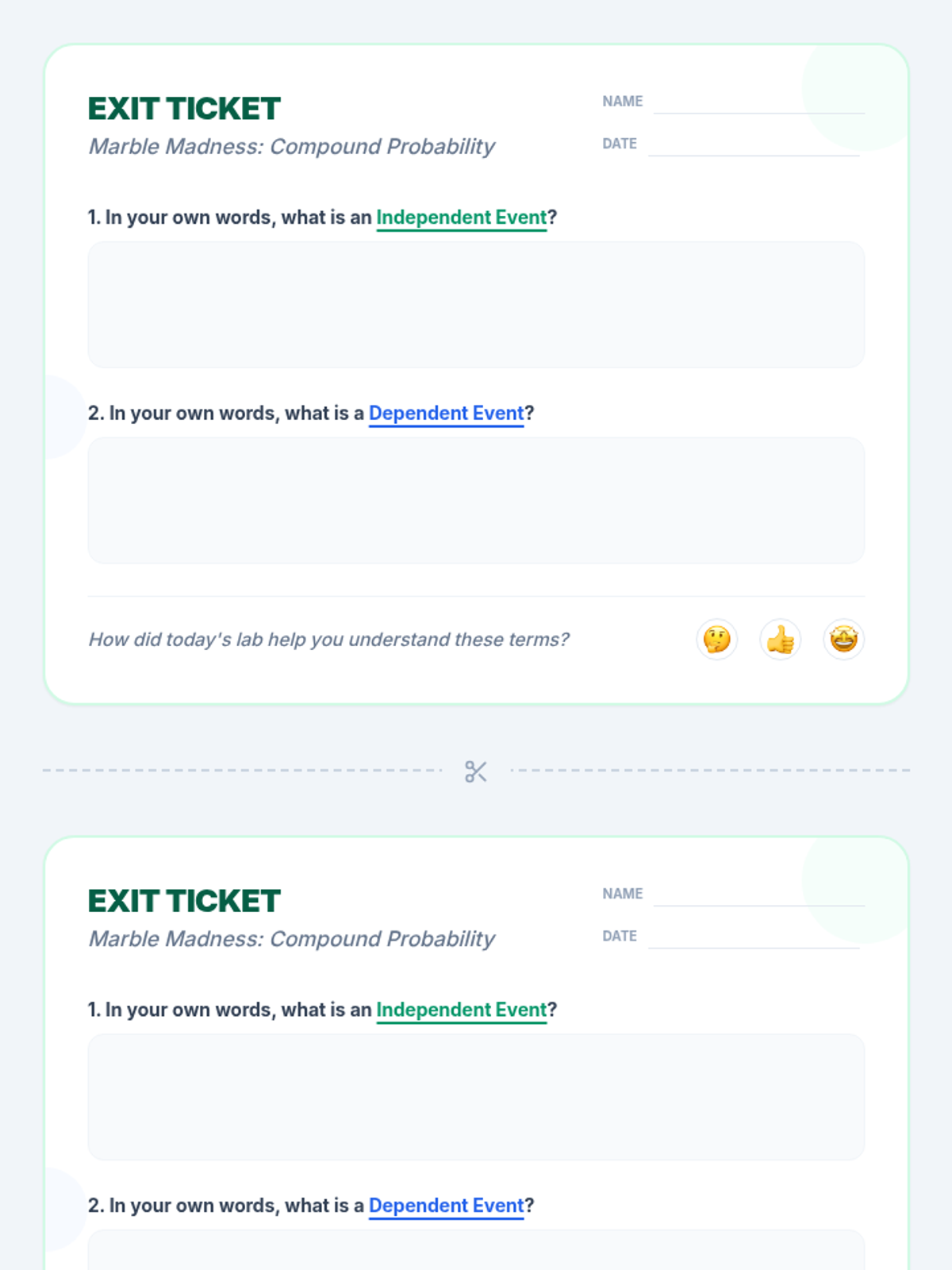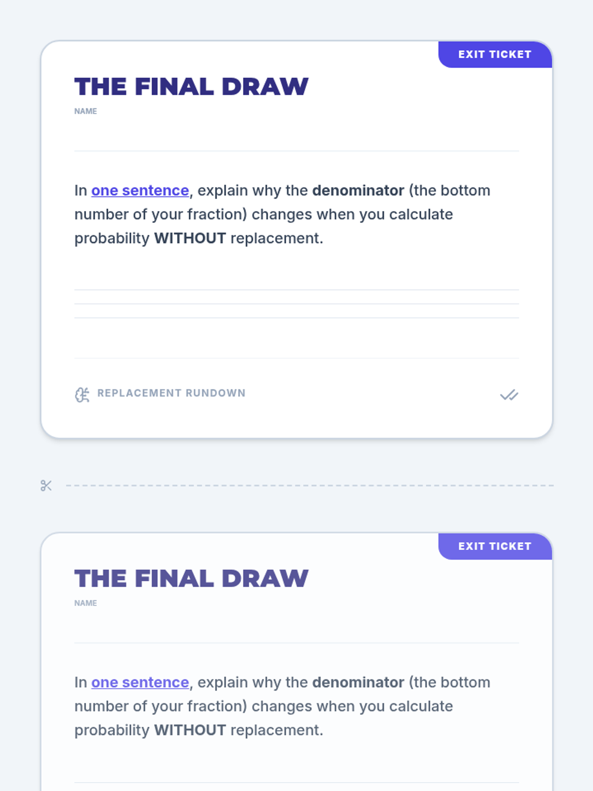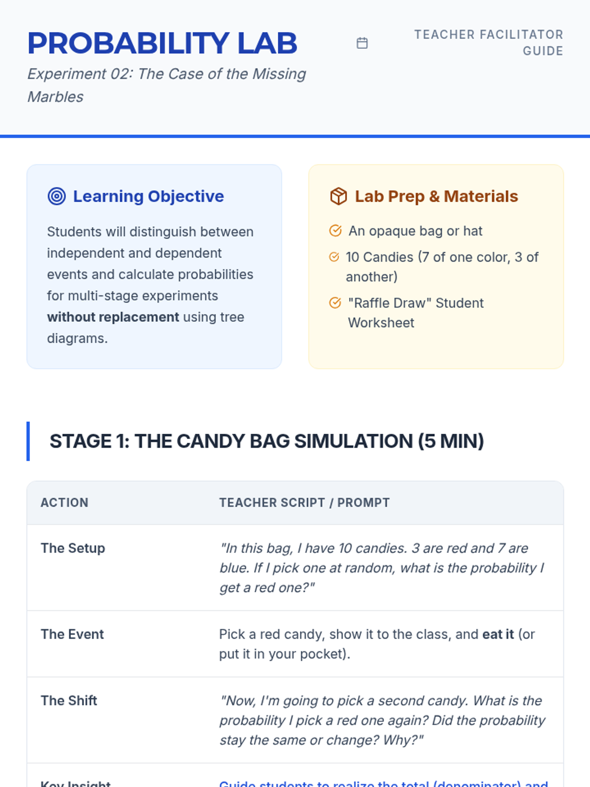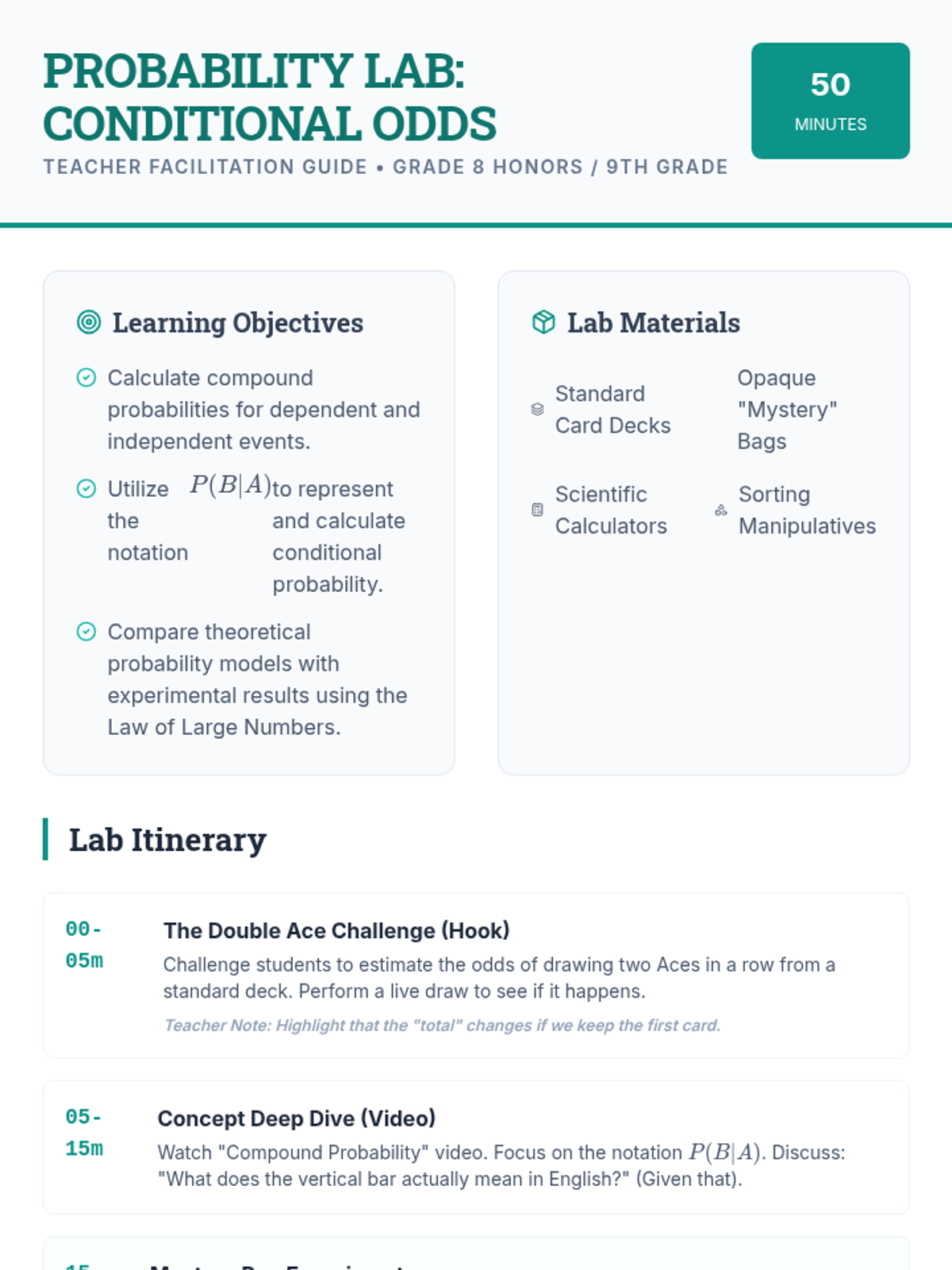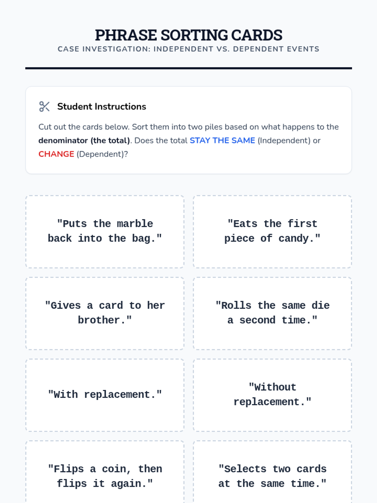 An 8th-grade math lesson focusing on the distinction between independent and dependent events through the lens of replacement. Students explore how the presence or absence of replacement affects probability calculations through video analysis and a hands-on card activity.