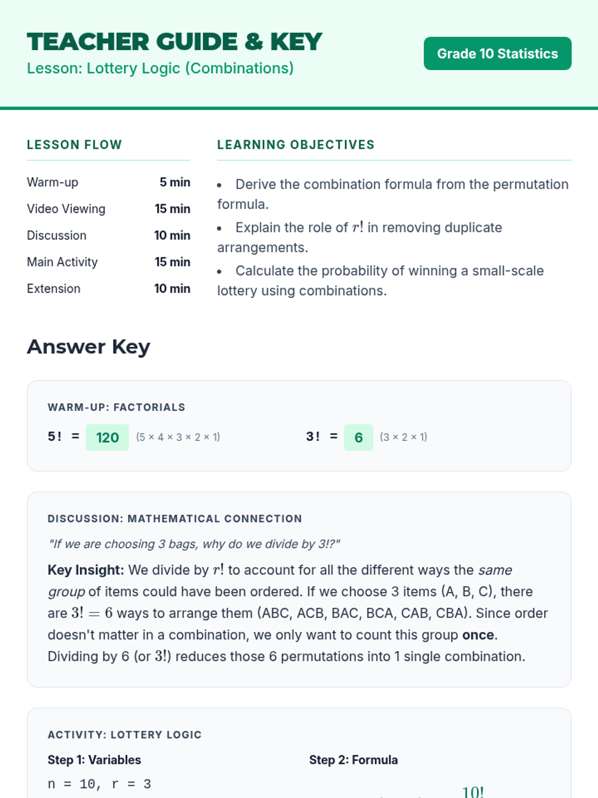 A 10th-grade statistics lesson where students derive and apply the combination formula by investigating how 'sharing' or grouping items removes the importance of order, culminating in a probability analysis of a class lottery.
