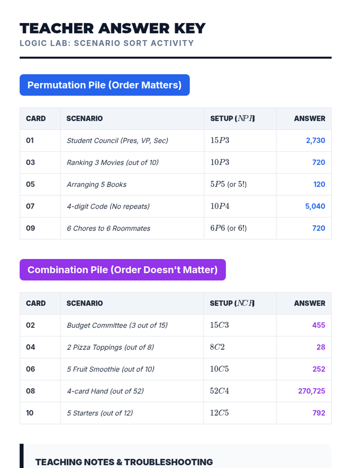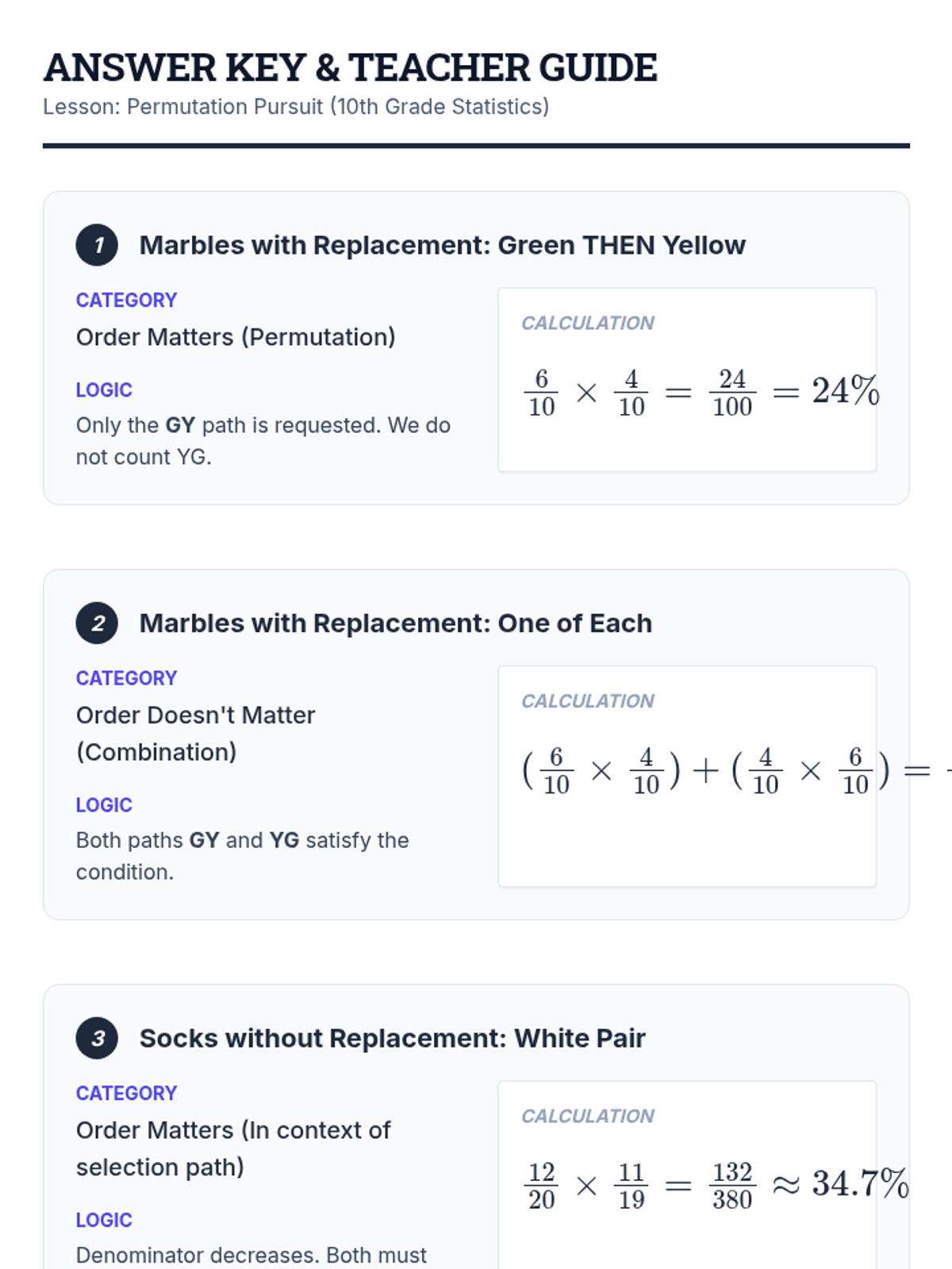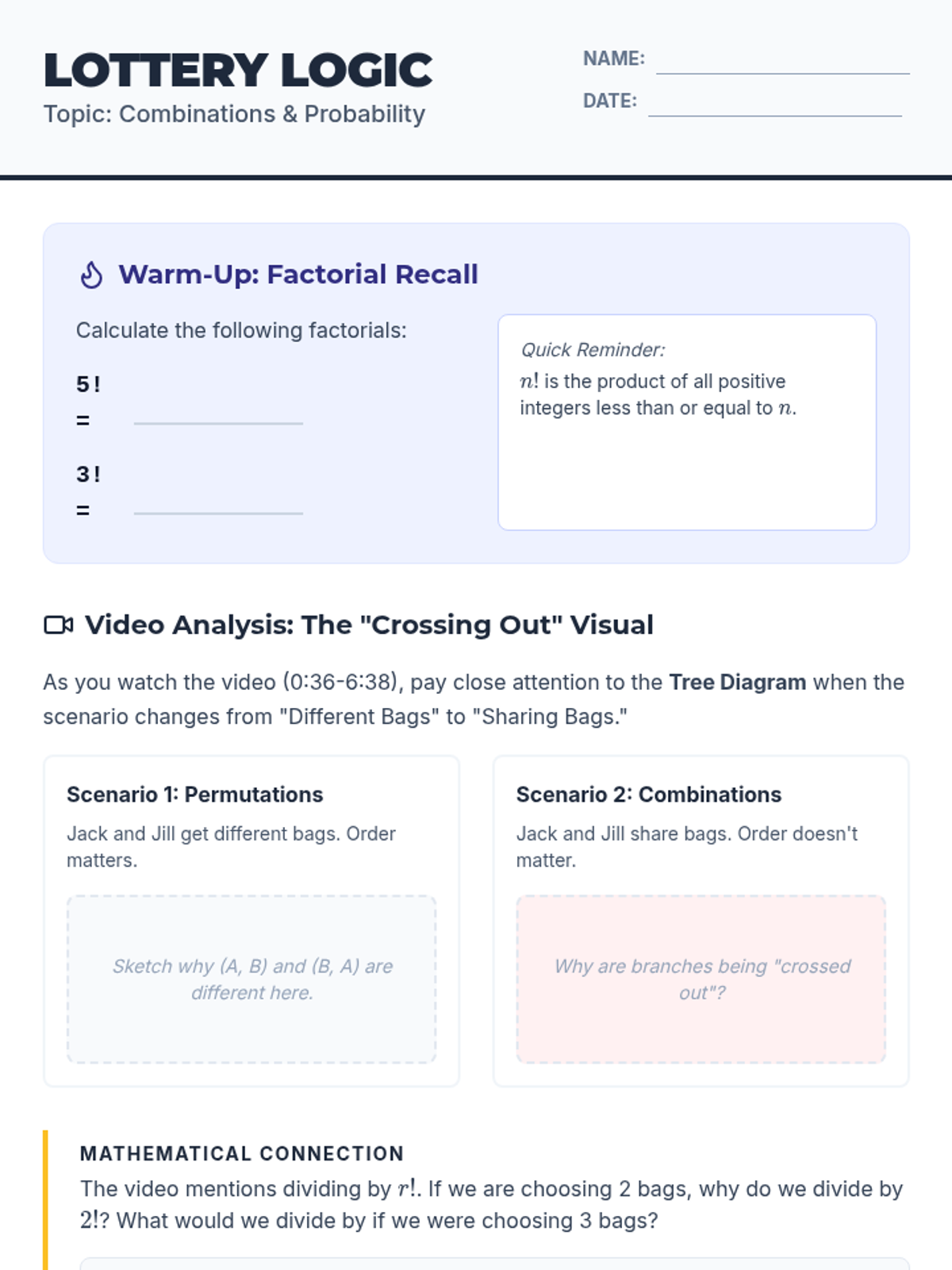 Students will learn to distinguish between permutations (order matters) and combinations (order doesn't matter) through a video-based discussion and a card-sorting activity.