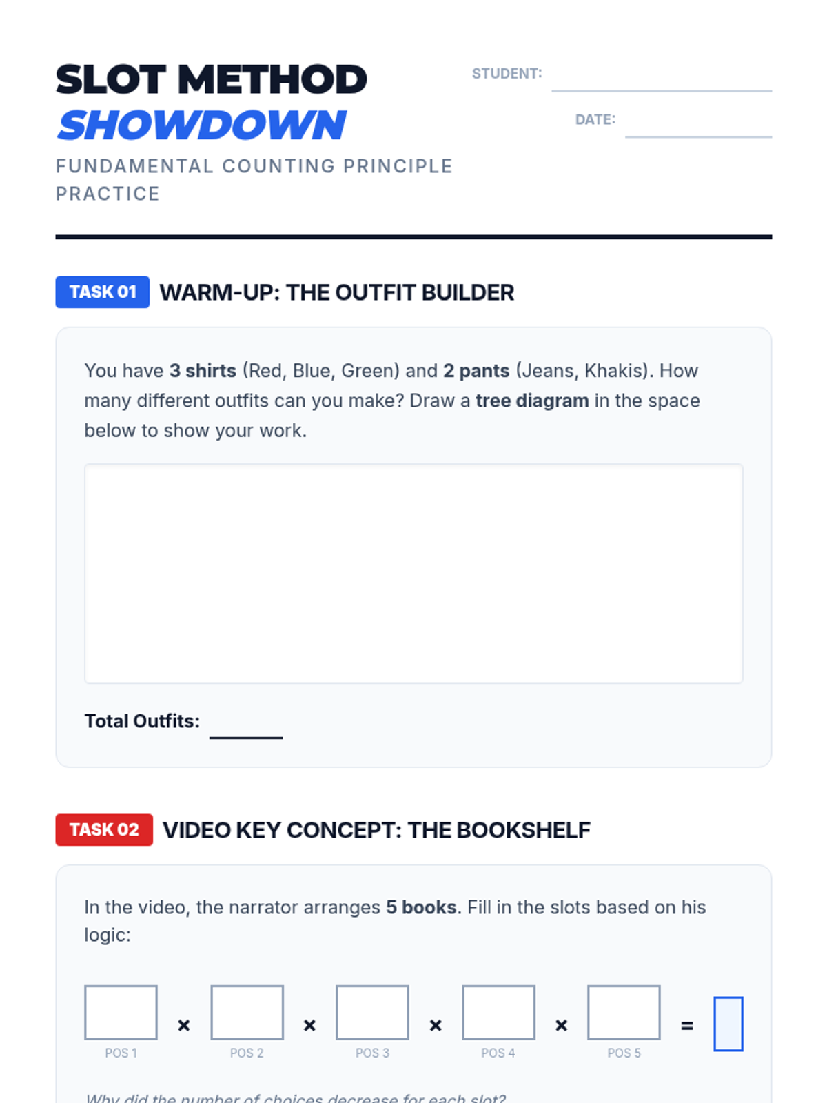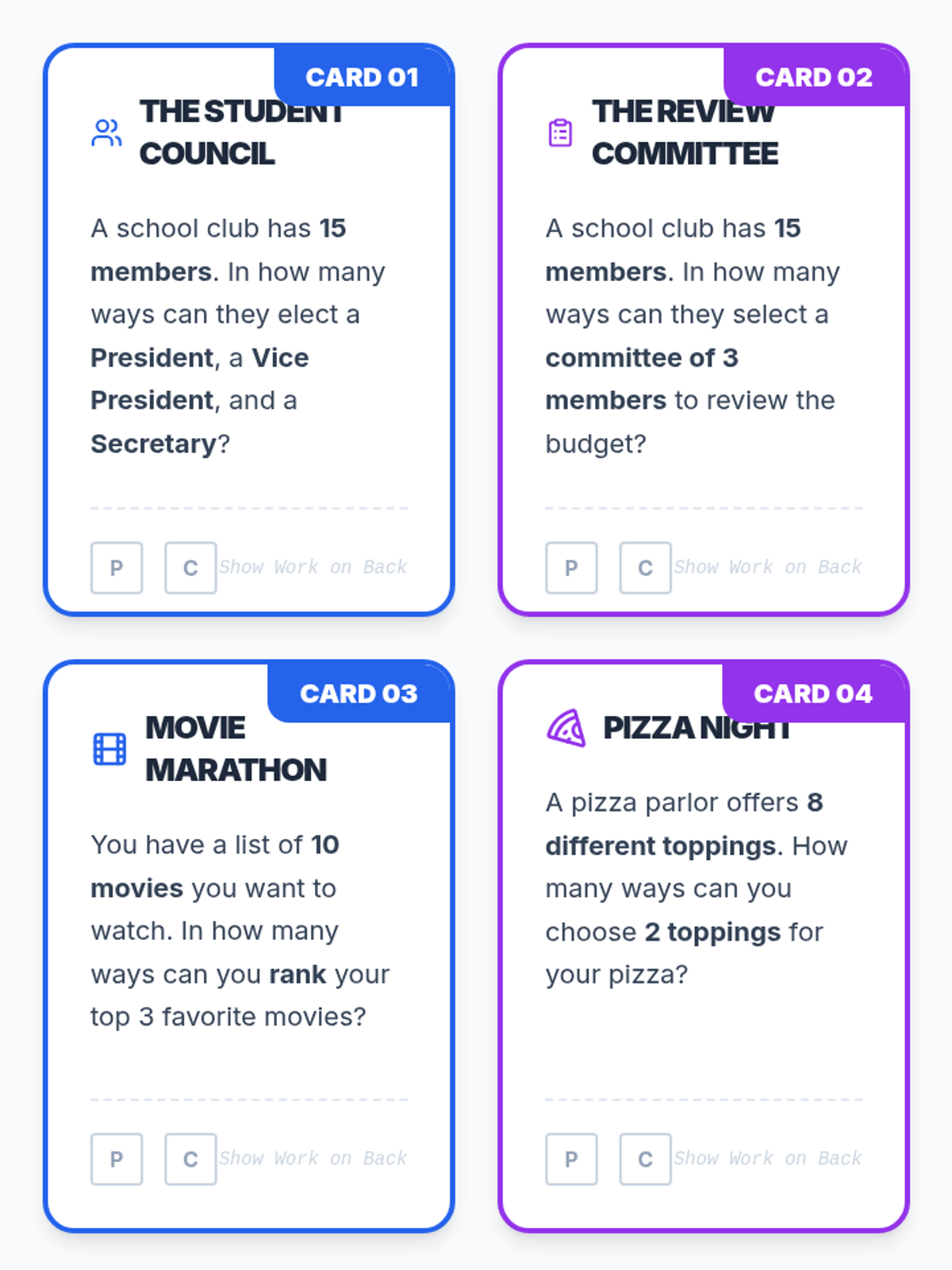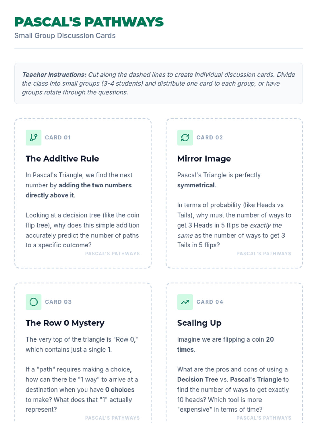 Students will learn to distinguish between permutations (order matters) and combinations (order doesn't matter) through a video-based discussion and a card-sorting activity.