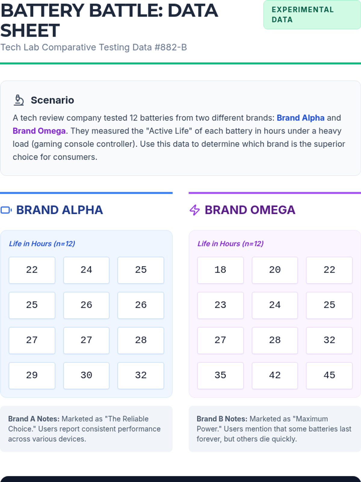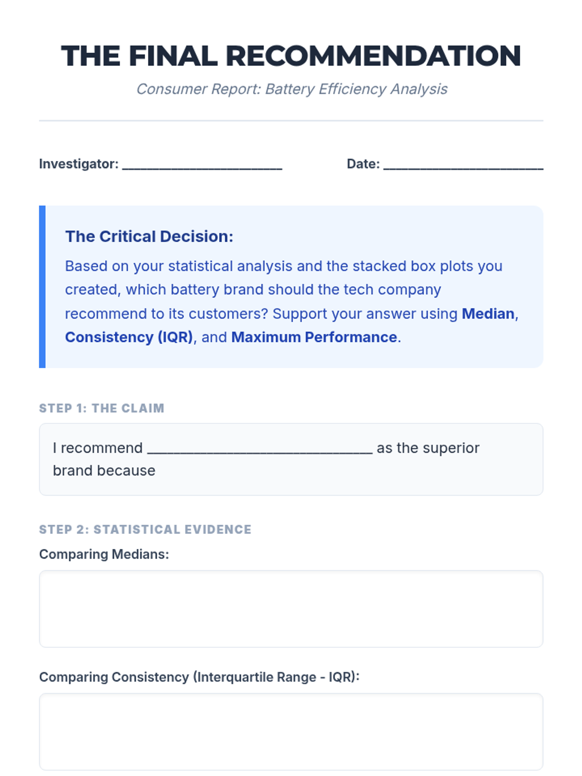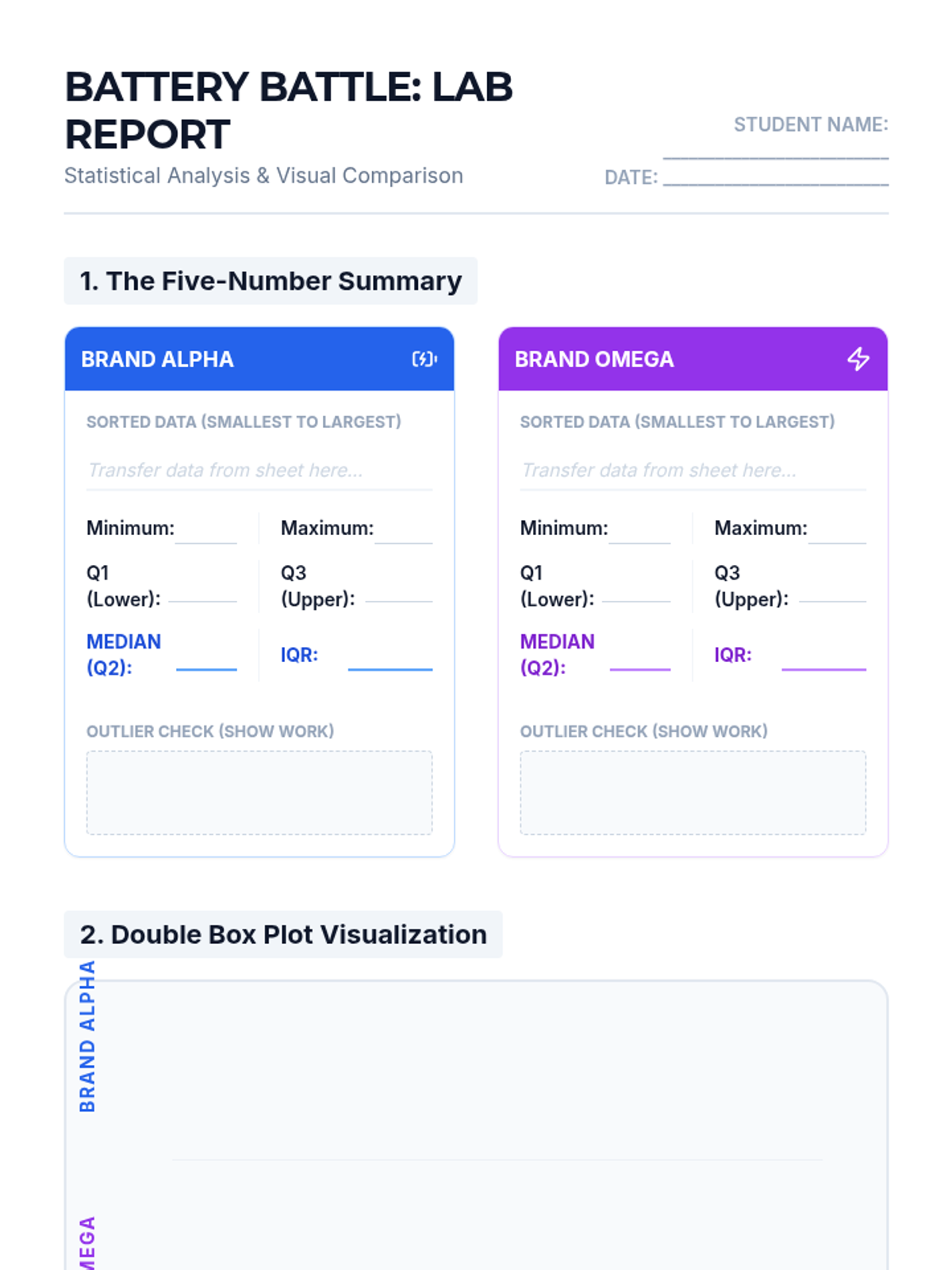 A lesson where students compare two battery brands using double box plots to determine which is 'better' based on median performance, consistency (IQR), and maximum range. Students will learn to calculate five-number summaries and construct stacked box plots on a single number line.
