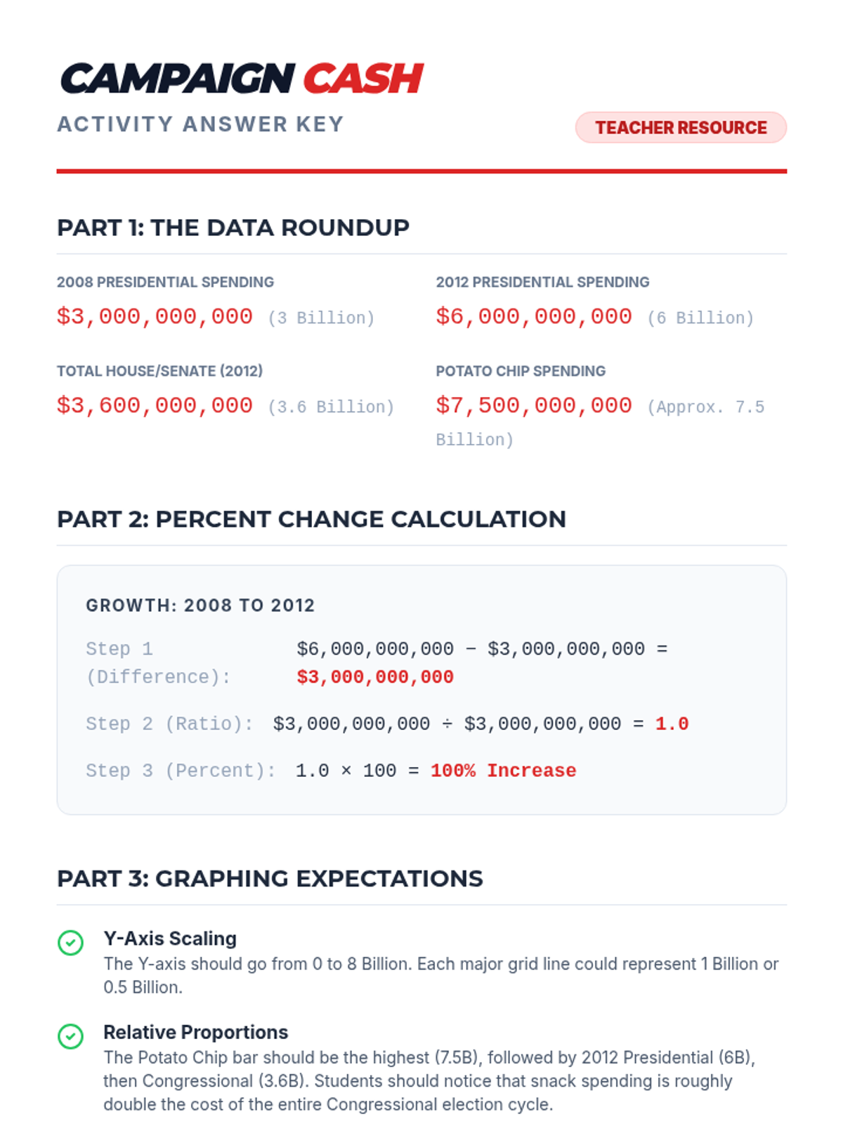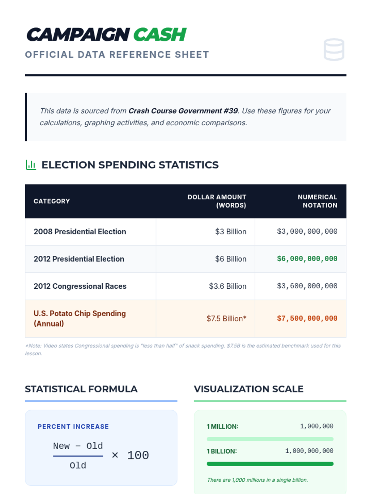 A math and statistics lesson where students interpret campaign spending data from a Crash Course video, visualize the scale of billions, and create comparative graphs against consumer spending habits.