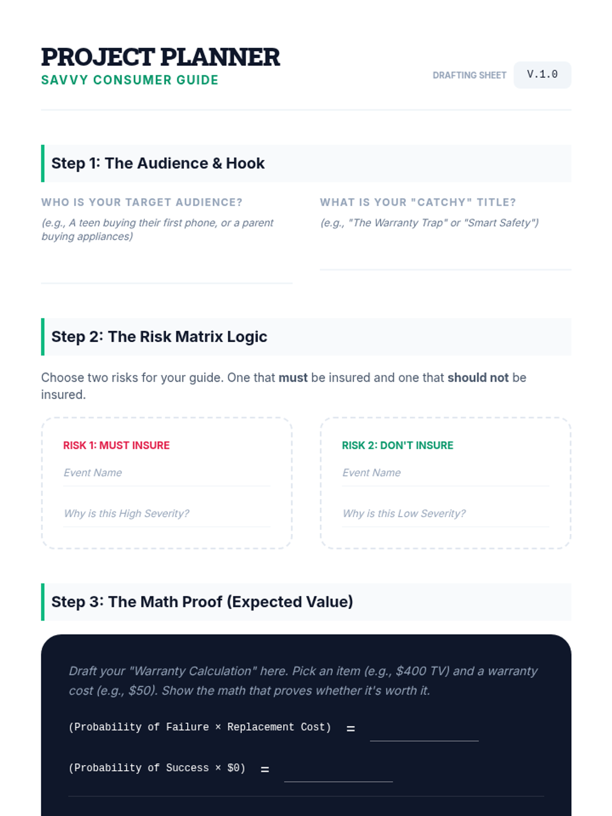 Students synthesize their learning by creating a consumer guide that provides mathematically-backed advice on when to purchase insurance versus when to self-insure.