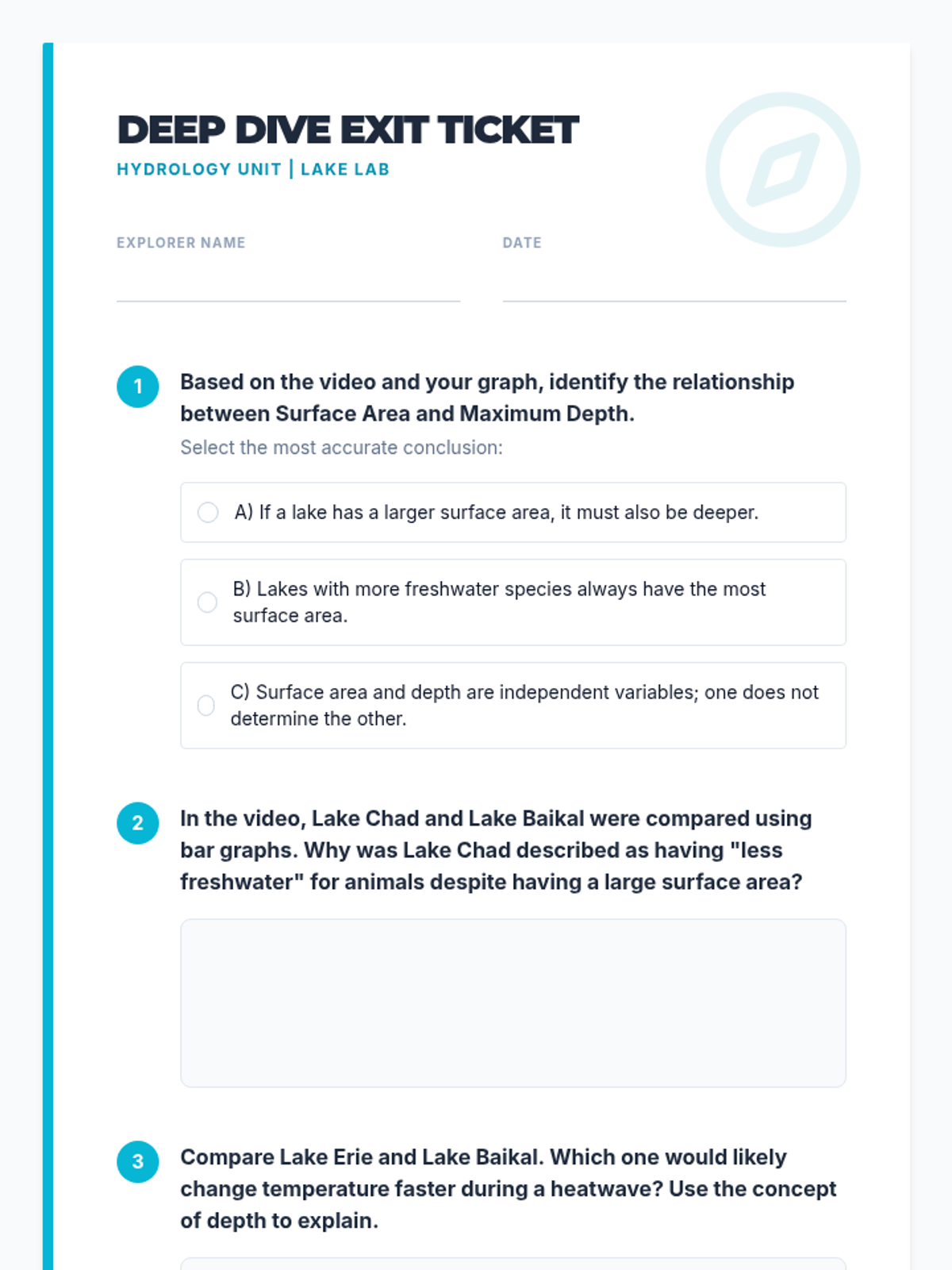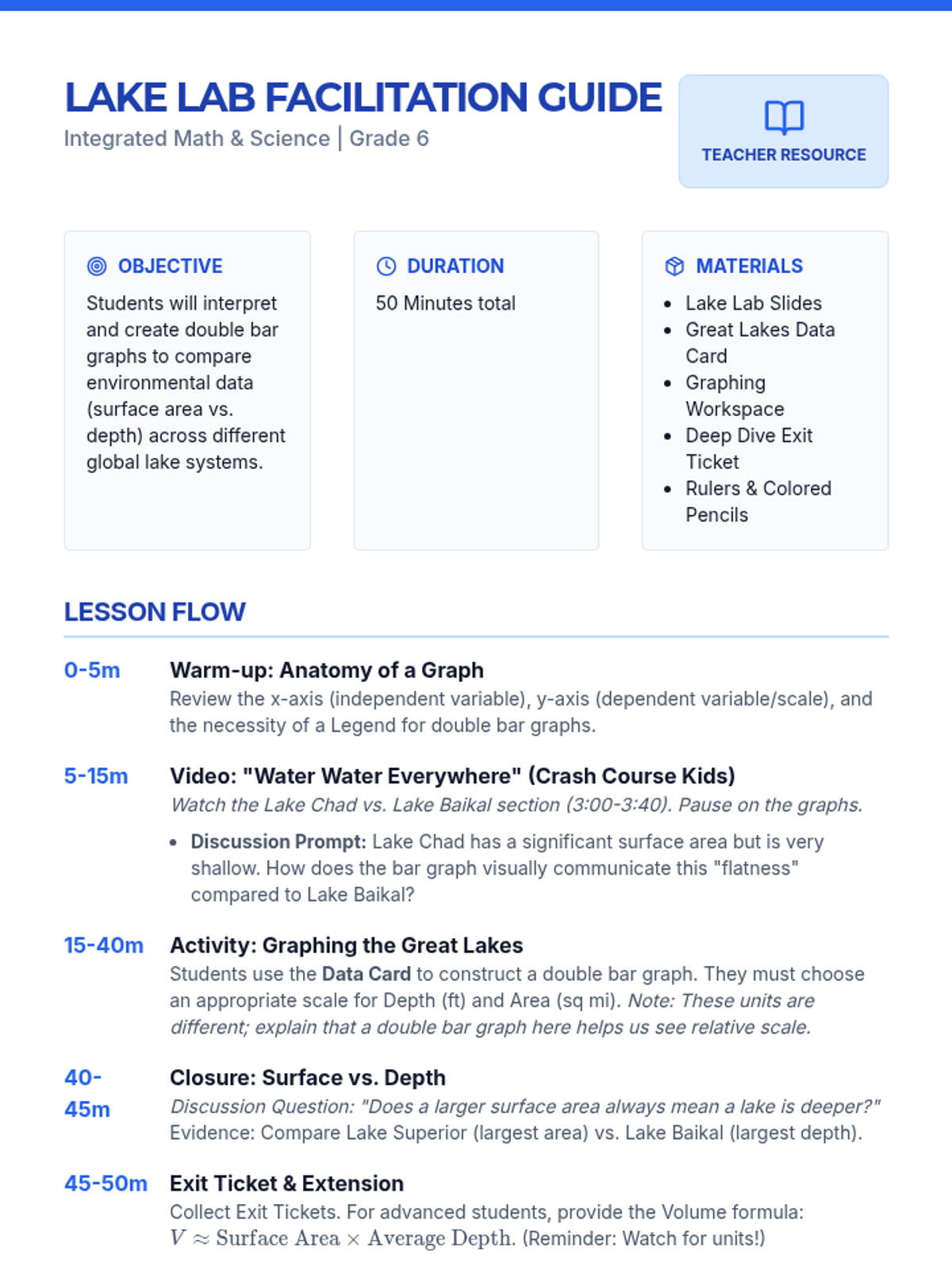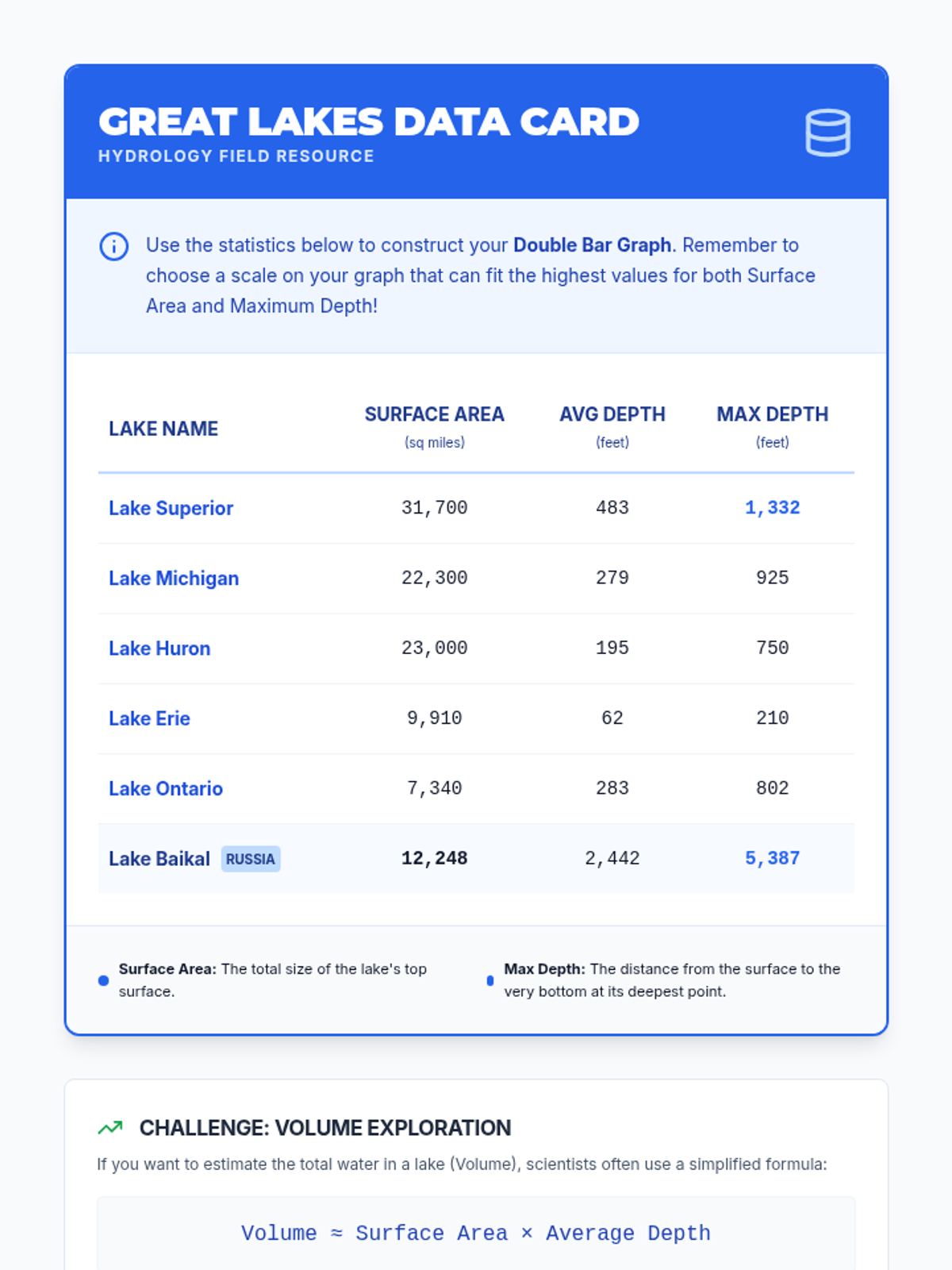 A 6th-grade integrated math and science lesson where students analyze environmental data about the Great Lakes and Lake Baikal. Students practice interpreting and creating double bar graphs to explore the relationship between lake surface area and depth.
