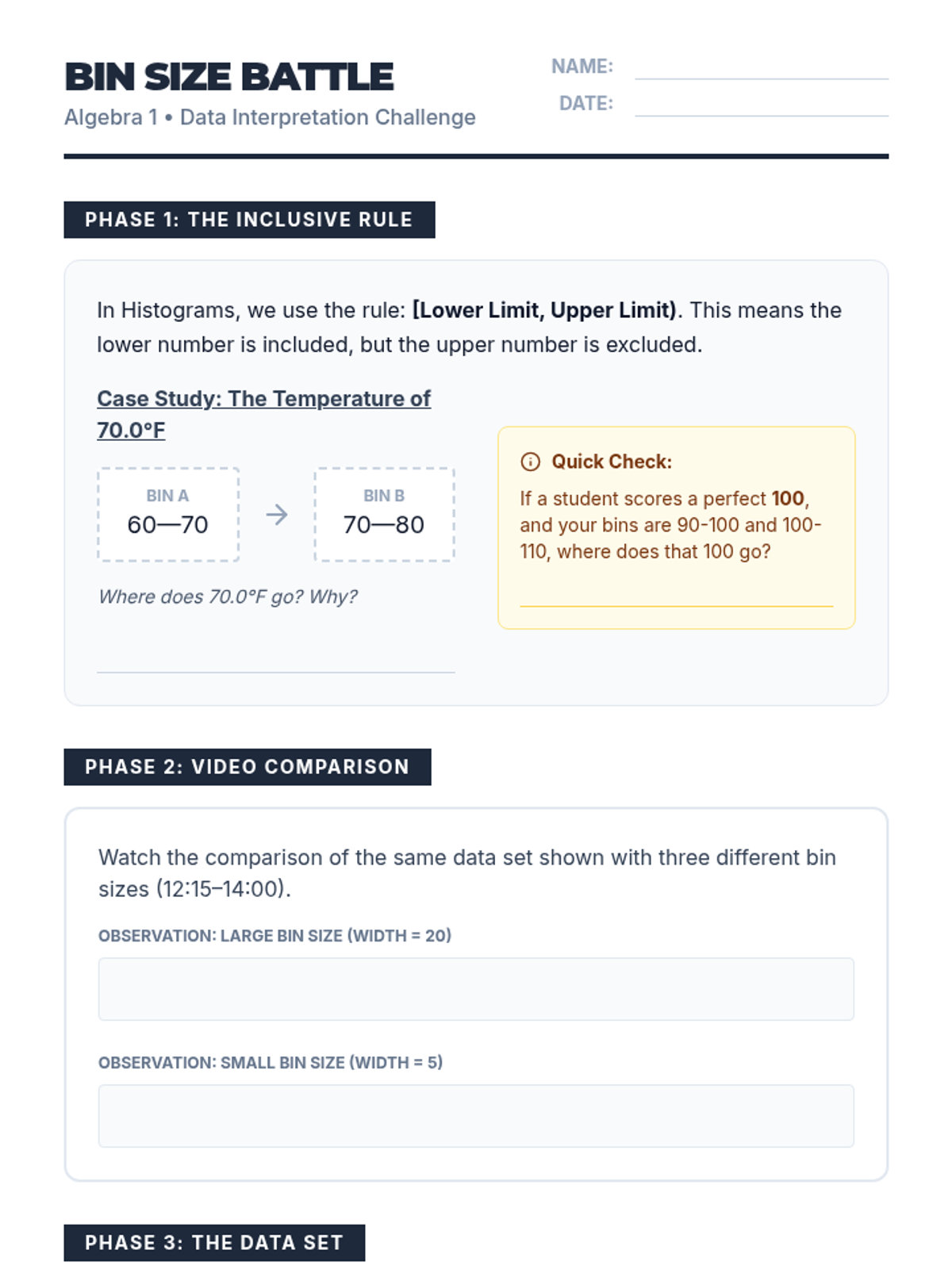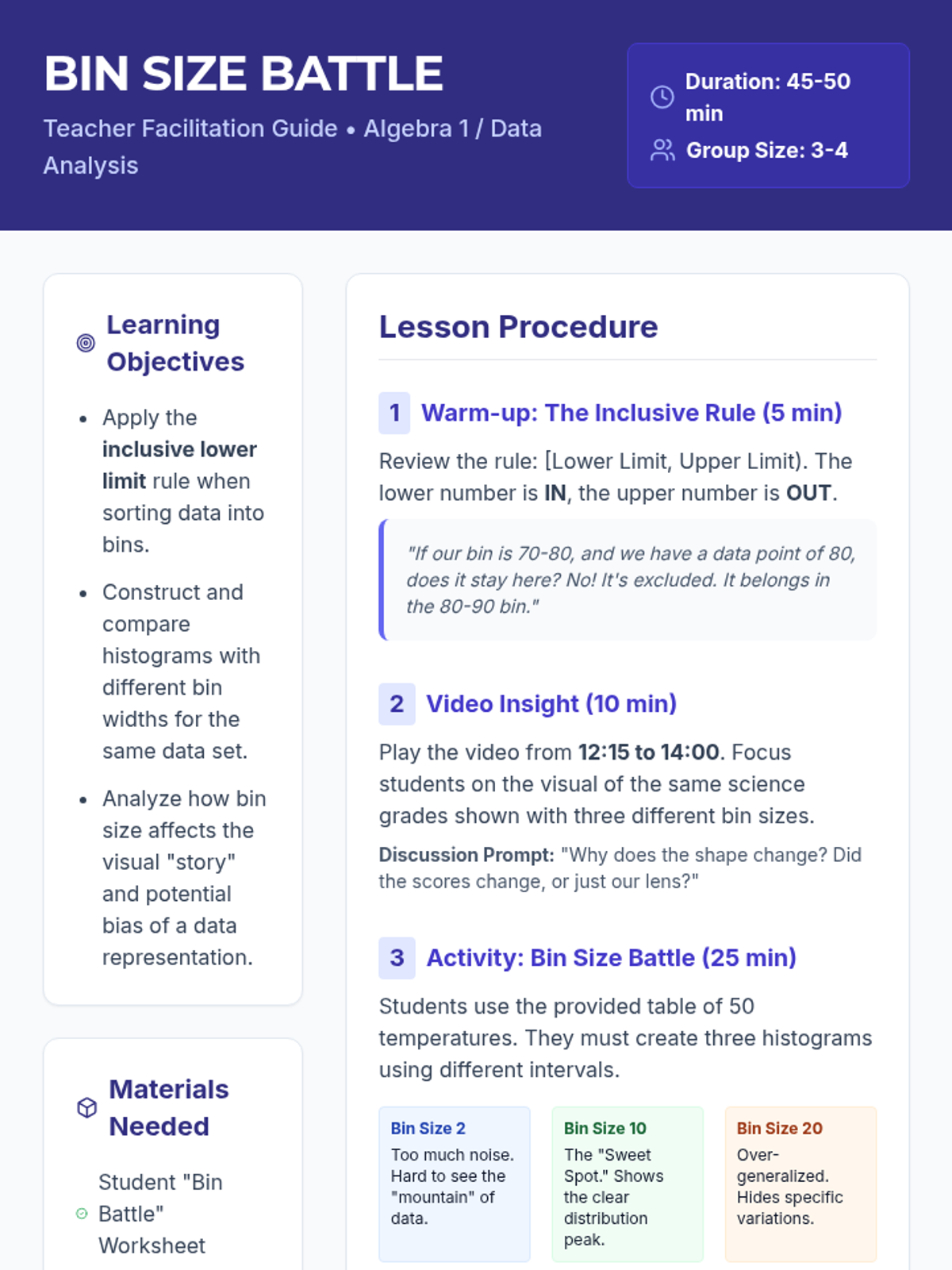 Students will investigate how changing bin sizes in a histogram can drastically alter the interpretation of a single data set of 50 temperatures. They will practice the 'inclusive lower limit' rule, watch a video demonstration, and engage in a 'Bin Size Battle' to determine which interval size provides the most honest representation of the data.