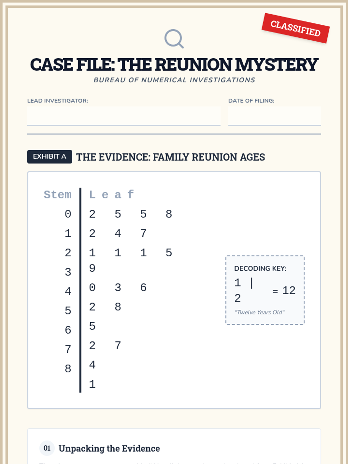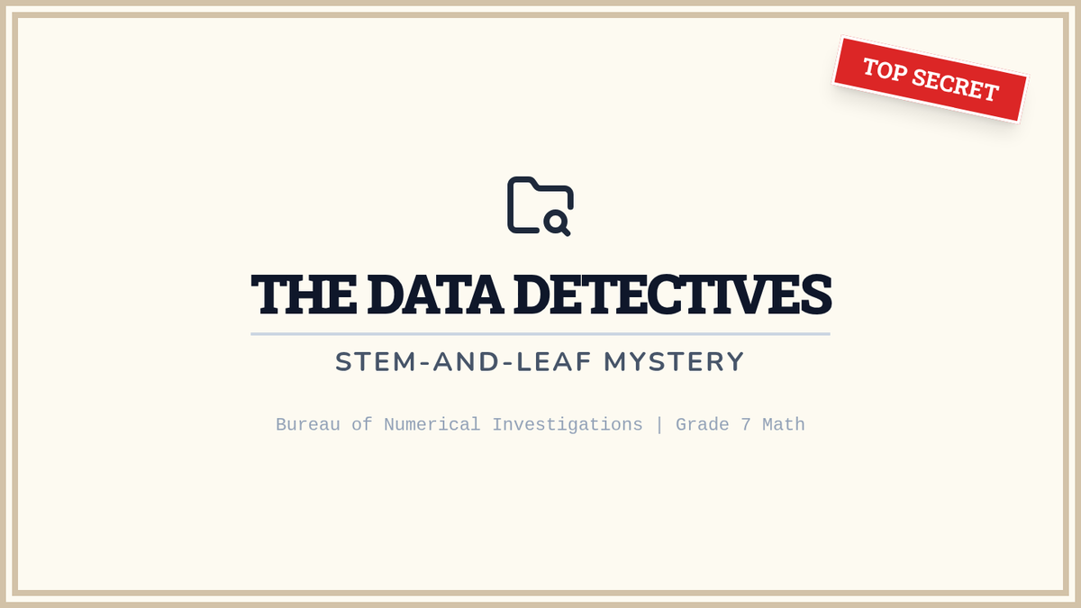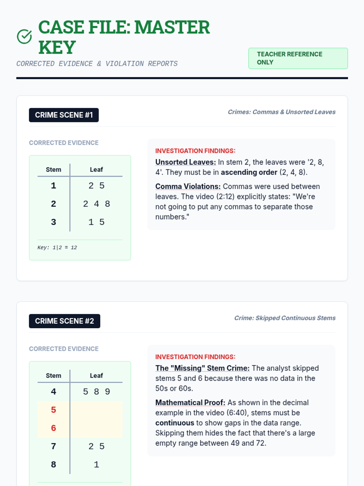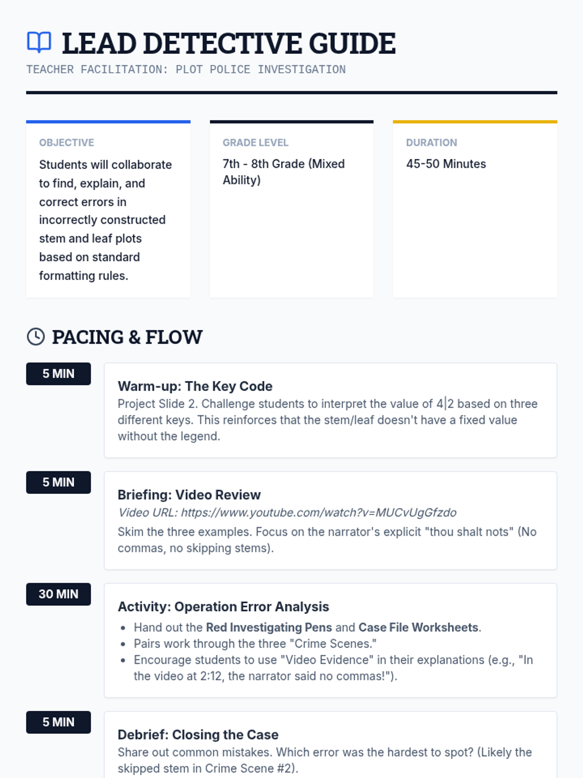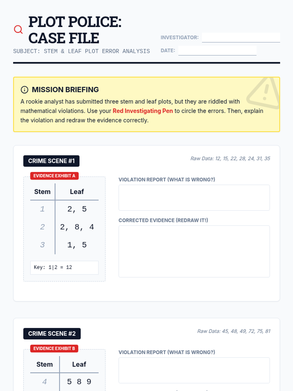 A detective-themed lesson where students investigate 'crime scenes' (incorrect stem and leaf plots) to identify, explain, and correct common errors in data visualization.