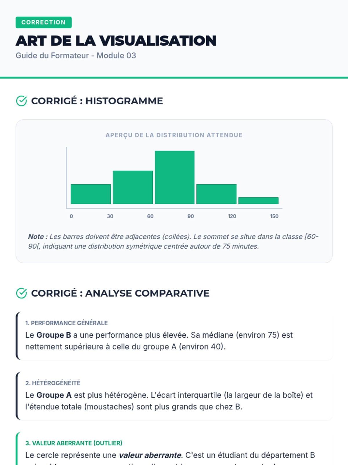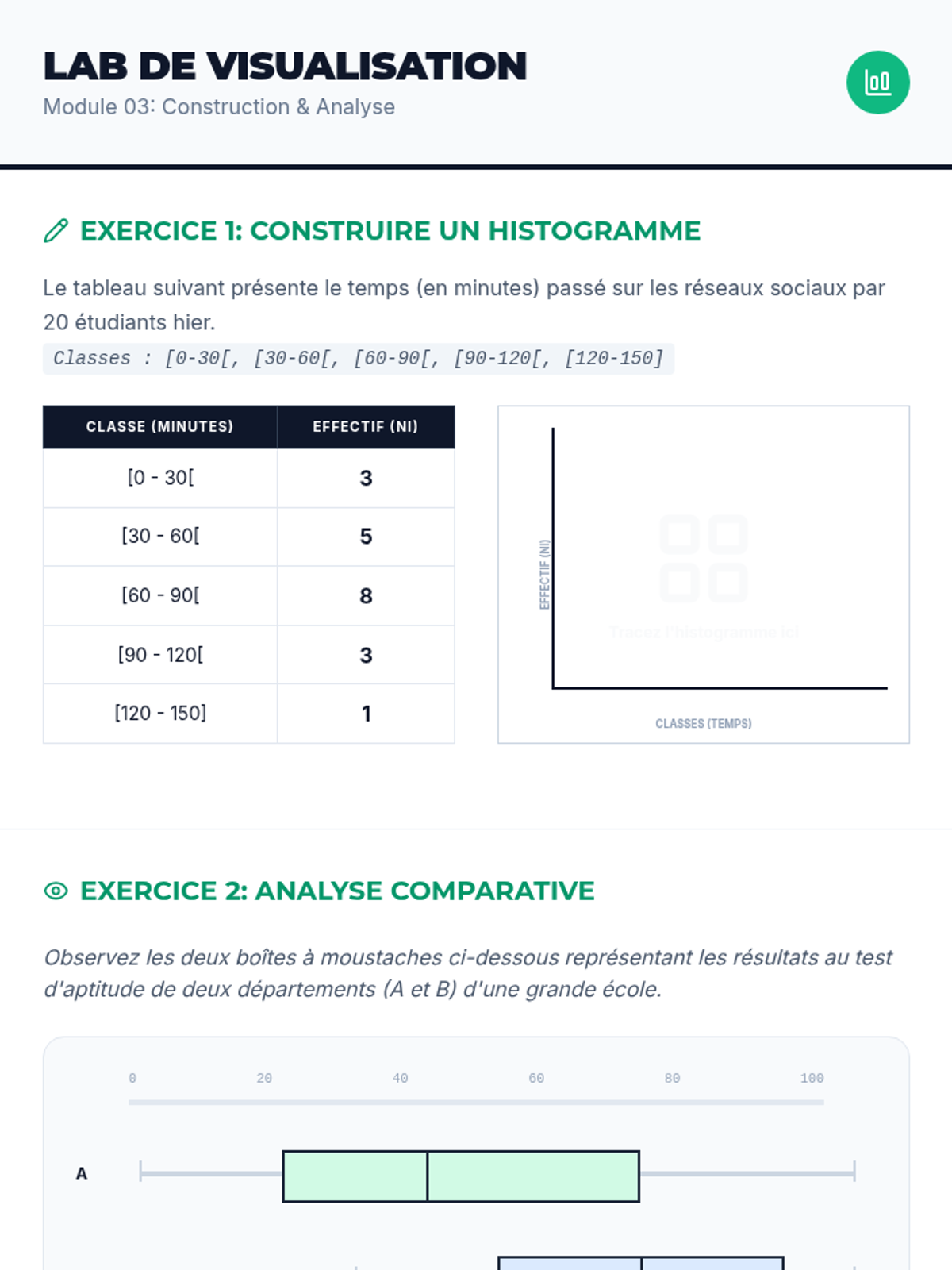Apprendre à choisir le bon graphique pour le bon type de données : histogrammes, boîtes à moustaches et diagrammes de dispersion.