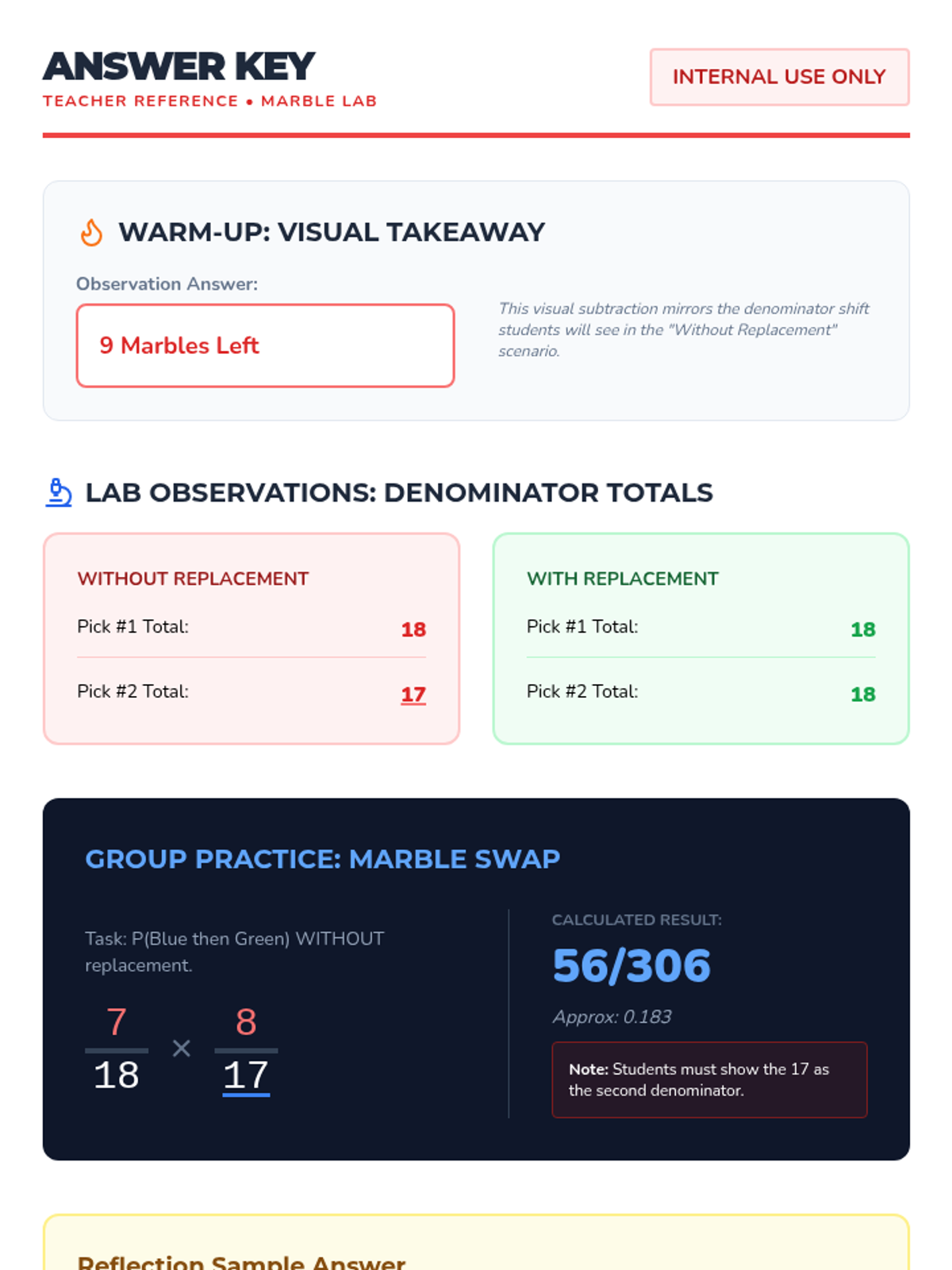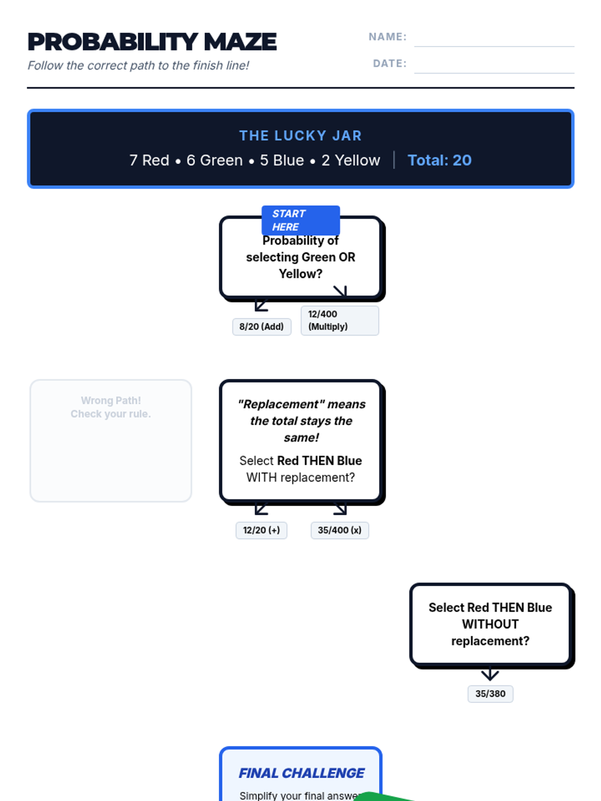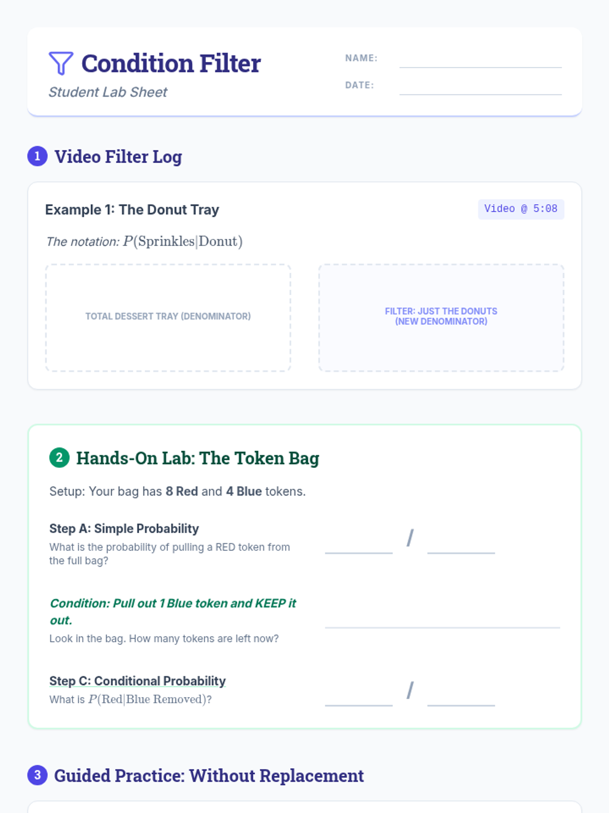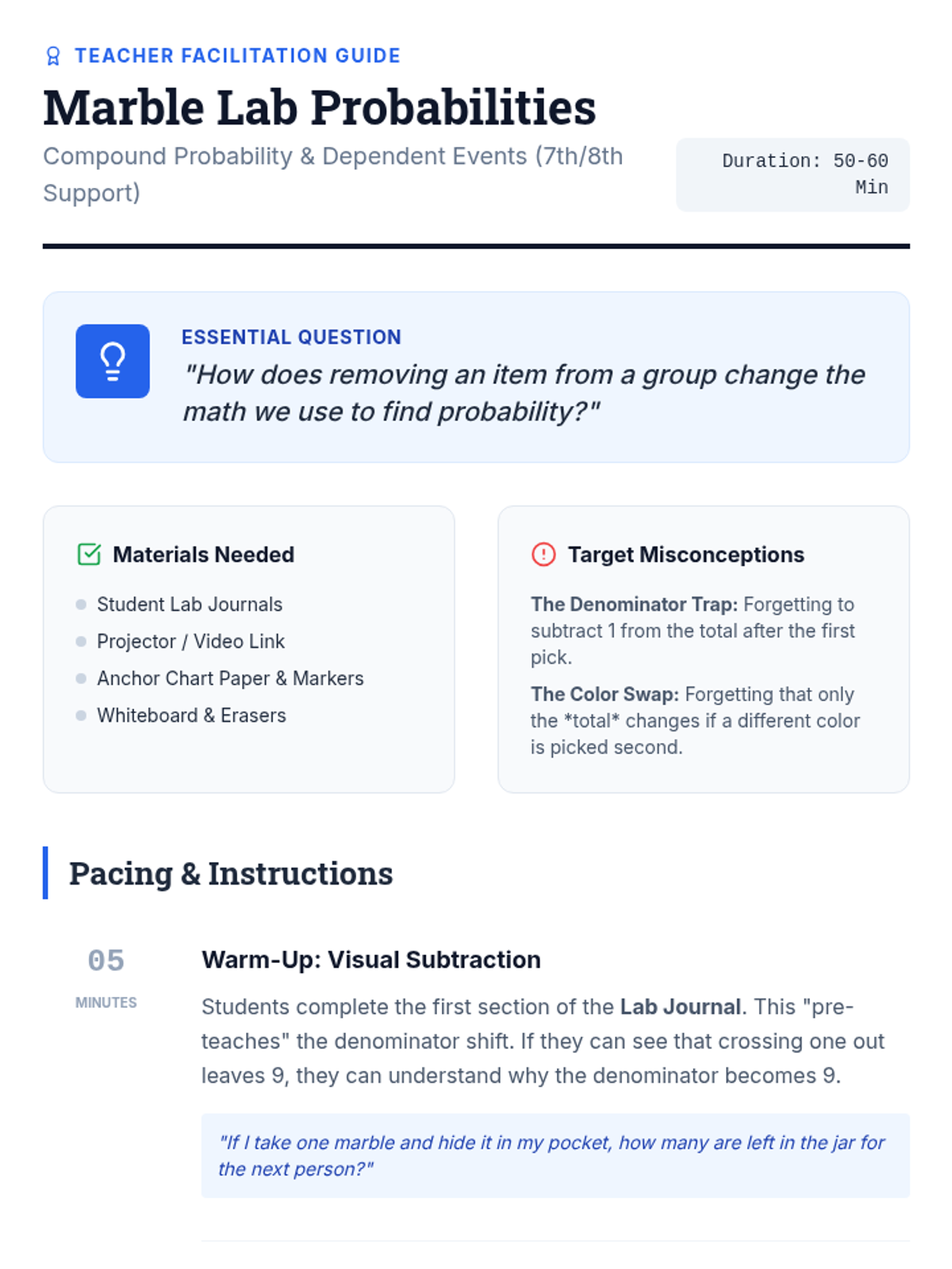 A visual exploration of compound probability, focusing on how 'without replacement' scenarios change the sample space. Students use a marble jar motif to track denominator shifts during a guided video viewing and collaborative practice.