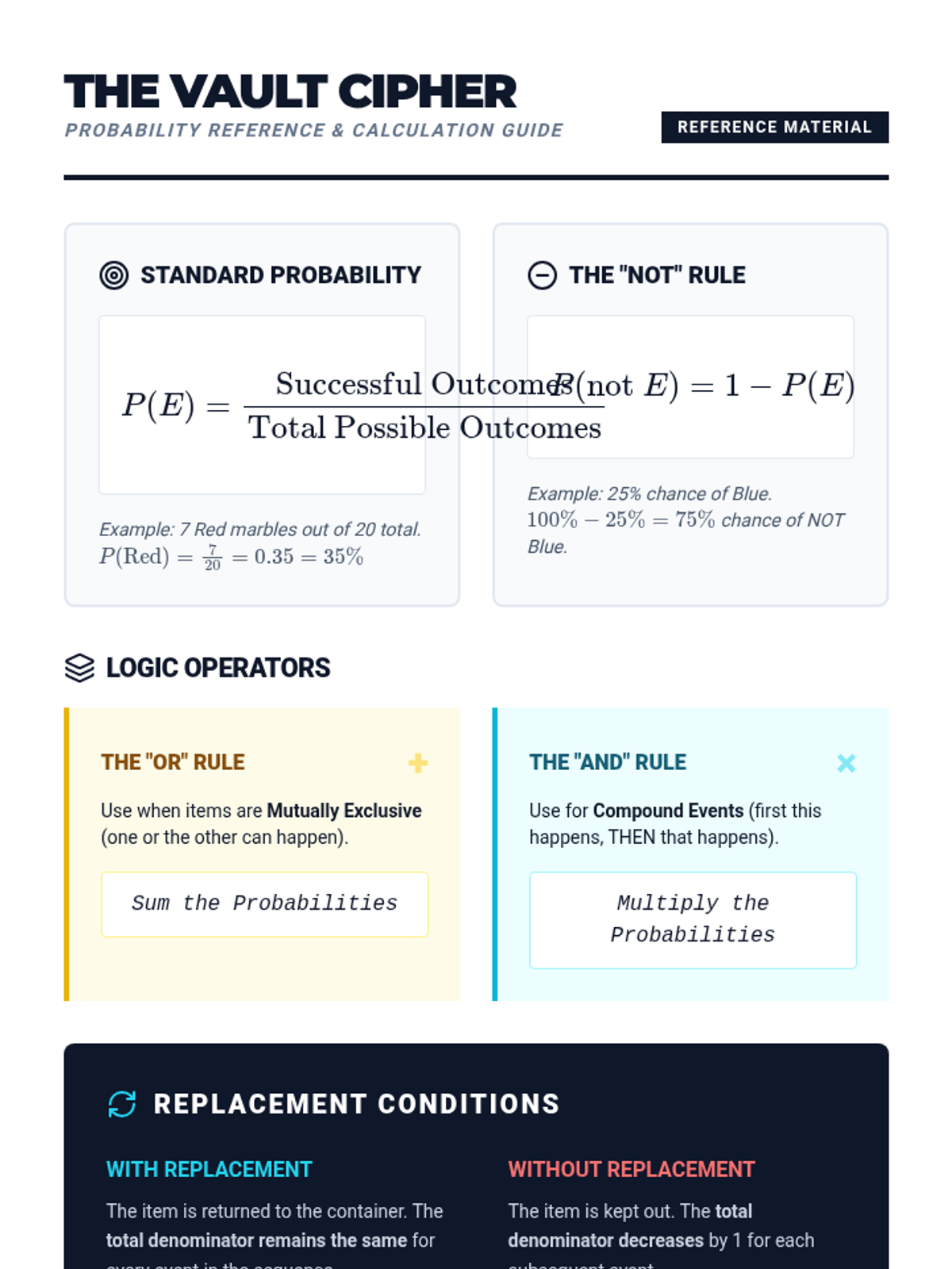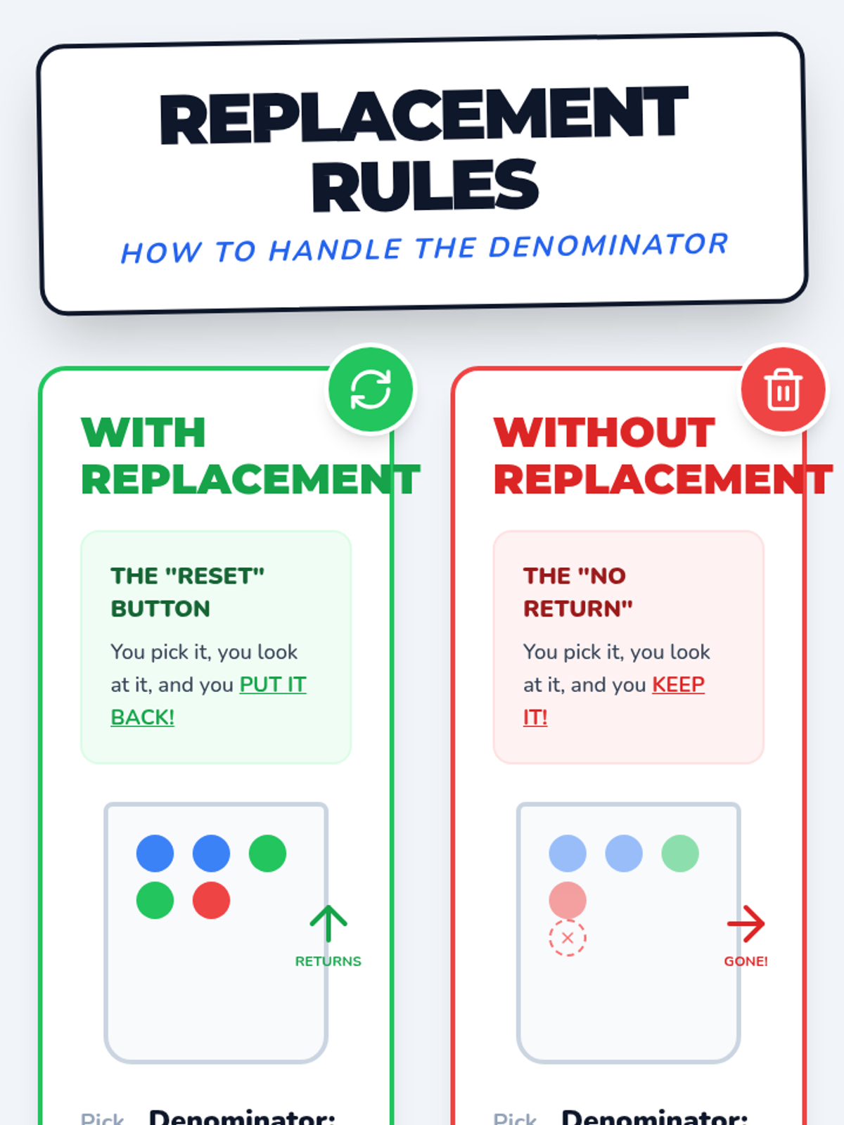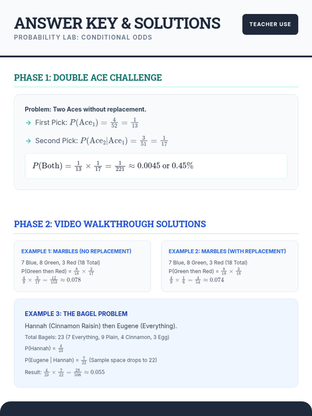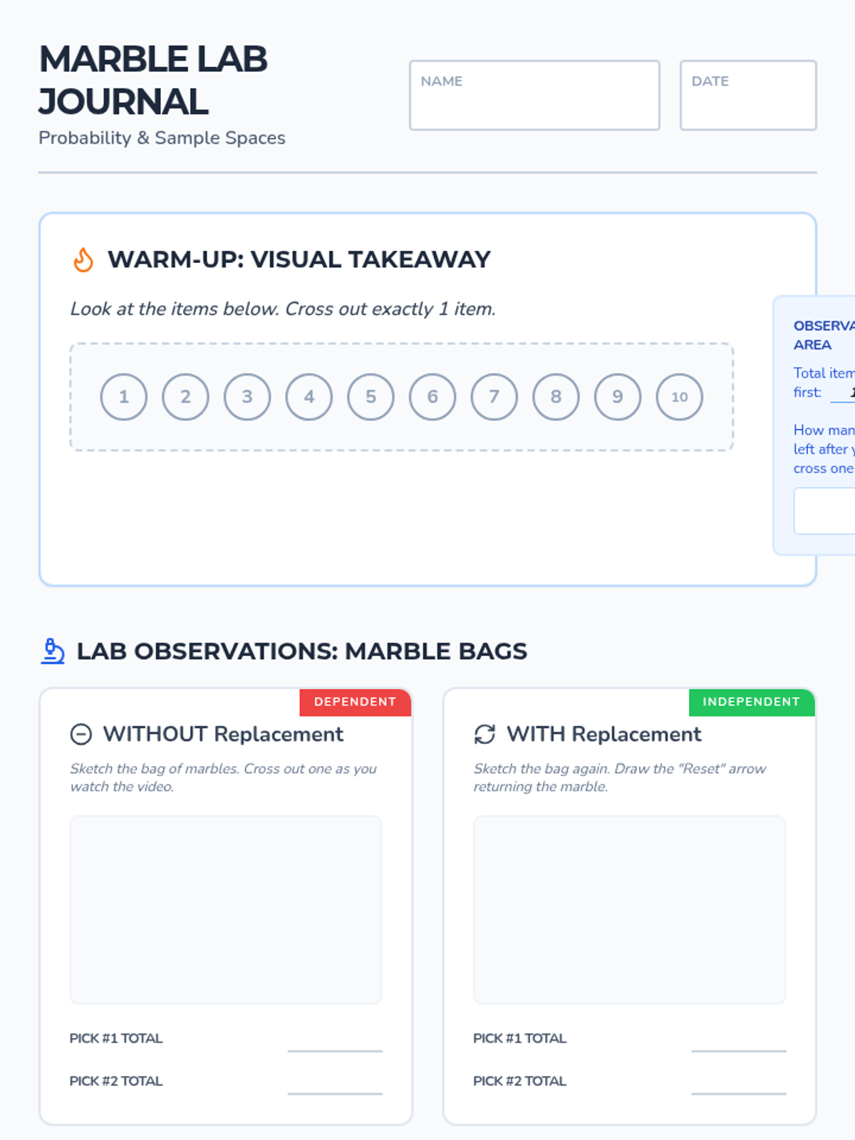 A visual exploration of compound probability, focusing on how 'without replacement' scenarios change the sample space. Students use a marble jar motif to track denominator shifts during a guided video viewing and collaborative practice.
