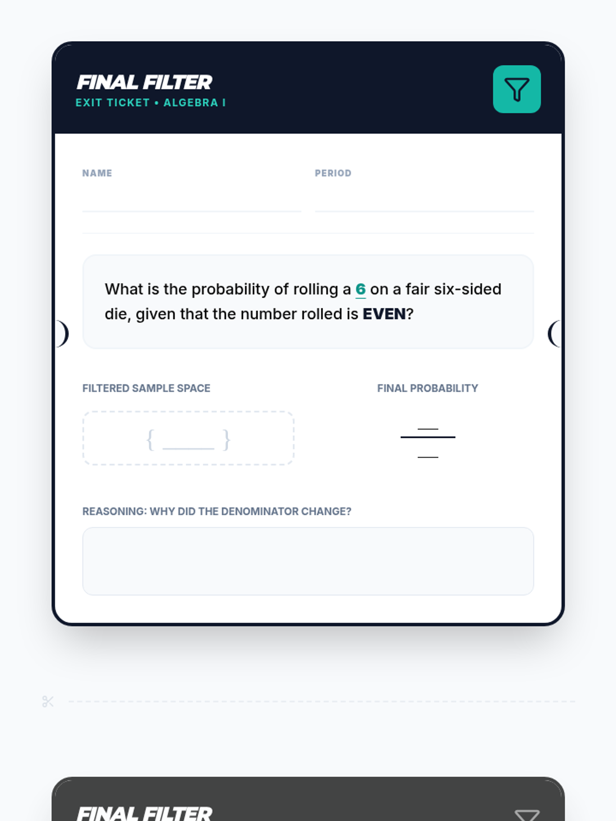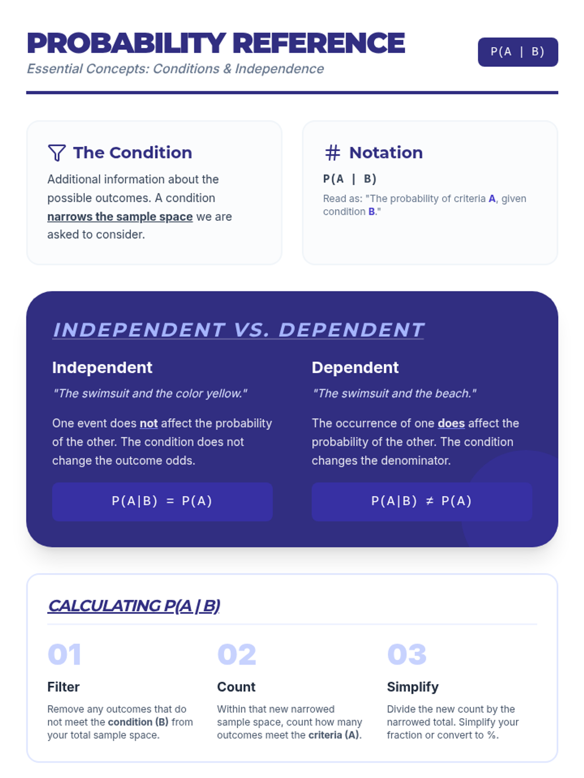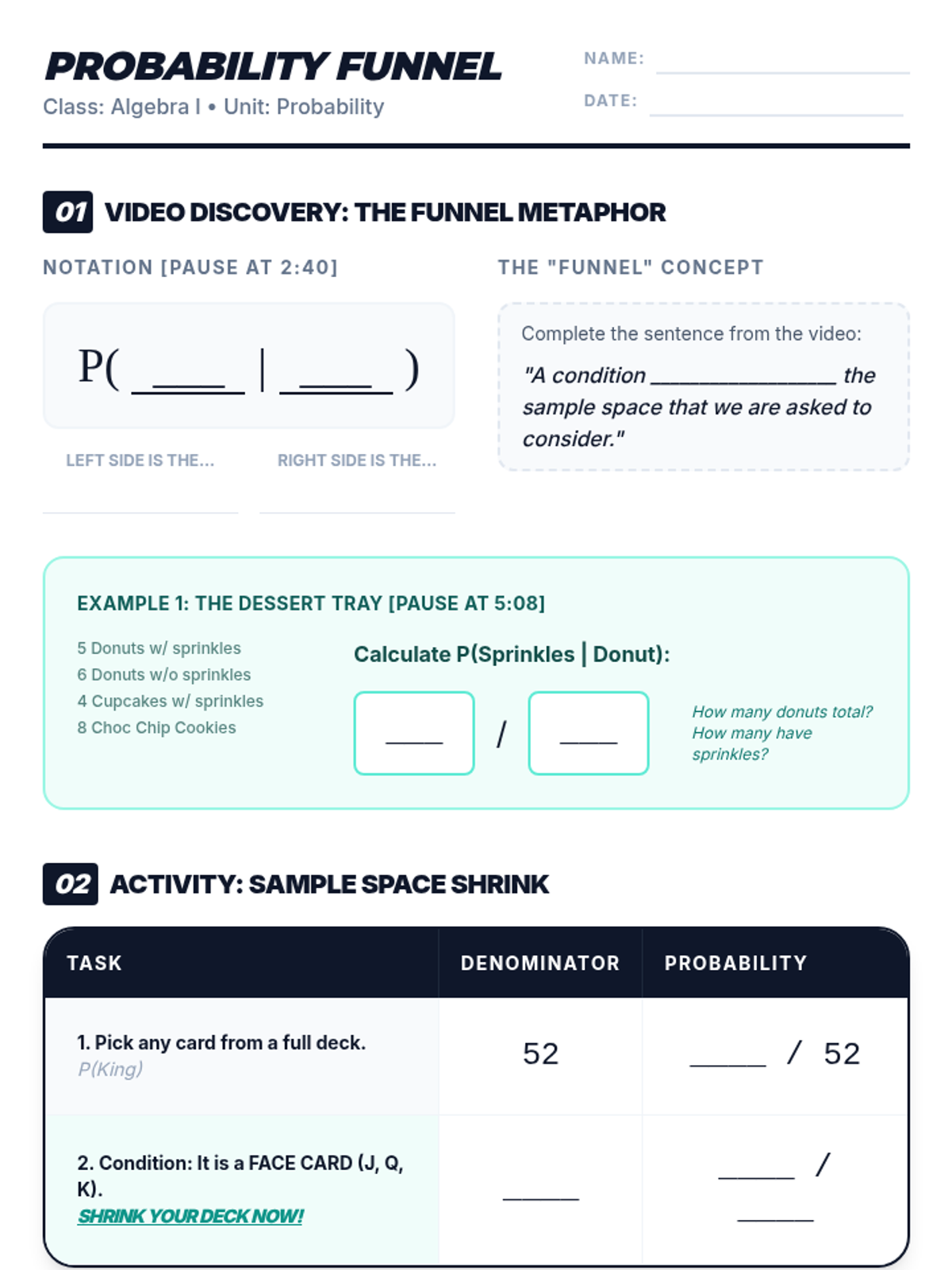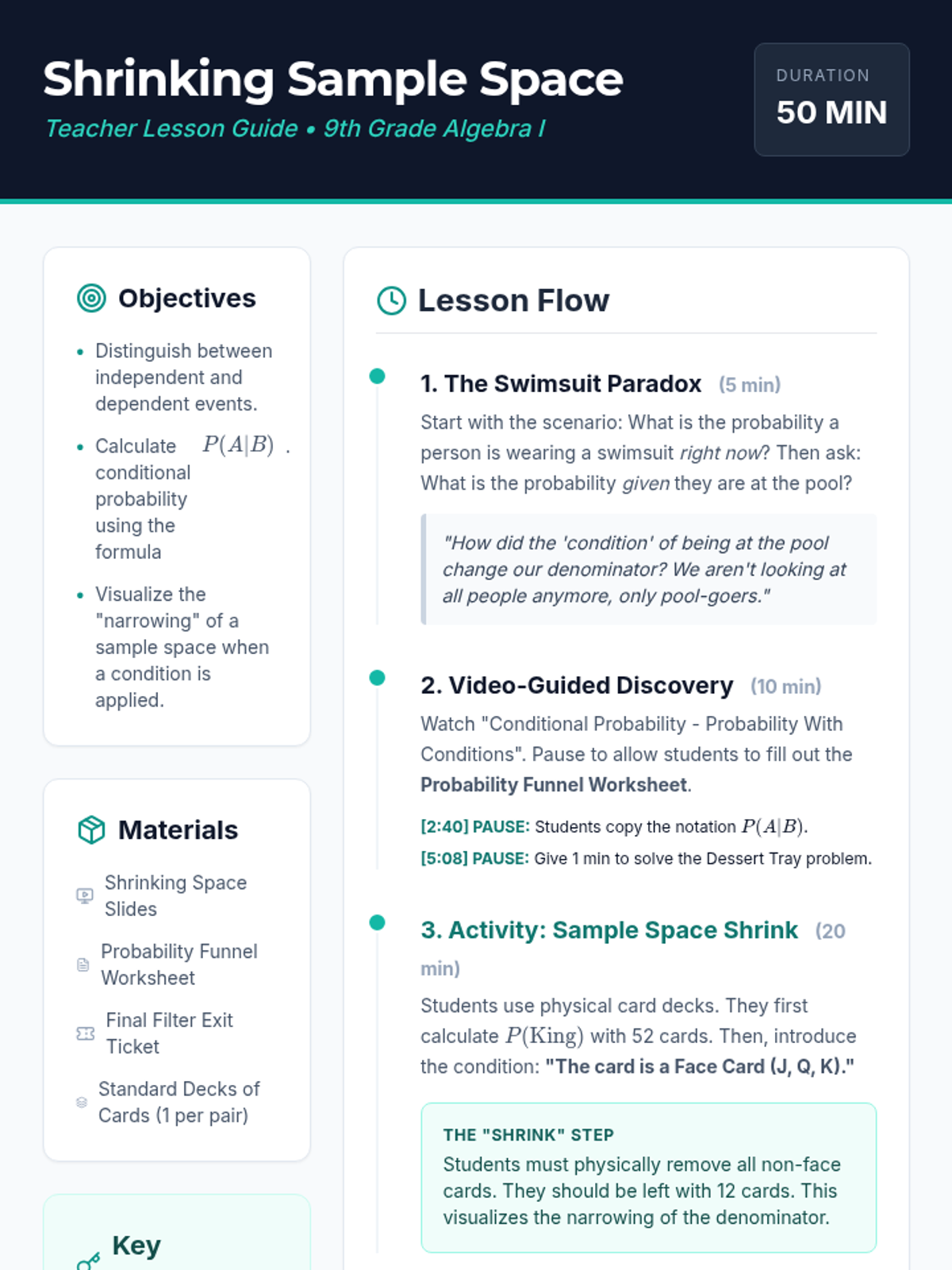 A comprehensive 9th-grade Algebra I lesson on conditional probability, focusing on how conditions narrow the sample space using the 'funnel' metaphor. Includes video-guided notes, a hands-on card-sorting activity, and conceptual checks on independent vs. dependent events.
