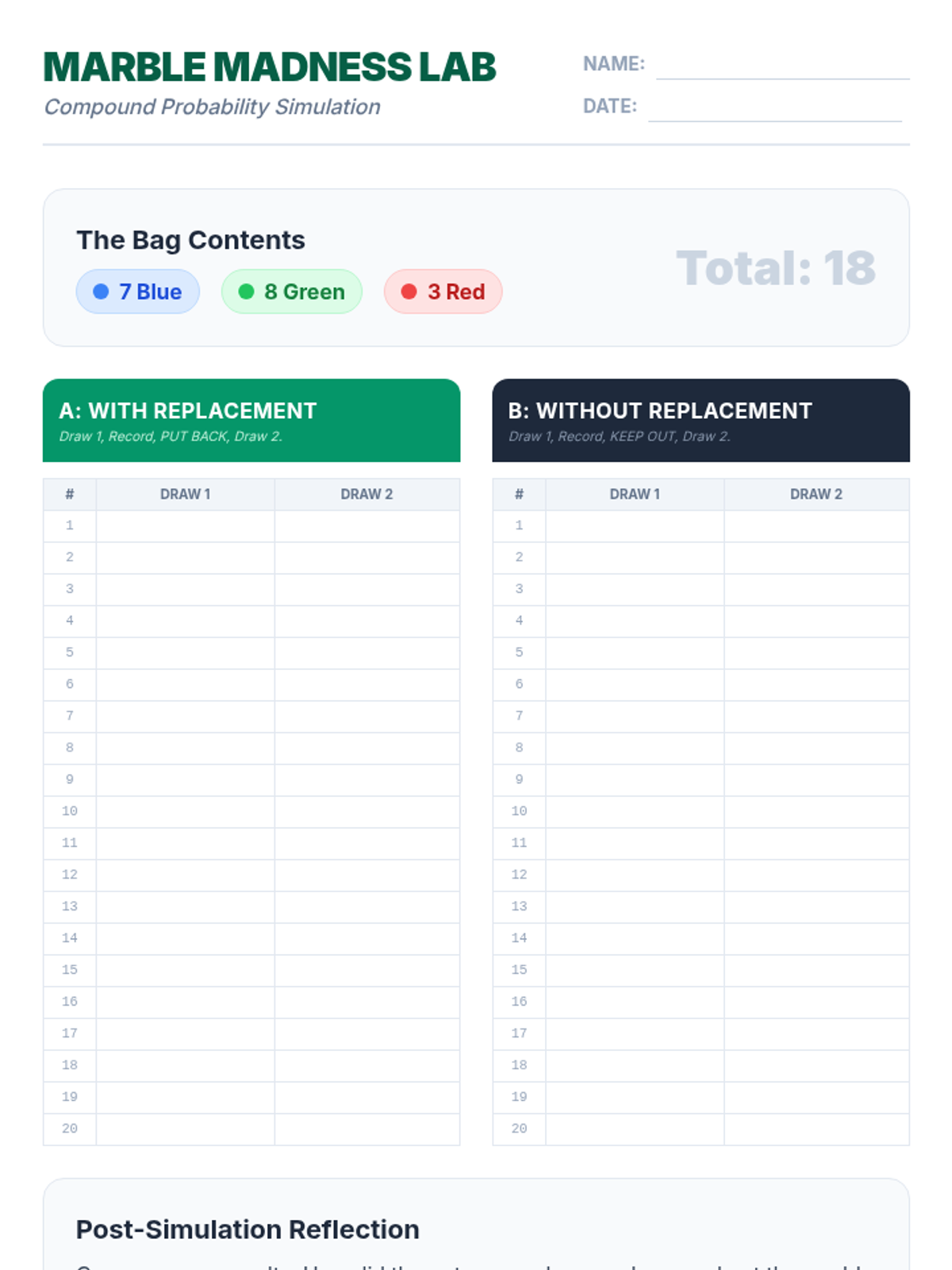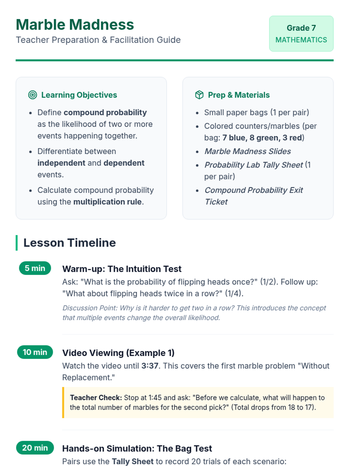 A hands-on 7th-grade math lesson where students use colored counters to discover the difference between independent and dependent compound events, supported by a video walkthrough and data collection.