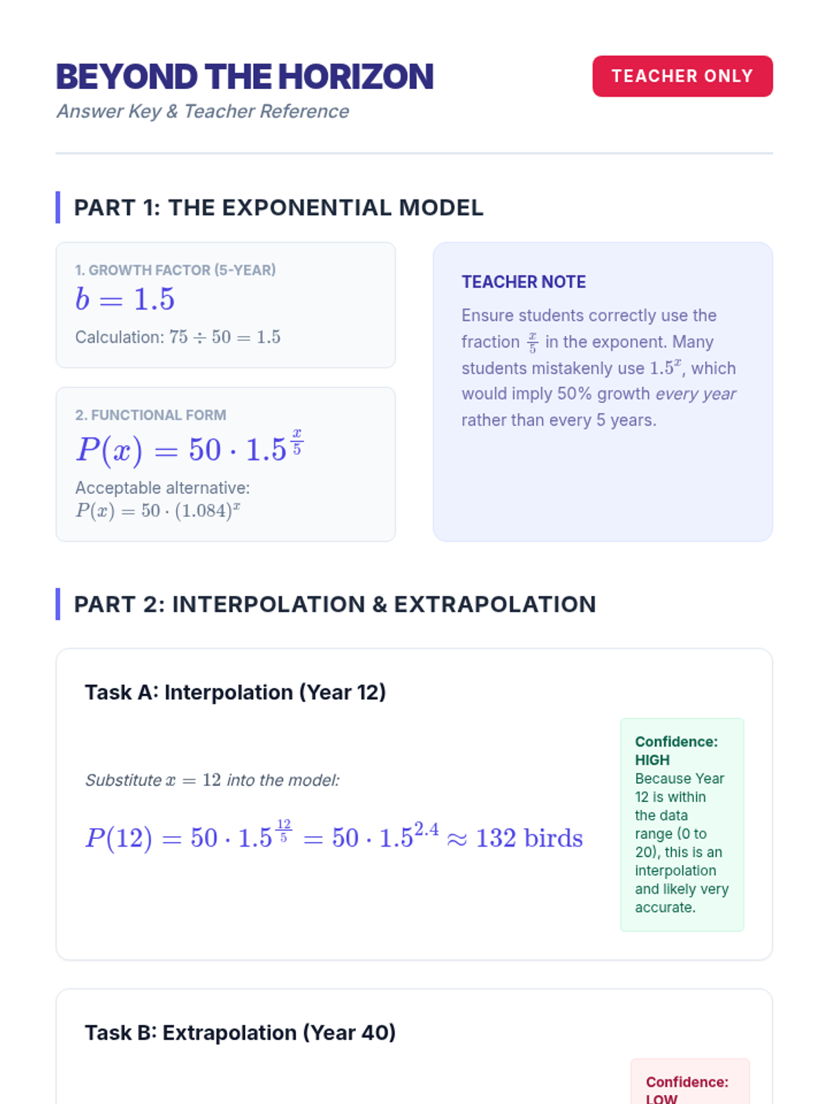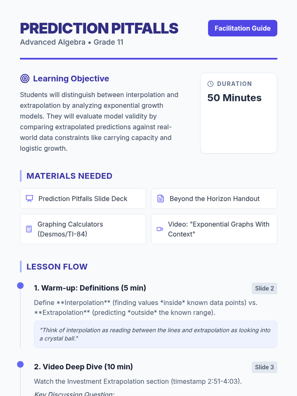 An 11th Grade Advanced Algebra lesson exploring the boundaries of mathematical modeling. Students distinguish between interpolation and extrapolation while analyzing when exponential models fail due to real-world constraints like carrying capacity.