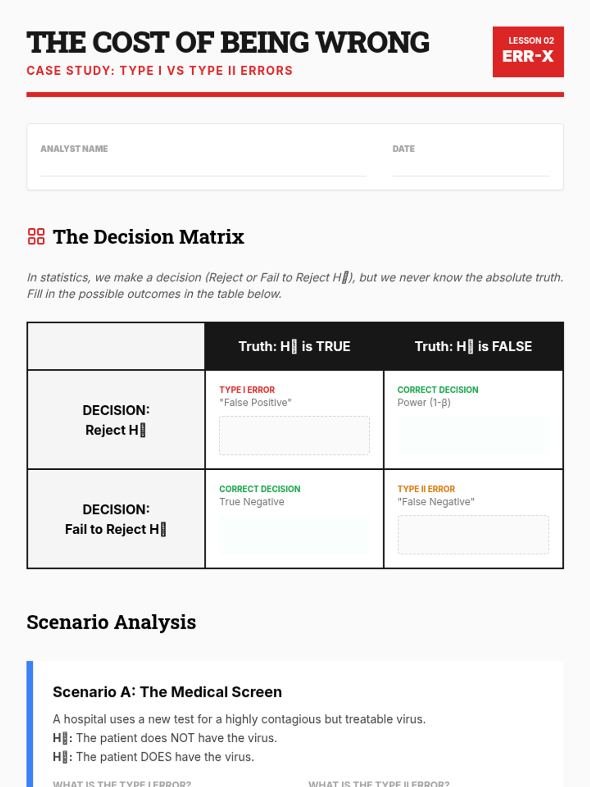 Students explore the trade-offs between Type I and Type II errors through a courtroom analogy and medical scenarios, understanding the real-world consequences of statistical decision-making.