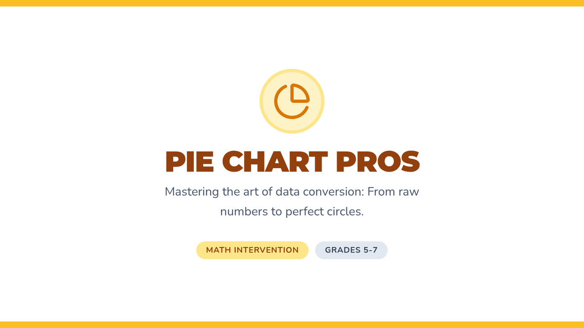 A math intervention lesson focused on converting data into pie graph components through fractions, decimals, percentages, and degrees. Students follow a structured workflow modeled after a financial budget scenario to master circle graph construction.