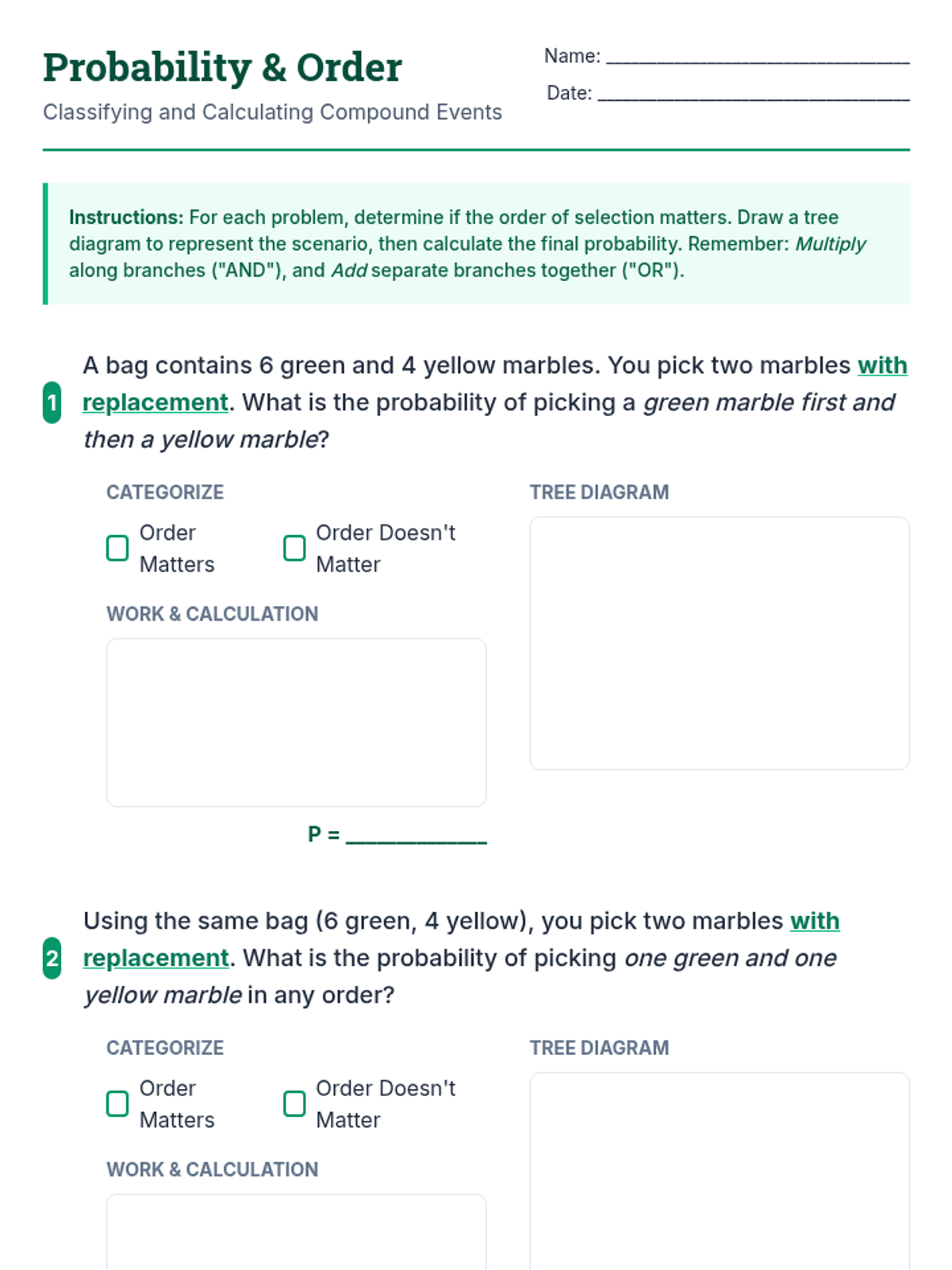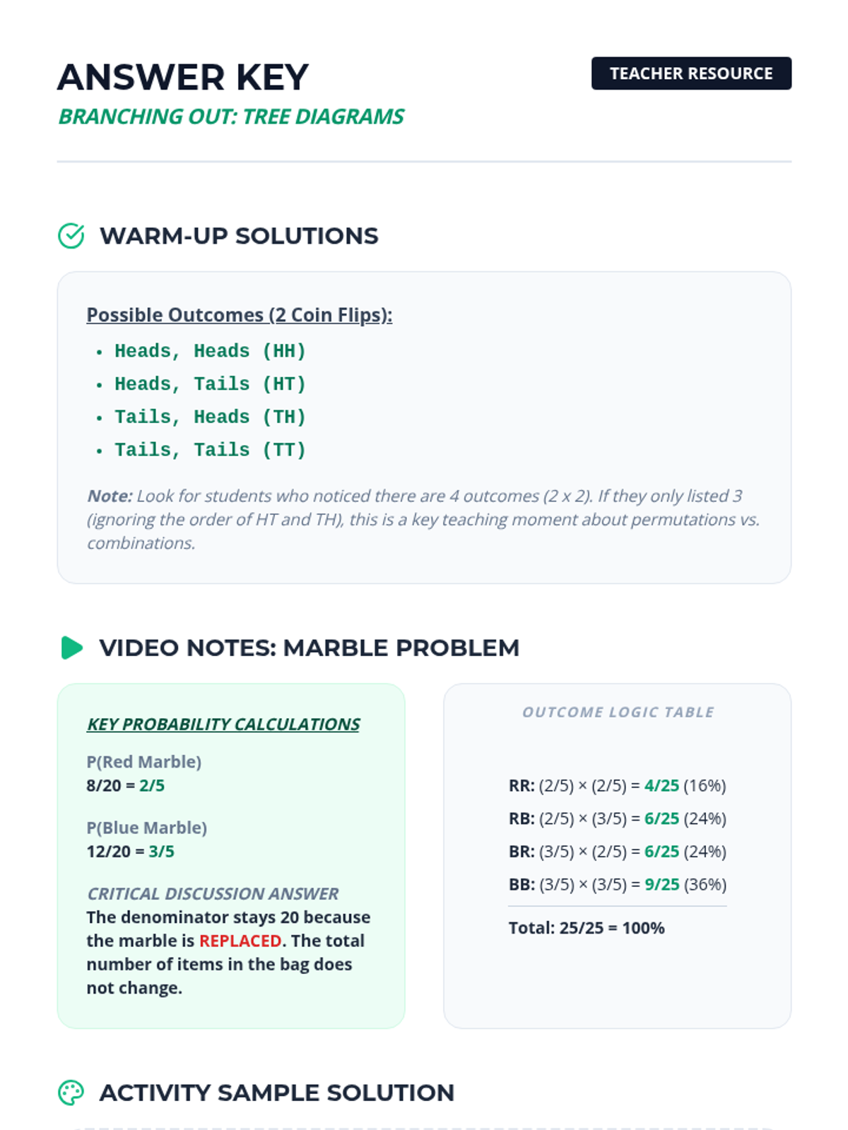 Students analyze compound events with and without replacement, comparing the probability of specific sequences versus general outcomes using tree diagrams.
