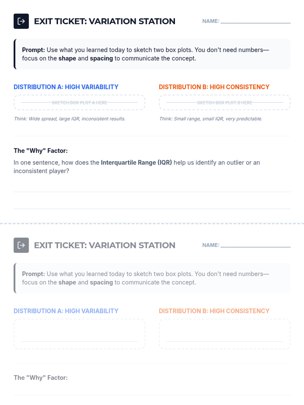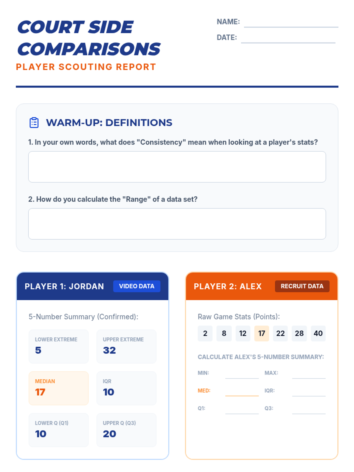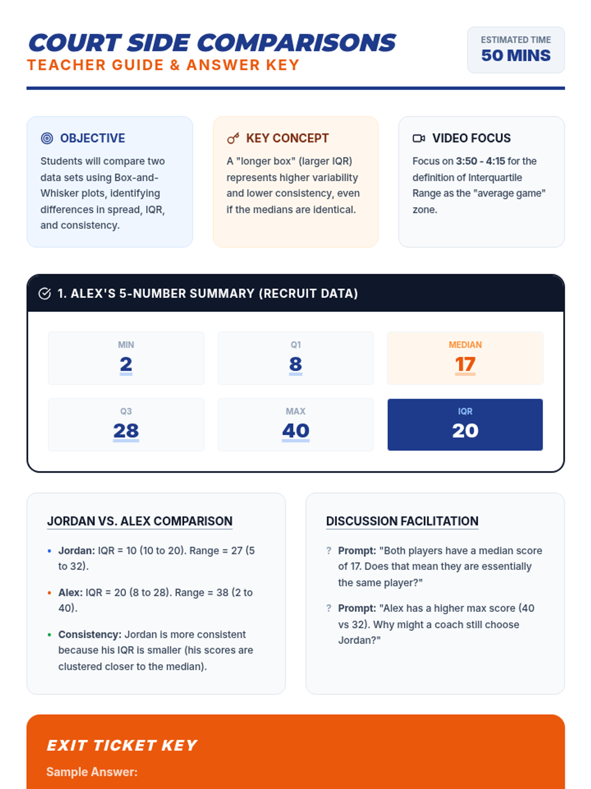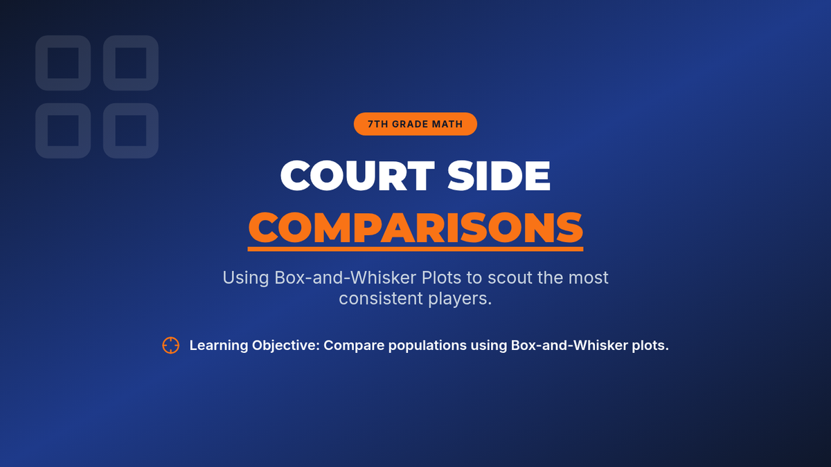 A lesson on using Box-and-Whisker plots to compare two sets of basketball player data, focusing on consistency, range, and the Interquartile Range (IQR).