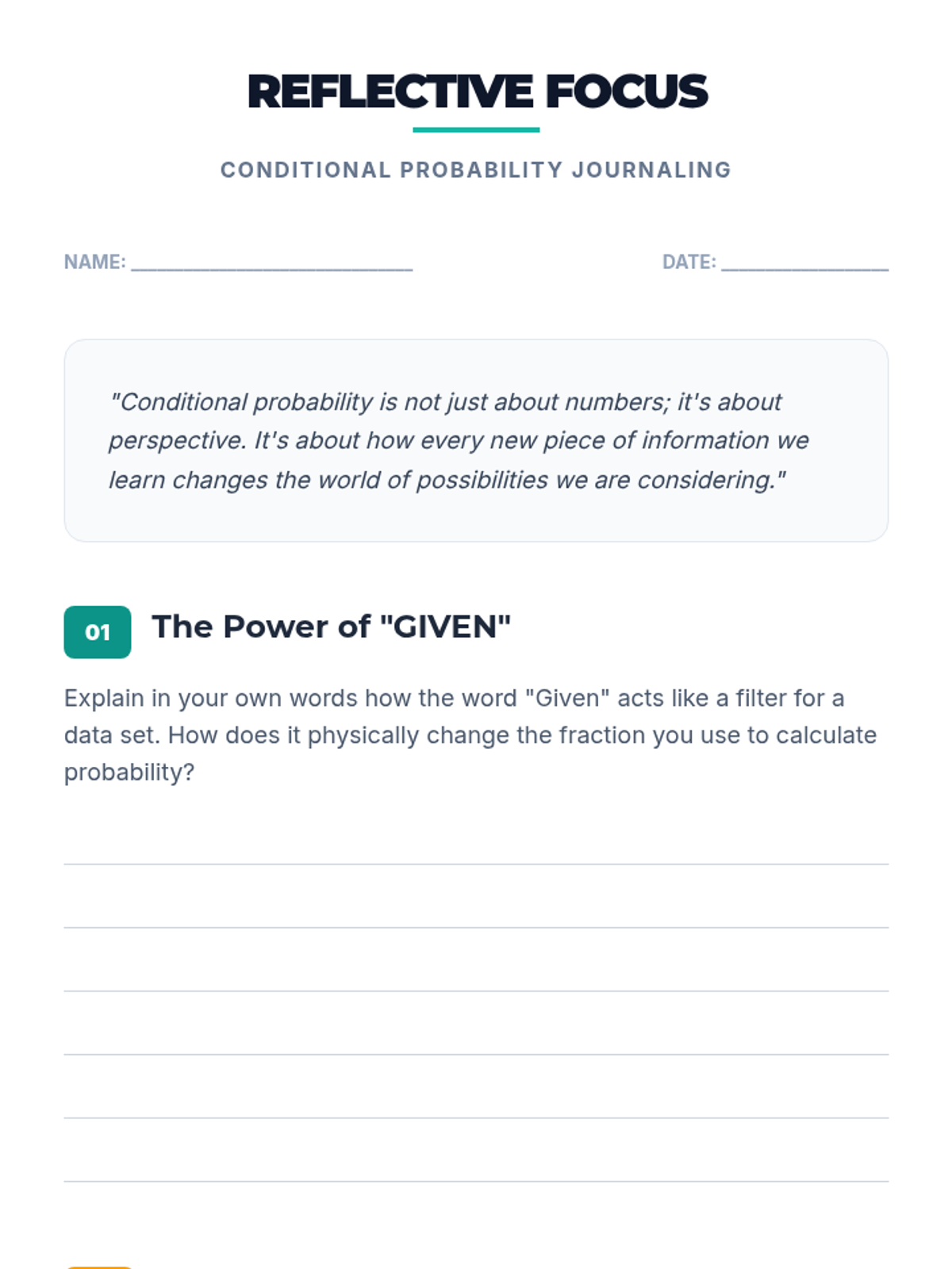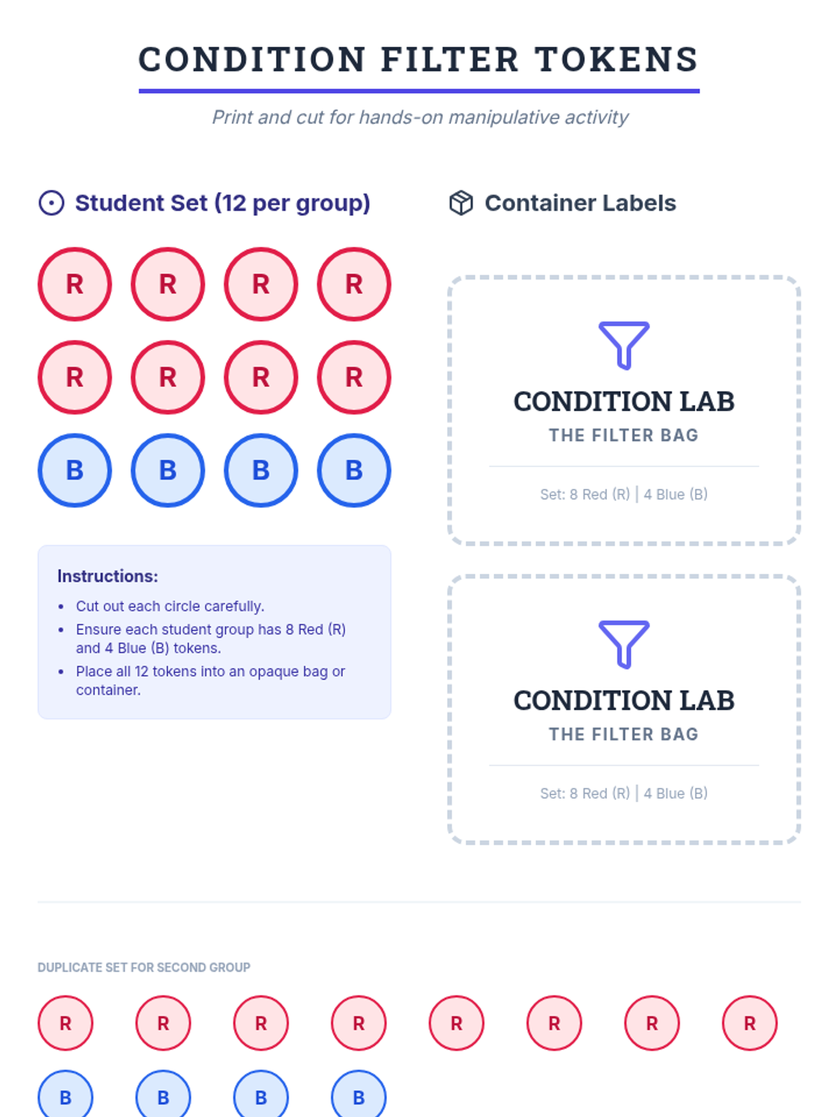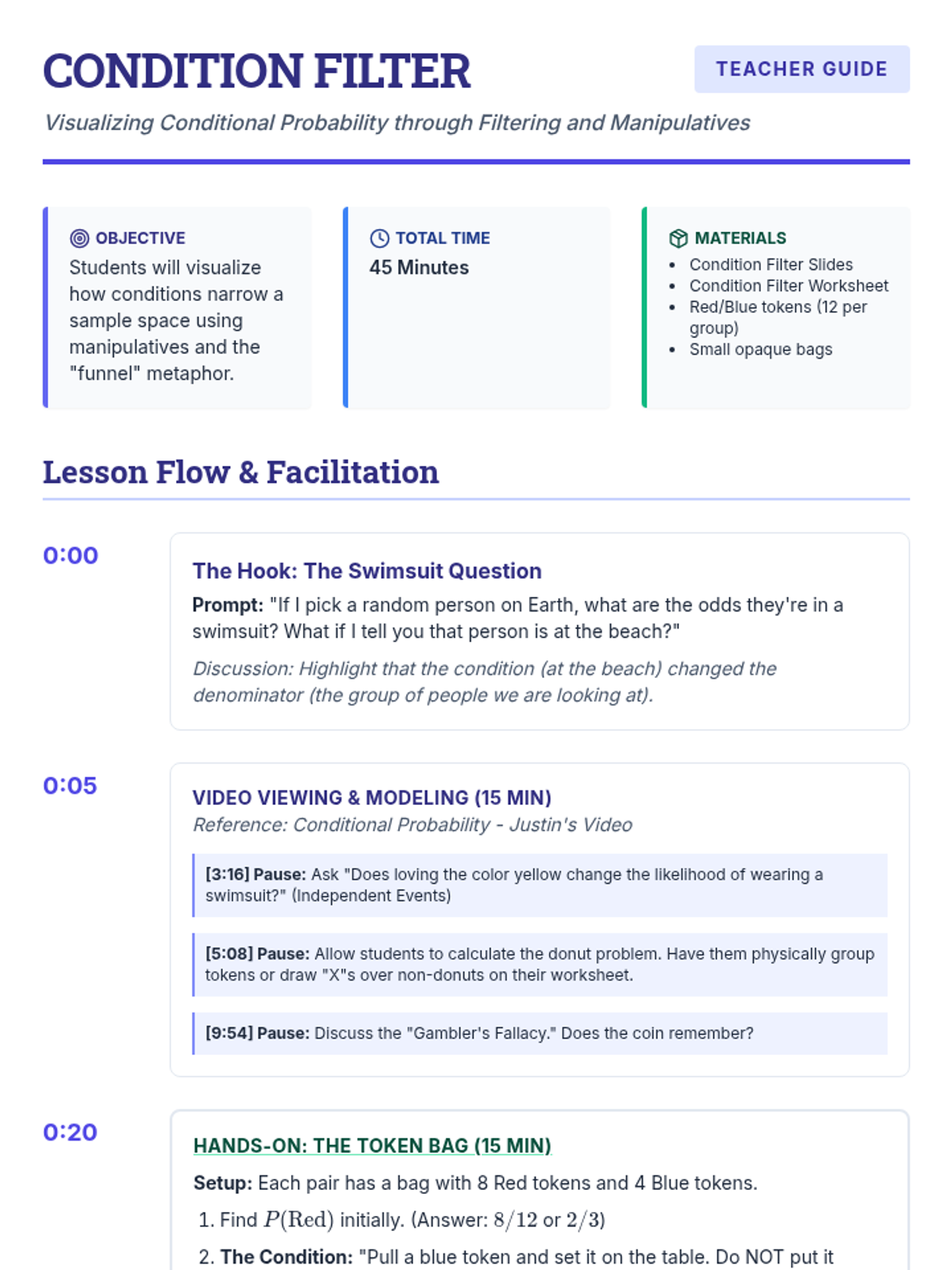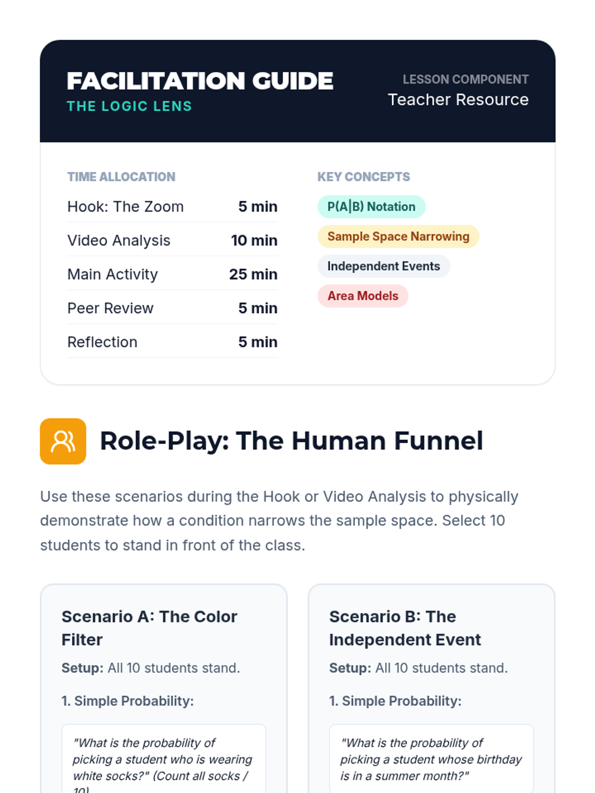 A high school math intervention lesson focusing on visualizing conditional probability through the 'funnel' metaphor and hands-on manipulatives. Students explore how conditions narrow the sample space and distinguish between independent and dependent events.