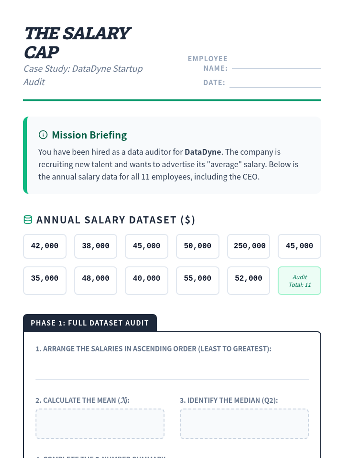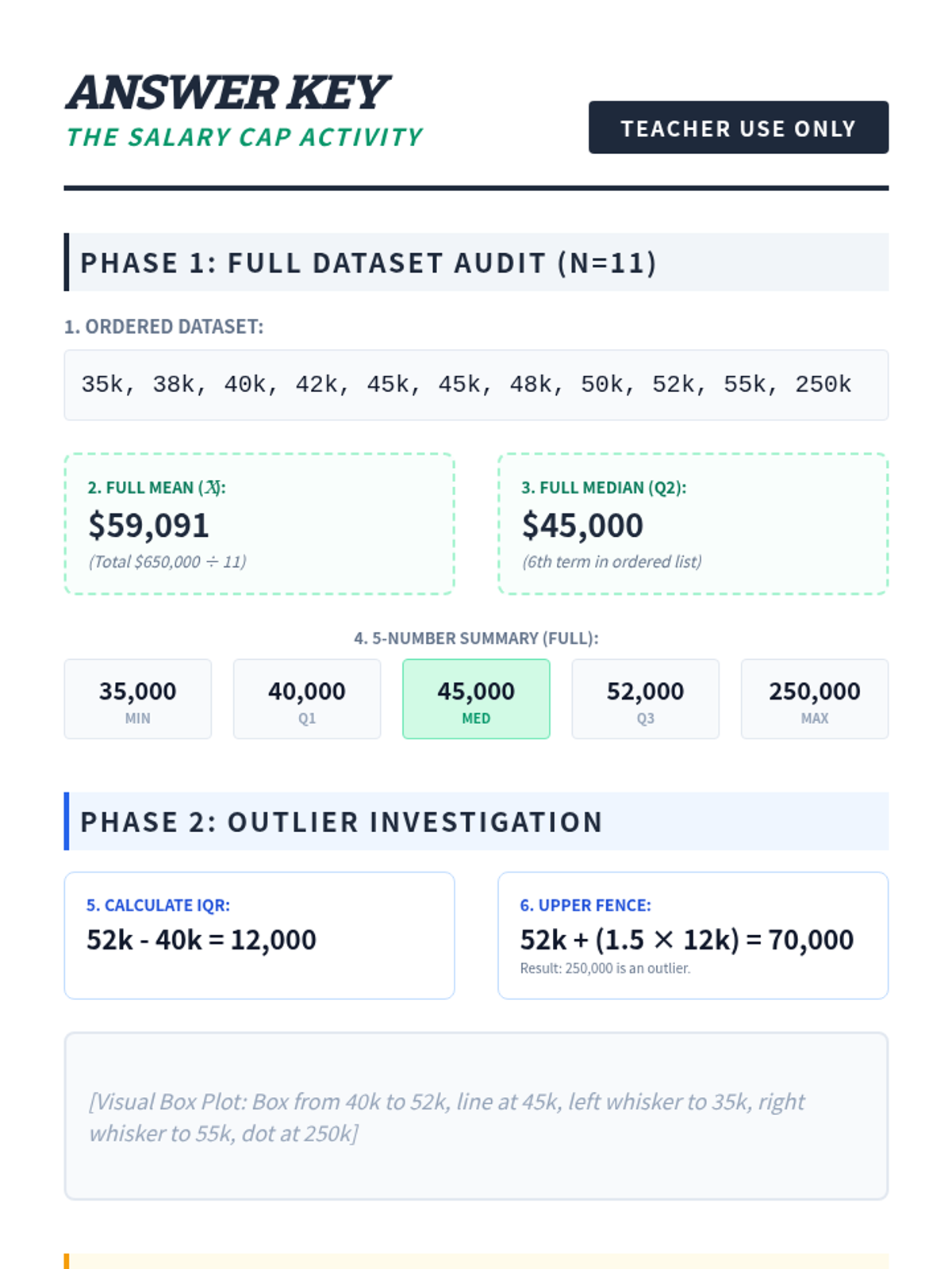 Students will investigate how extreme values (outliers) affect the mean and median using a corporate salary dataset. They will practice calculating the 5-number summary, identifying outliers using the 1.5xIQR rule, and constructing box plots.
