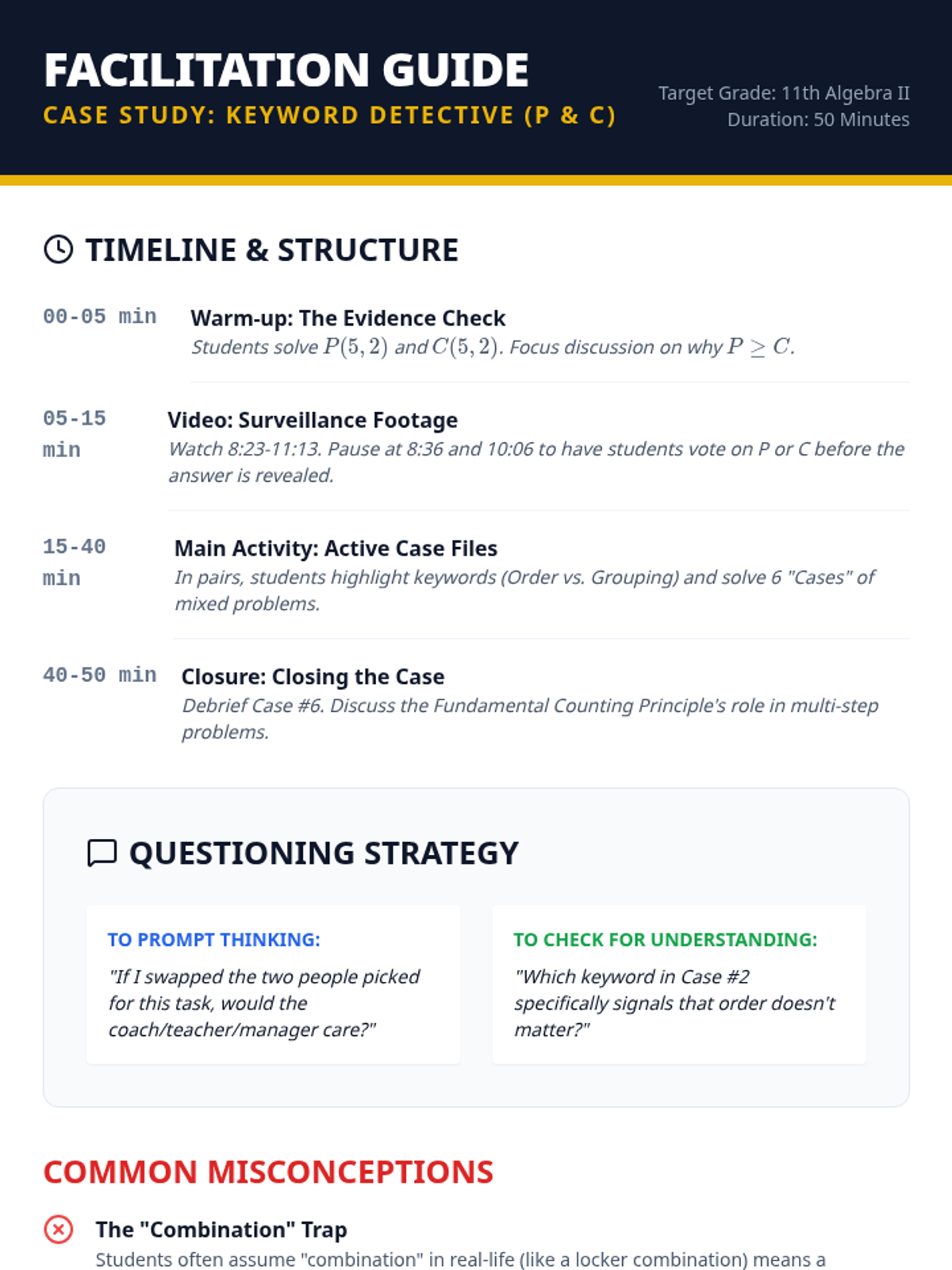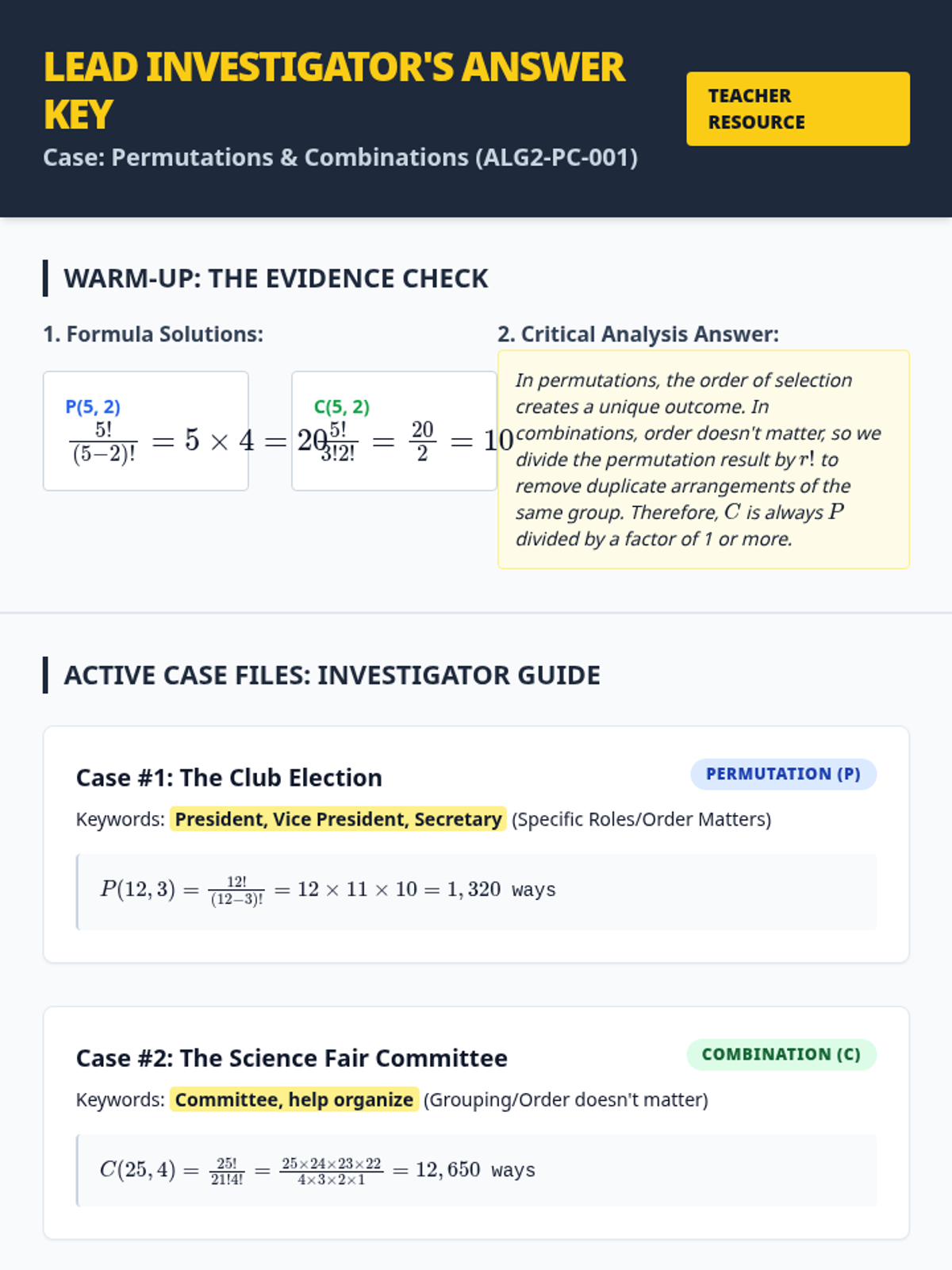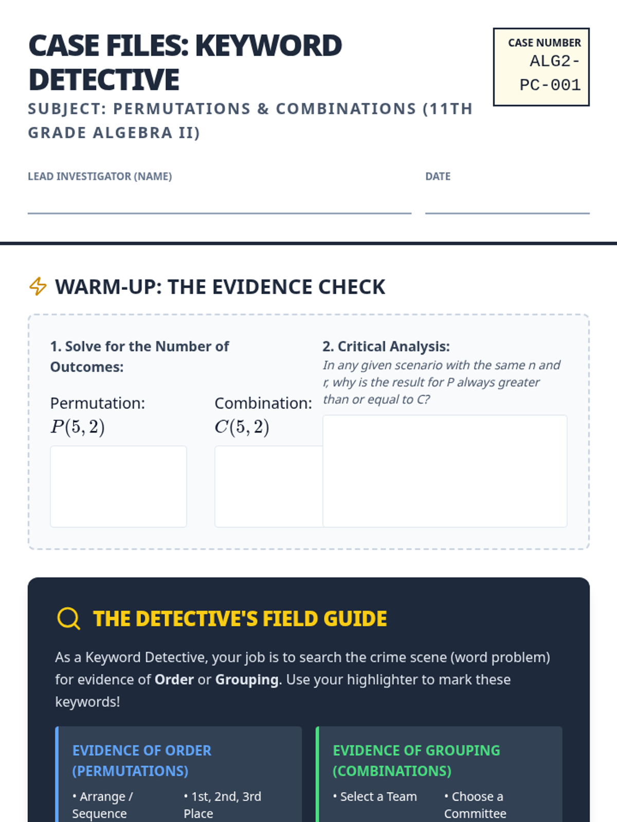Students will master the distinction between permutations and combinations by identifying keywords in complex word problems. This lesson uses a 'Keyword Detective' theme to help students analyze scenarios for order-dependence versus group-membership.