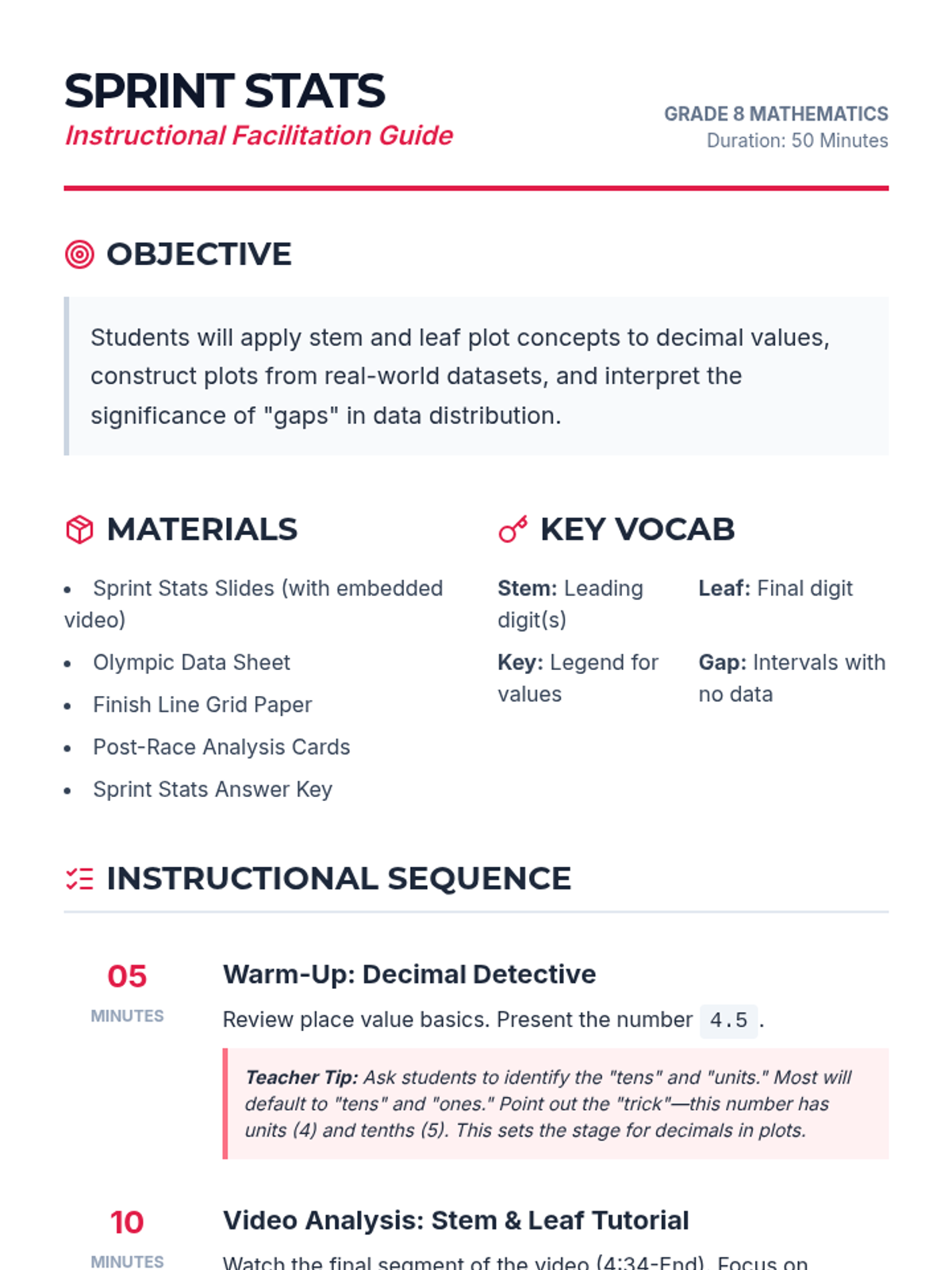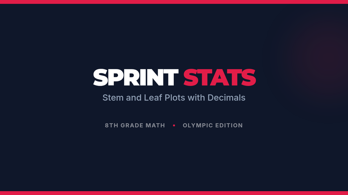A comprehensive 8th-grade math lesson focused on creating and interpreting stem and leaf plots using decimal data, featuring an Olympic sprinting theme and real-world data analysis.