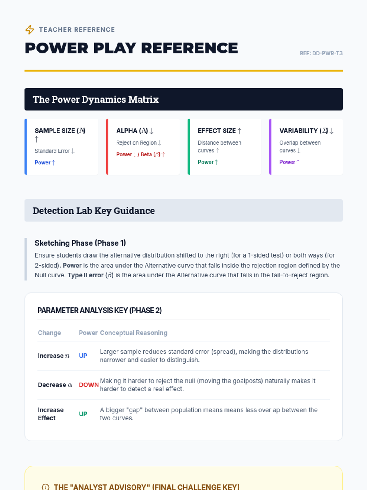 A simulation-based lesson where students manipulate sample size, alpha levels, and effect size to see how they influence a test's ability to detect a true difference between populations.
