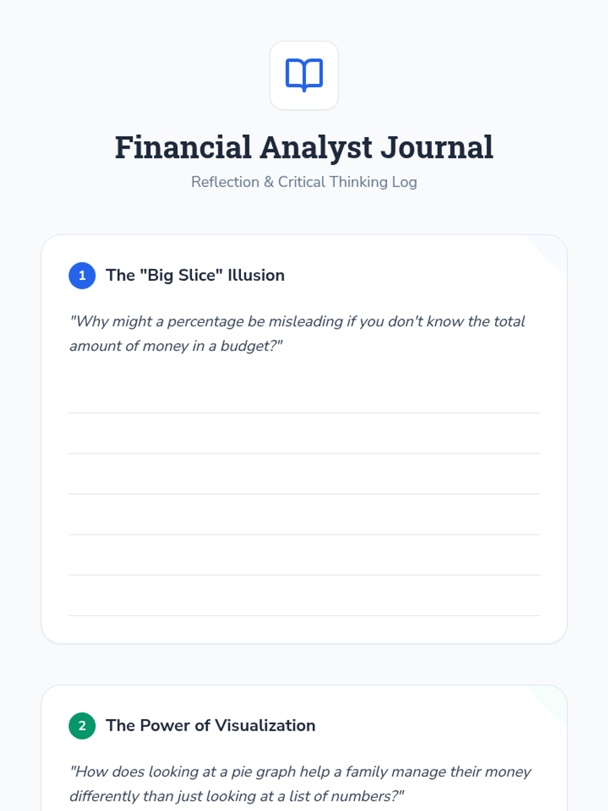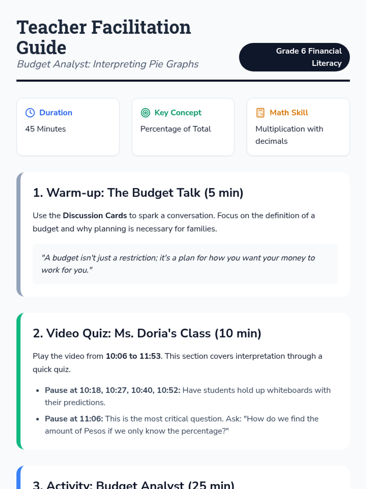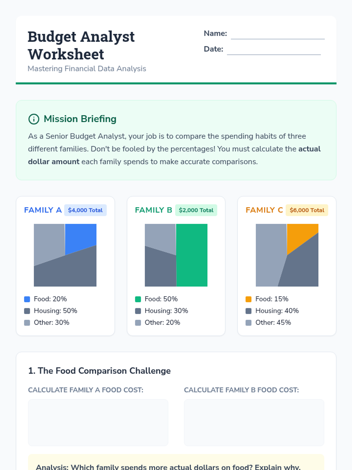 Students will interpret and analyze pie graphs in a financial context, calculating actual dollar amounts from percentages to compare different family budgets. The lesson features a video-guided quiz and a hands-on 'Budget Analyst' activity.