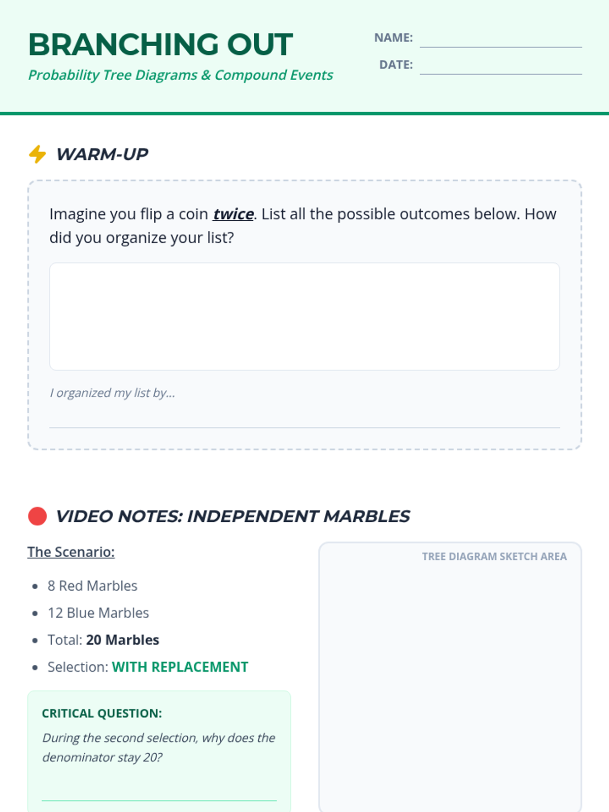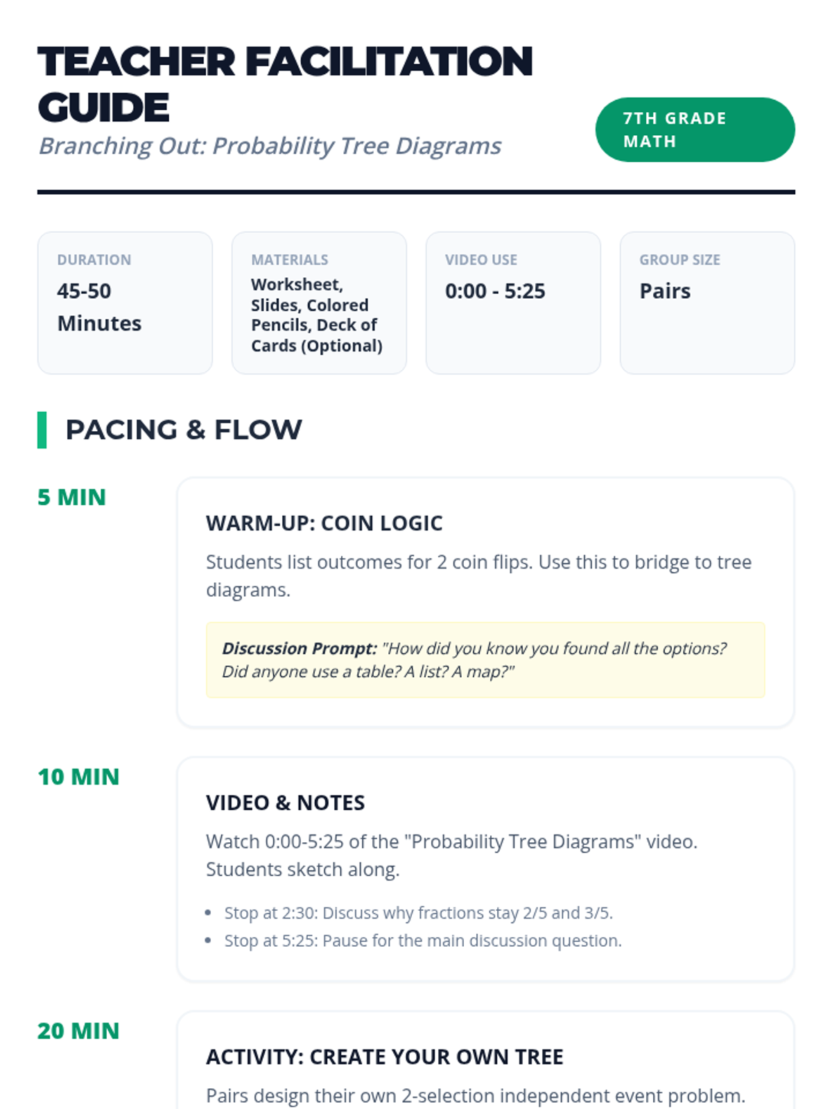 A comprehensive lesson on probability tree diagrams and compound events for 7th-grade students, featuring a video-based exploration of independent events and a hands-on creative activity.