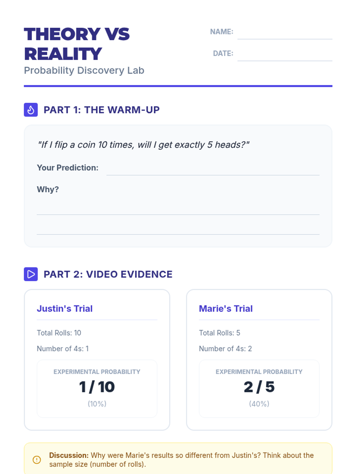 A hands-on exploration of theoretical versus experimental probability using a dice rolling lab and video analysis. Students compare mathematical expectations with real-world data to discover how sample size affects results.
