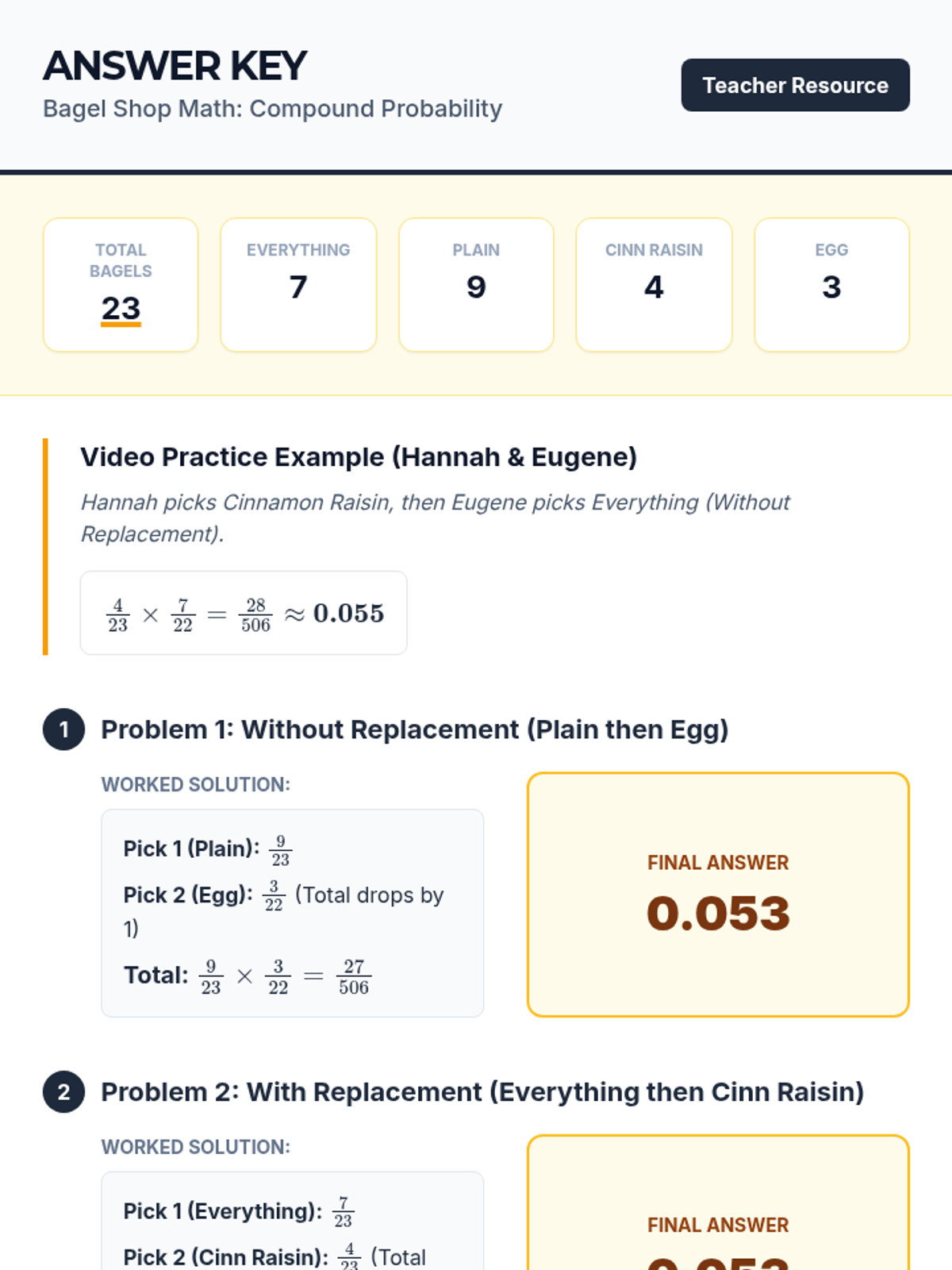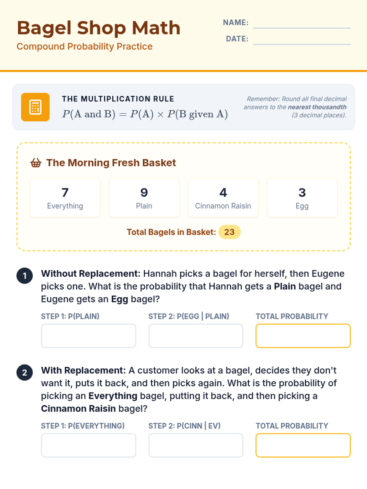 A comprehensive lesson on compound probability where students use the multiplication rule to solve problems involving independent and dependent events, themed around a bagel shop.