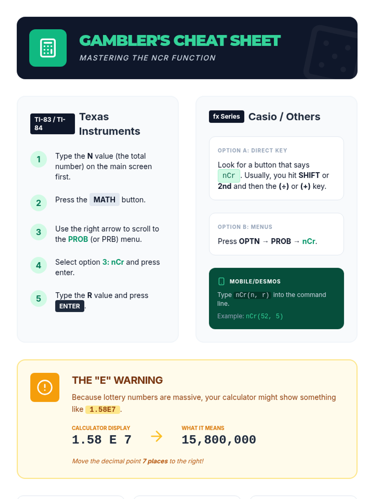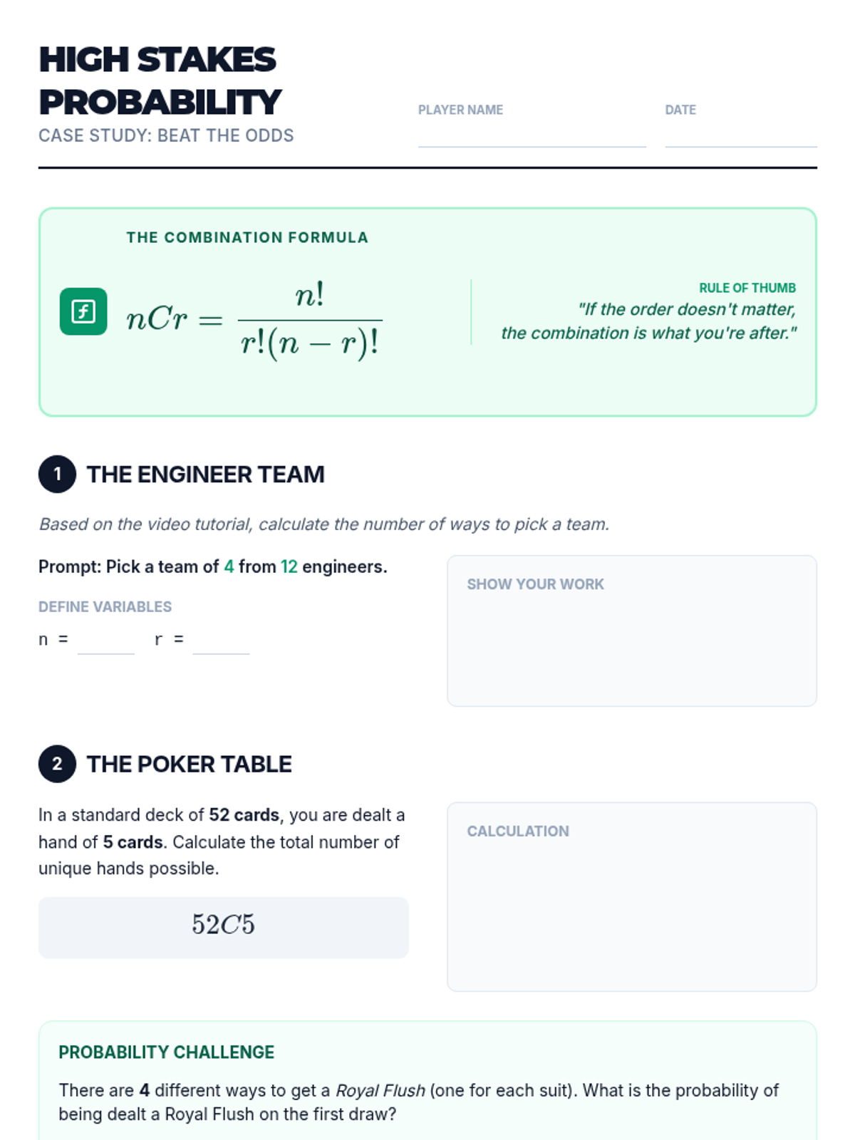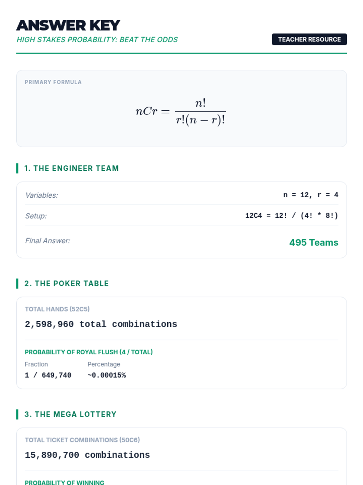 A high-school level math lesson that applies the concept of combinations to real-world scenarios like lottery draws and poker hands. Students explore why order doesn't matter in these contexts and calculate the astronomical odds of winning.