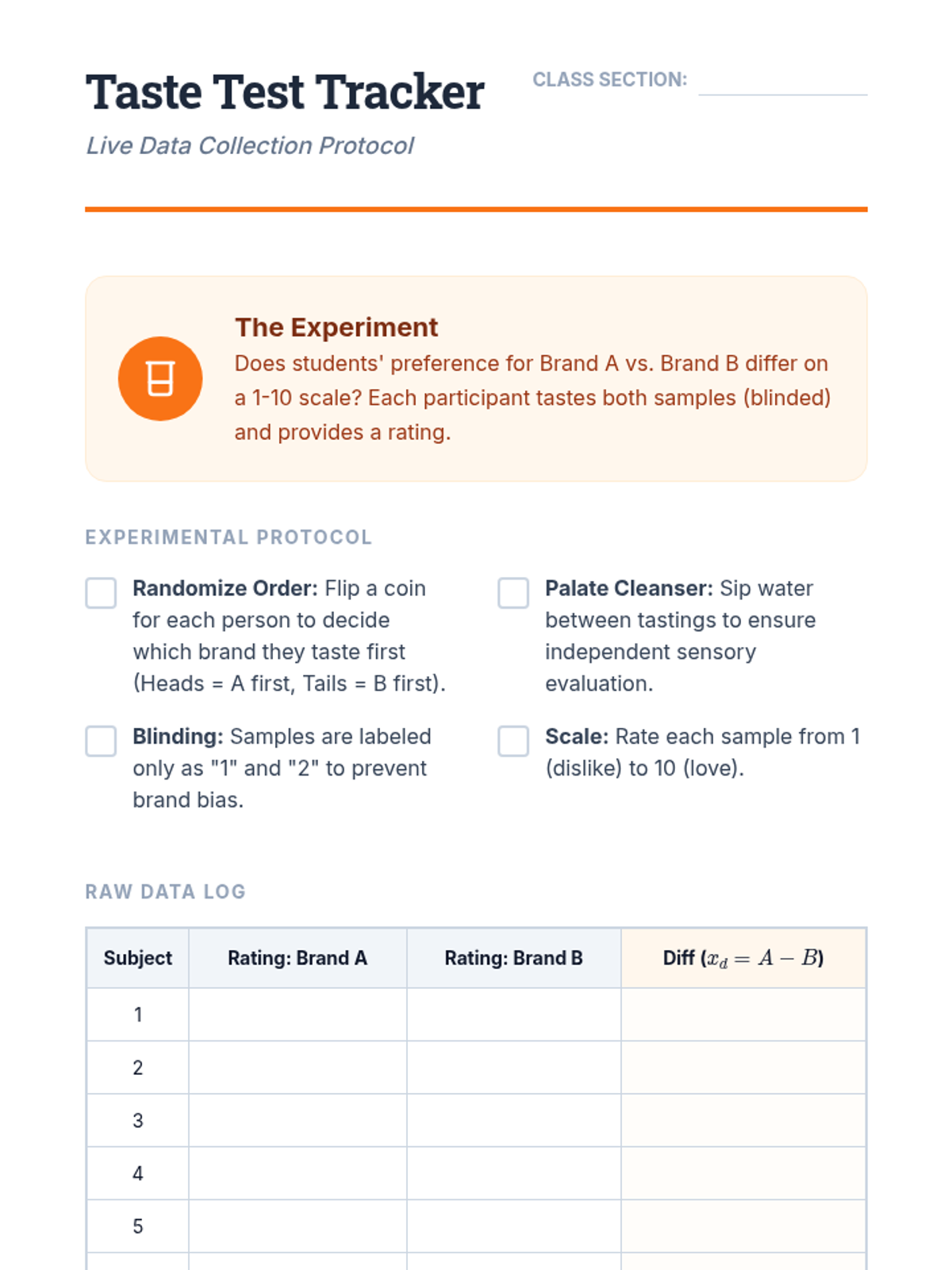 Students participate in a live sensory experiment to generate paired data, performing the complete inference procedure to determine if a preference exists between two products.