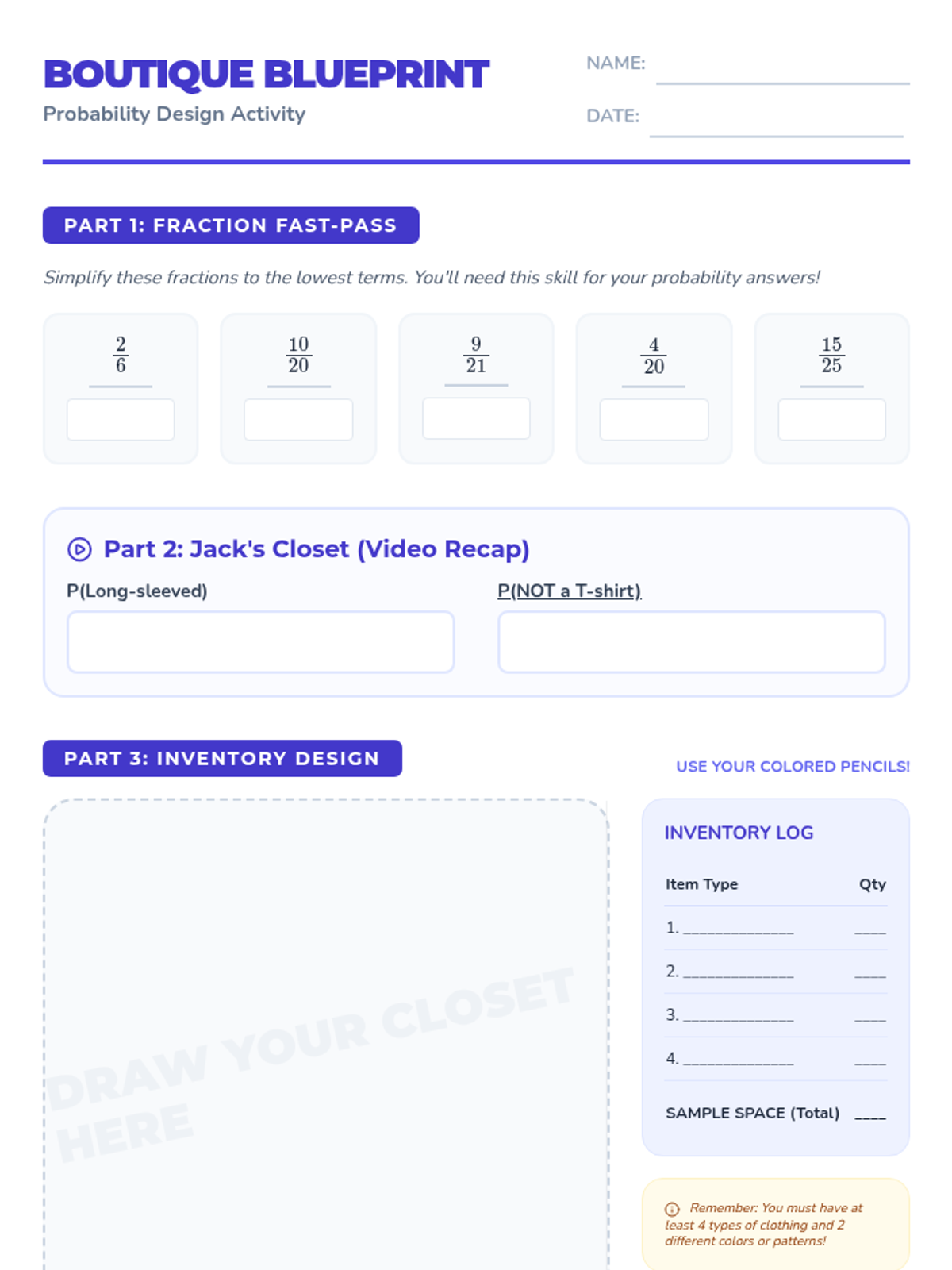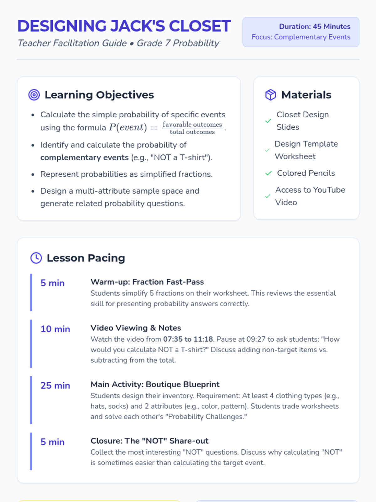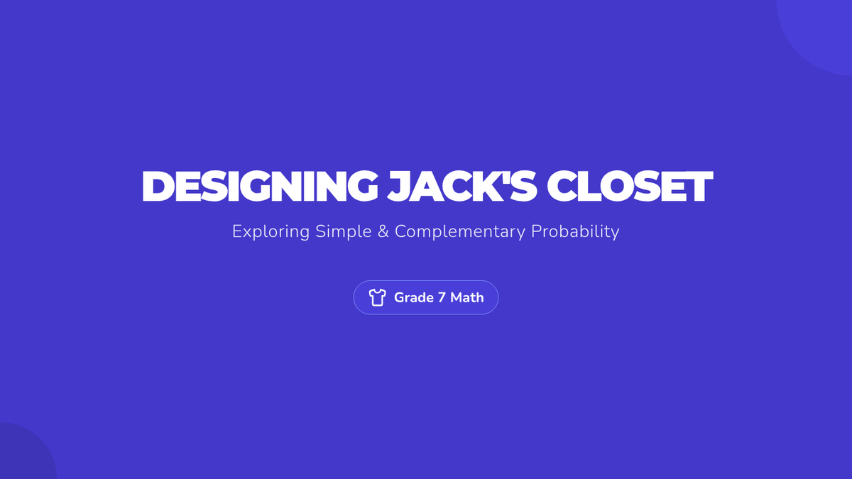 A 7th-grade math lesson where students apply simple and complementary probability concepts to design their own closet inventory and challenge peers with probability questions.