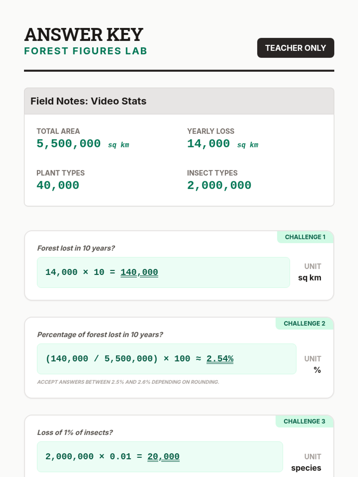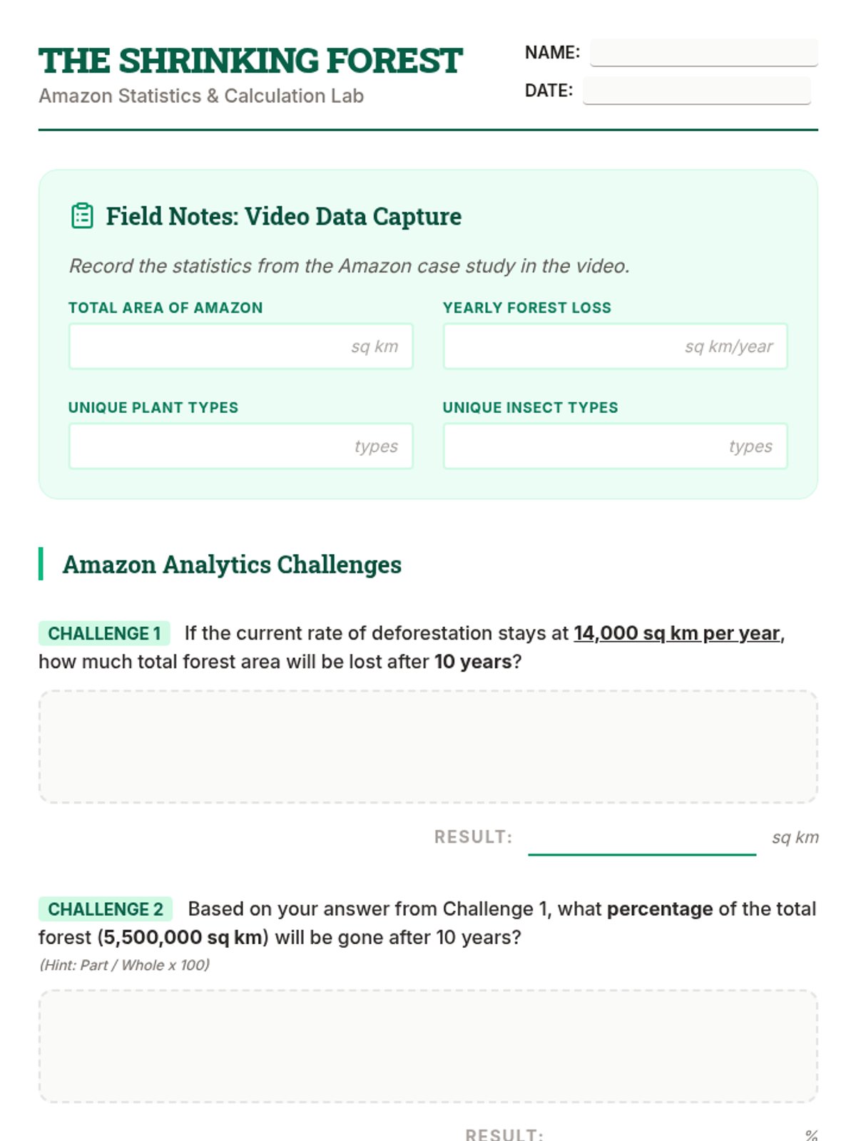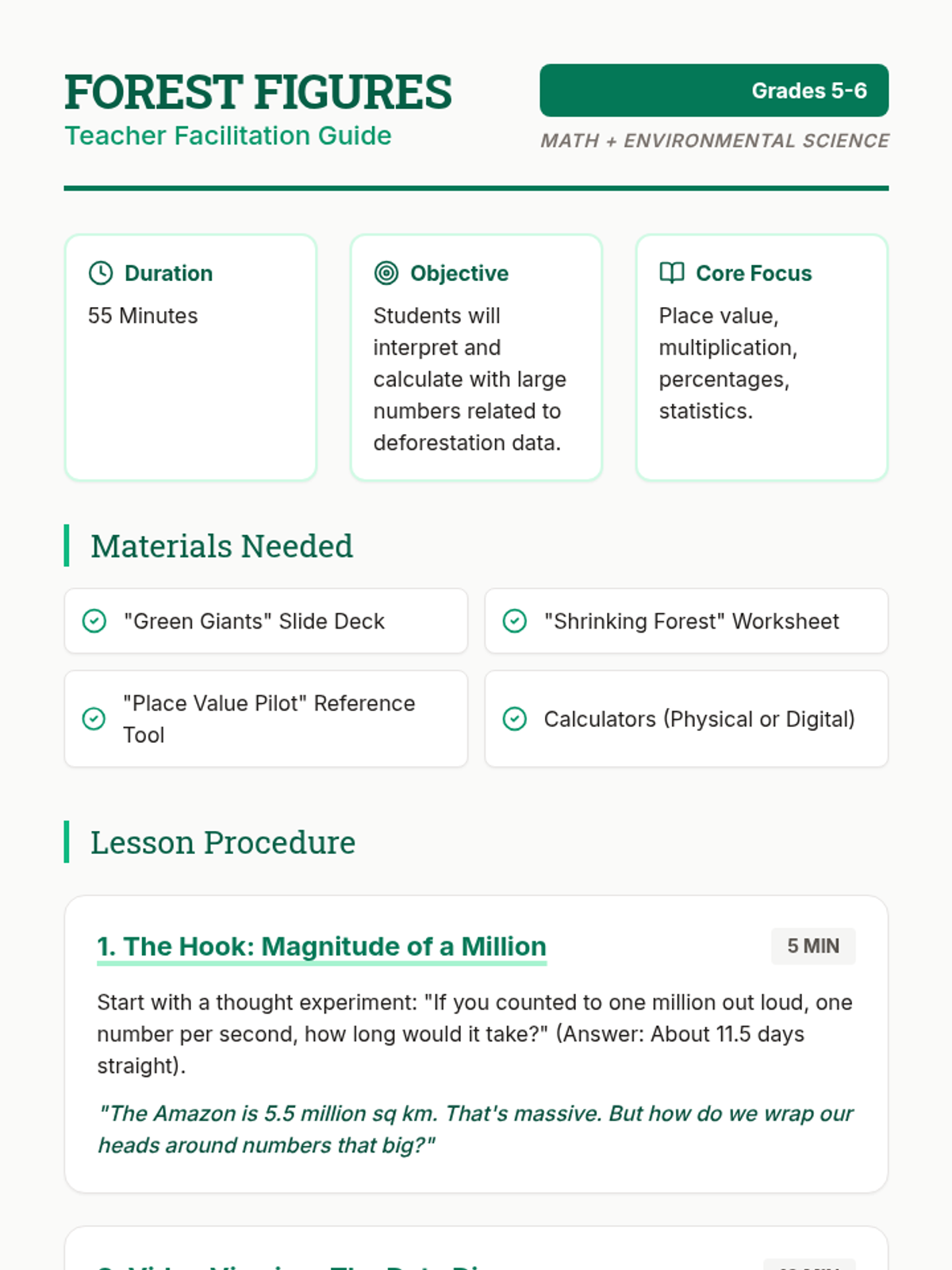 A math-integrated lesson exploring the magnitude of the Amazon rainforest and the statistical impact of deforestation using large numbers and percentages.